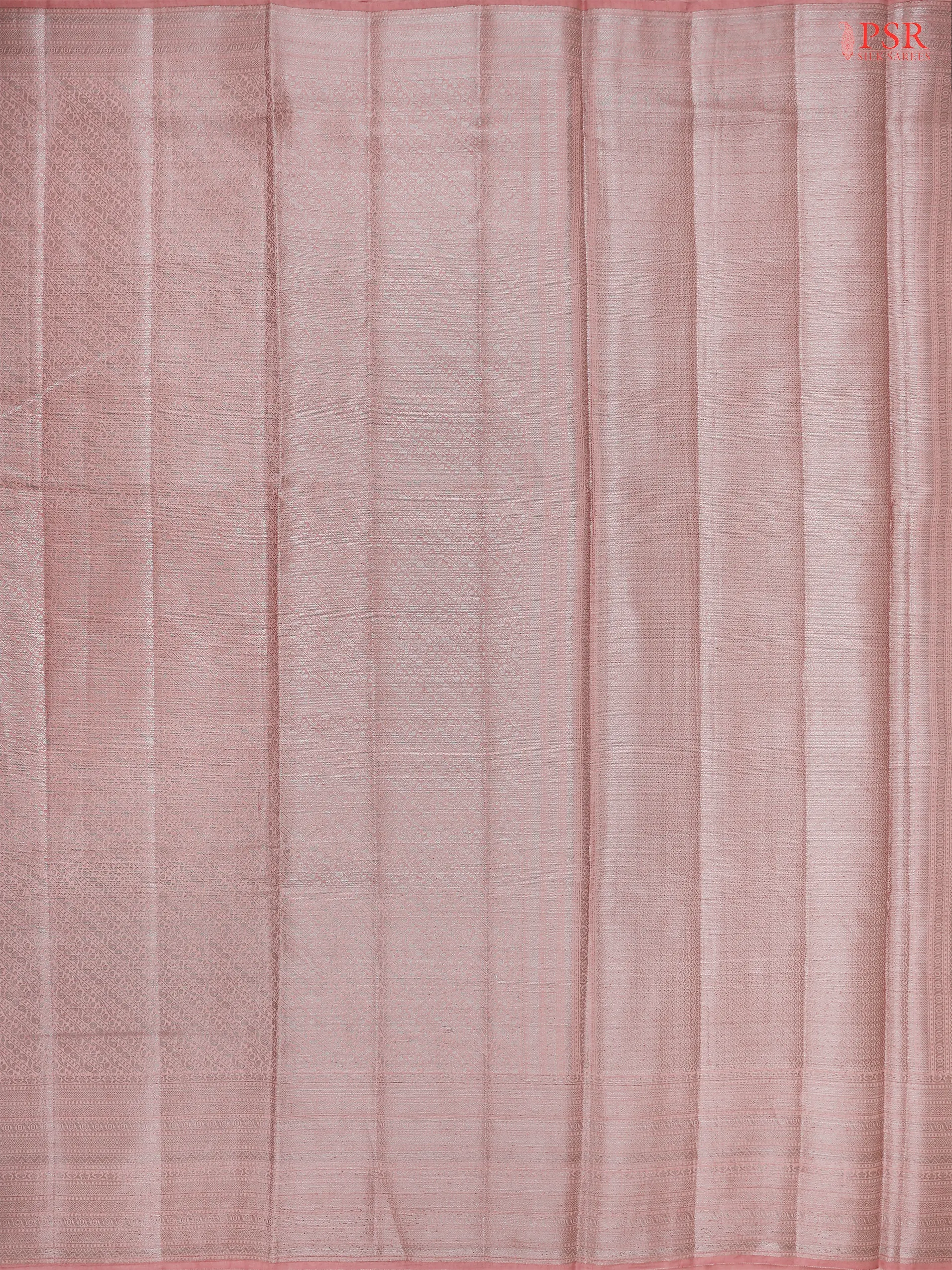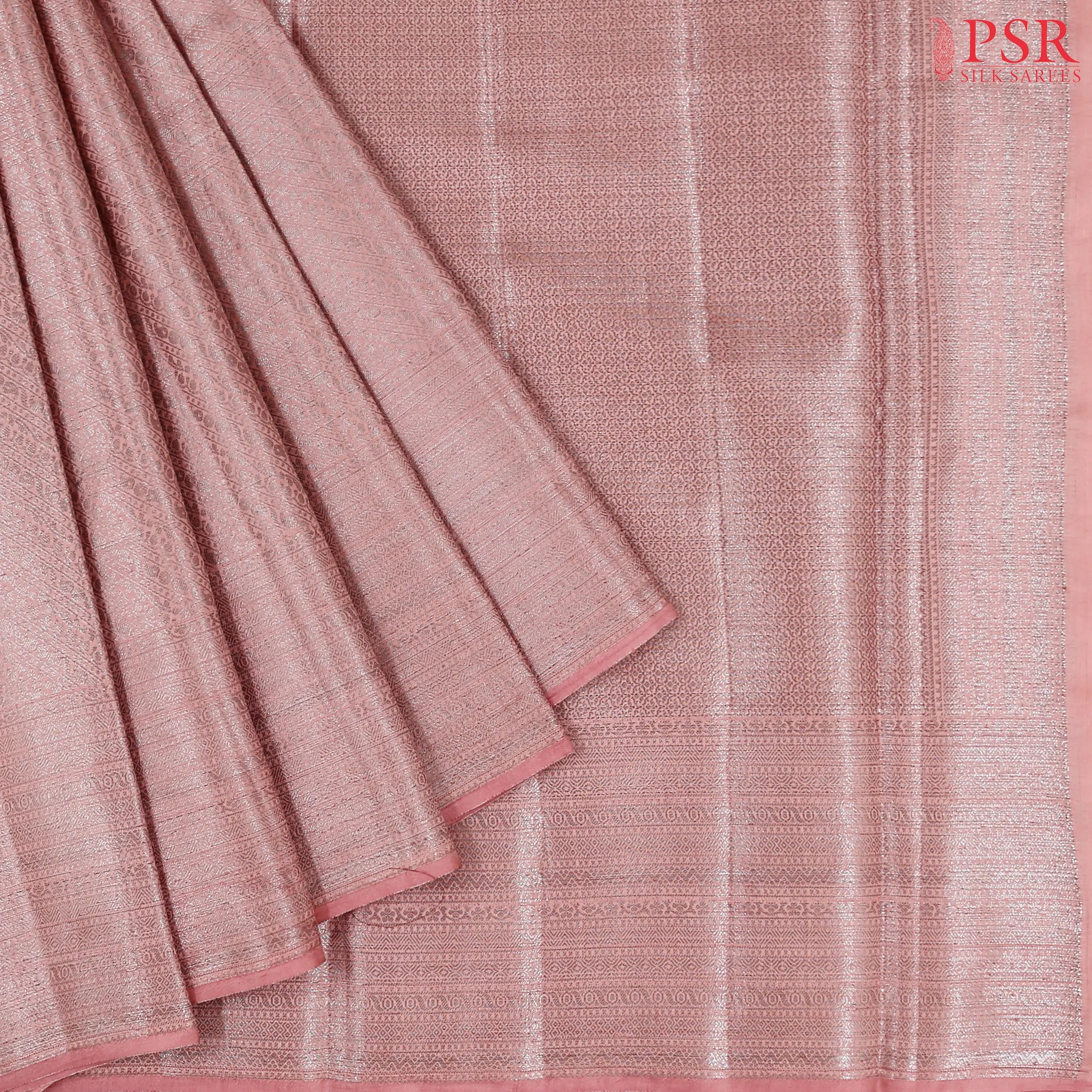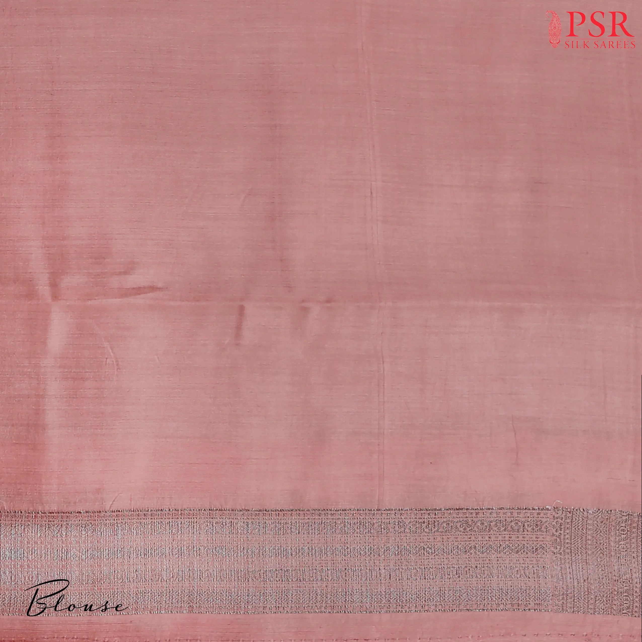 Indulge in subtle sophistication with PSR Silk Sarees’ Onion Peach Chiniya Silk Saree. The saree is beautifully adorned with beautiful zari jacquard work, adding a touch of color and festivity to its refined charm.