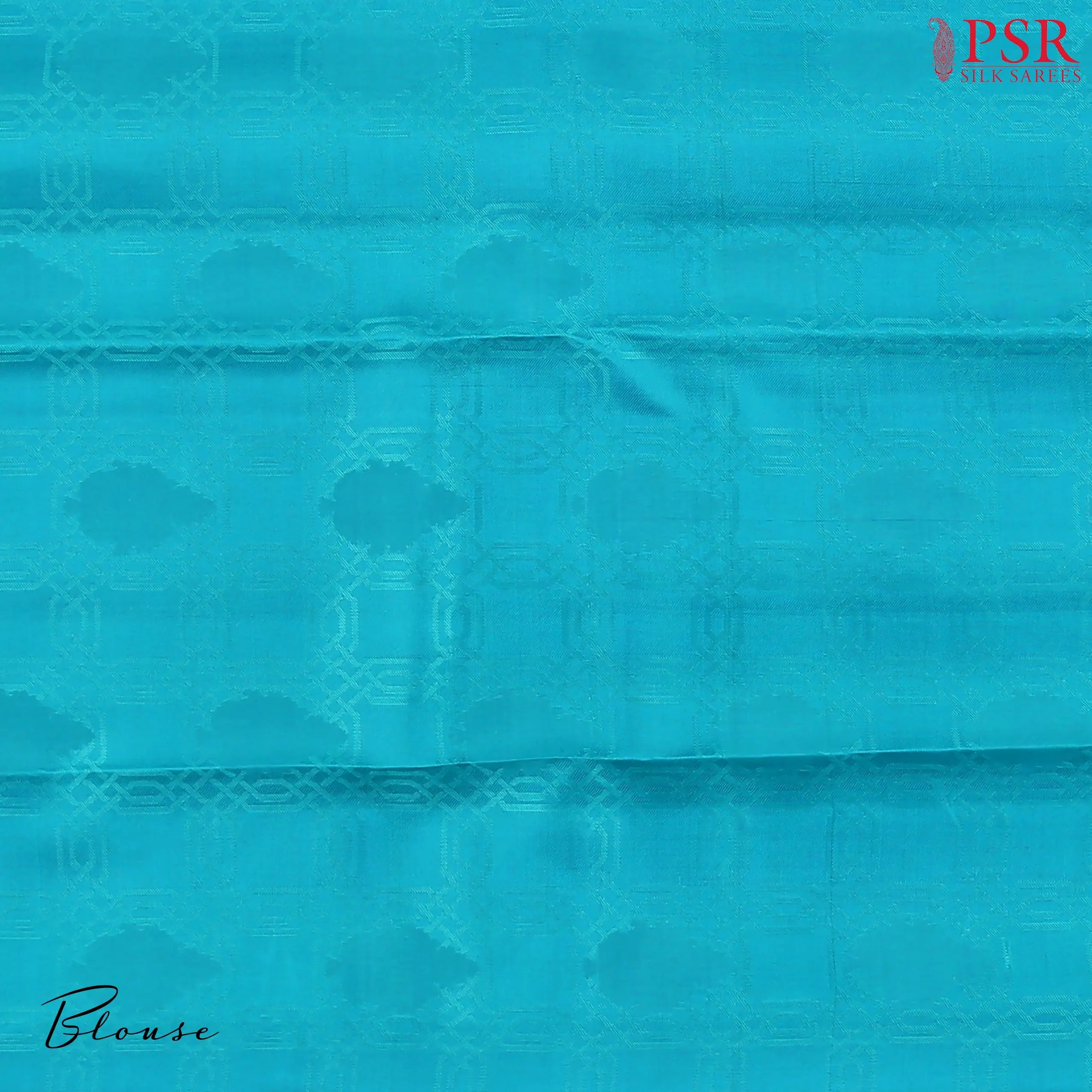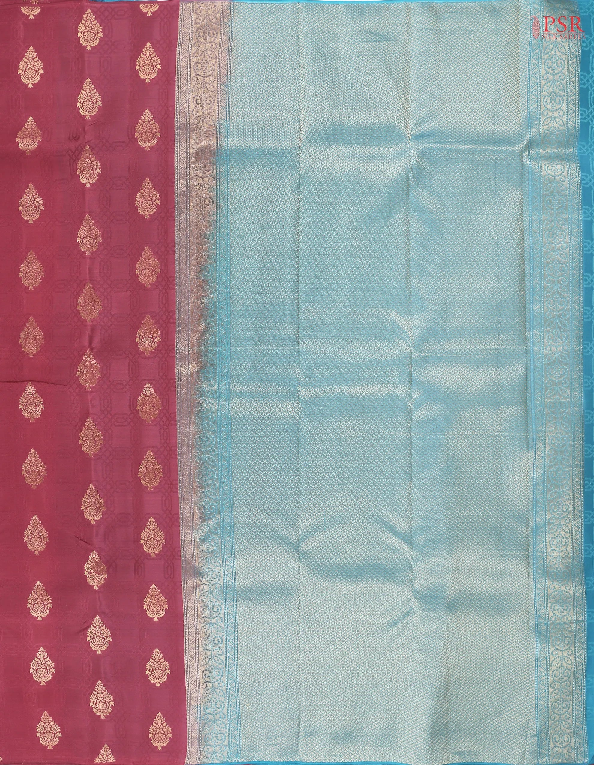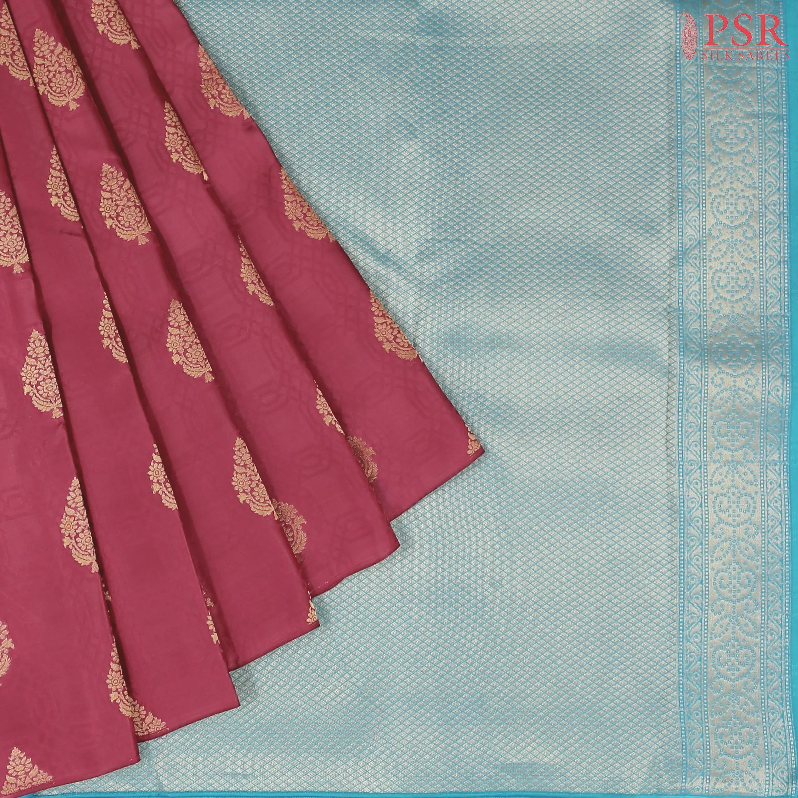 PSR Silk Sarees presents an Onion Pink colored Fancy Kanchipuram Silk with combinaion of Cyan Blue color.