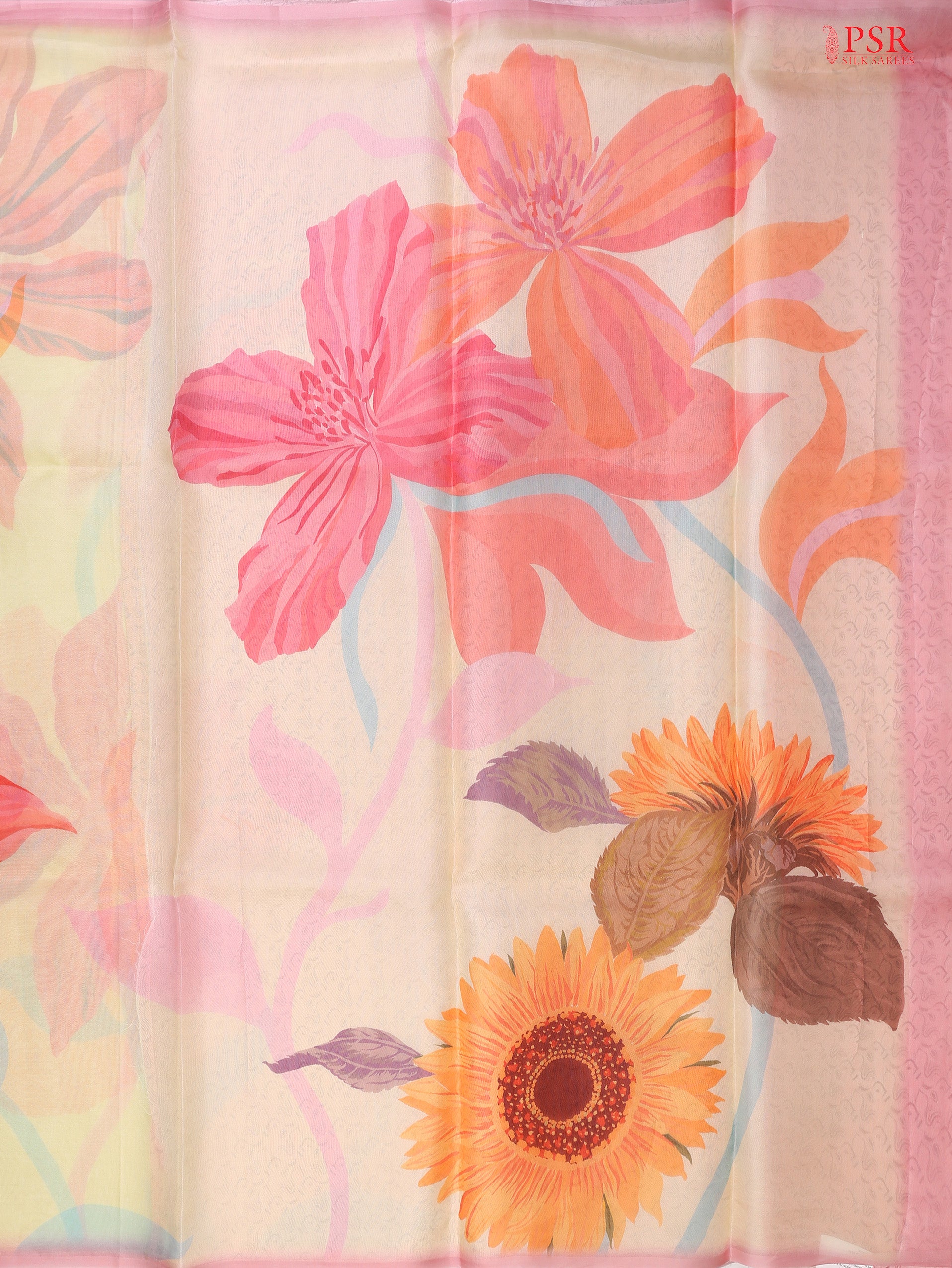 Embrace the delicate charm of PSR Silks' Light Lemon Yellow Transparent Organza saree, paired gracefully with a soft Light Pink hue. This enchanting saree is adorned with vibrant floral prints on the body and pallu, radiating elegance and a touch of nature-inspired beauty. Accompanied by a stylish Light Pink printed blouse, this saree is perfect for daytime celebrations, festive occasions, and garden parties. Lightweight and effortlessly graceful, it's the ideal choice for those who love a blend of sophistication and contemporary charm!