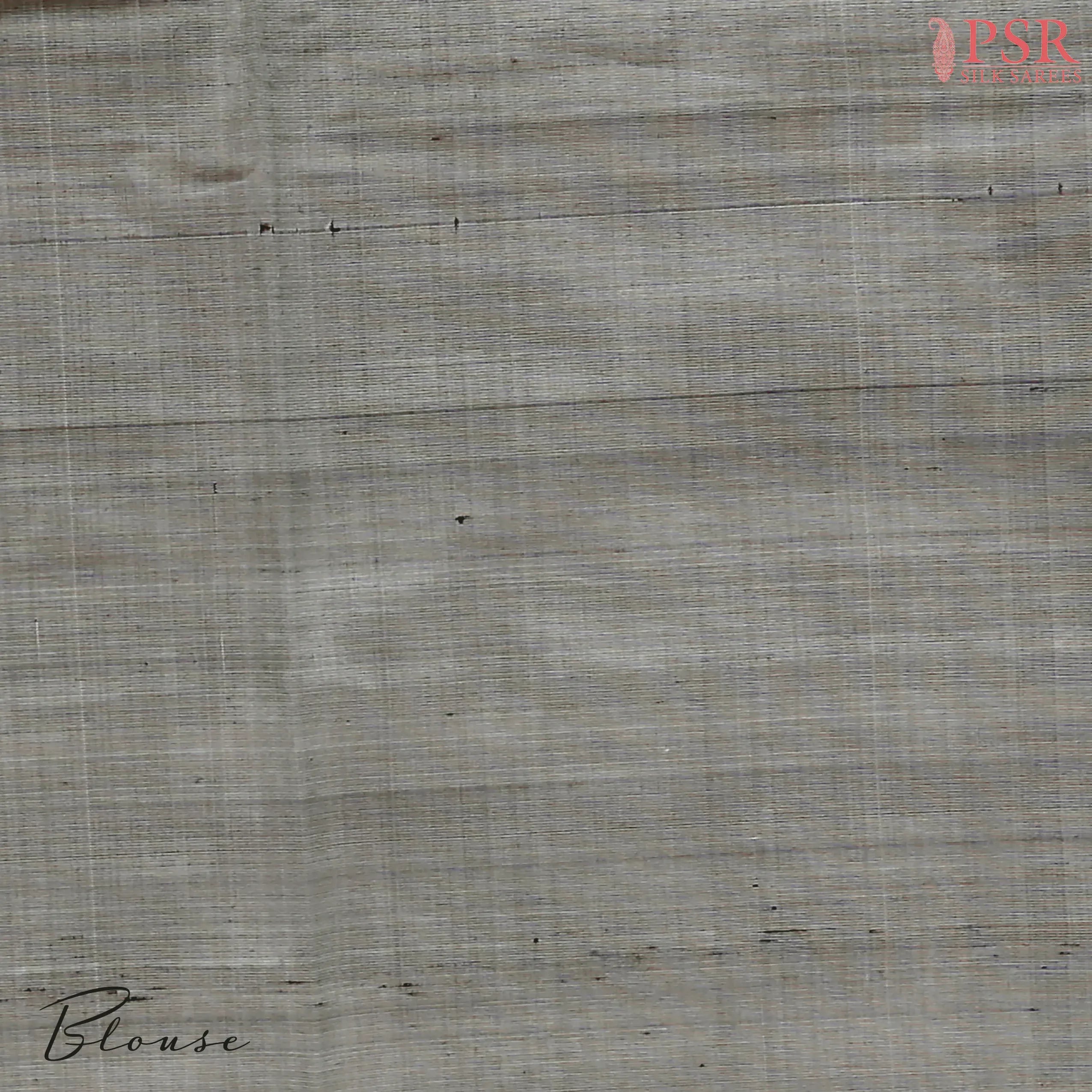 It is complemented by a Dark Grey pallu adorned with thread stripes and silver zari accents, enhancing the saree’s contemporary elegance. The ensemble is completed with a plain Dark Grey blouse, ensuring a perfectly balanced and polished look.