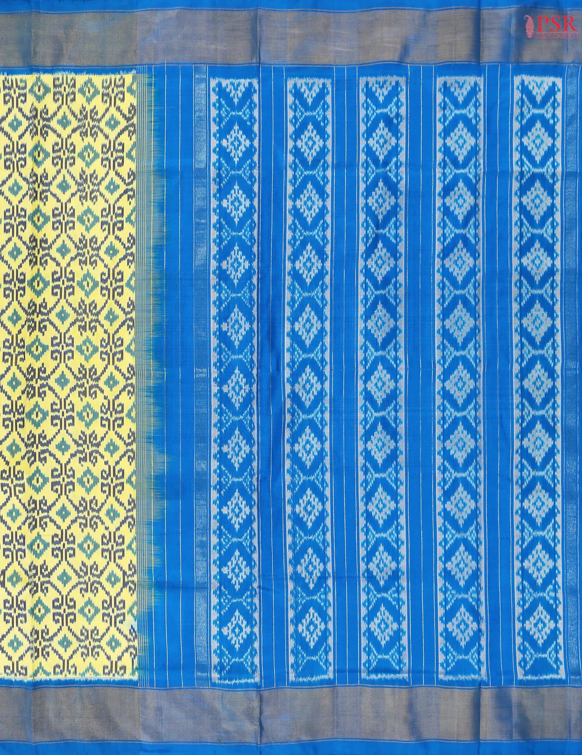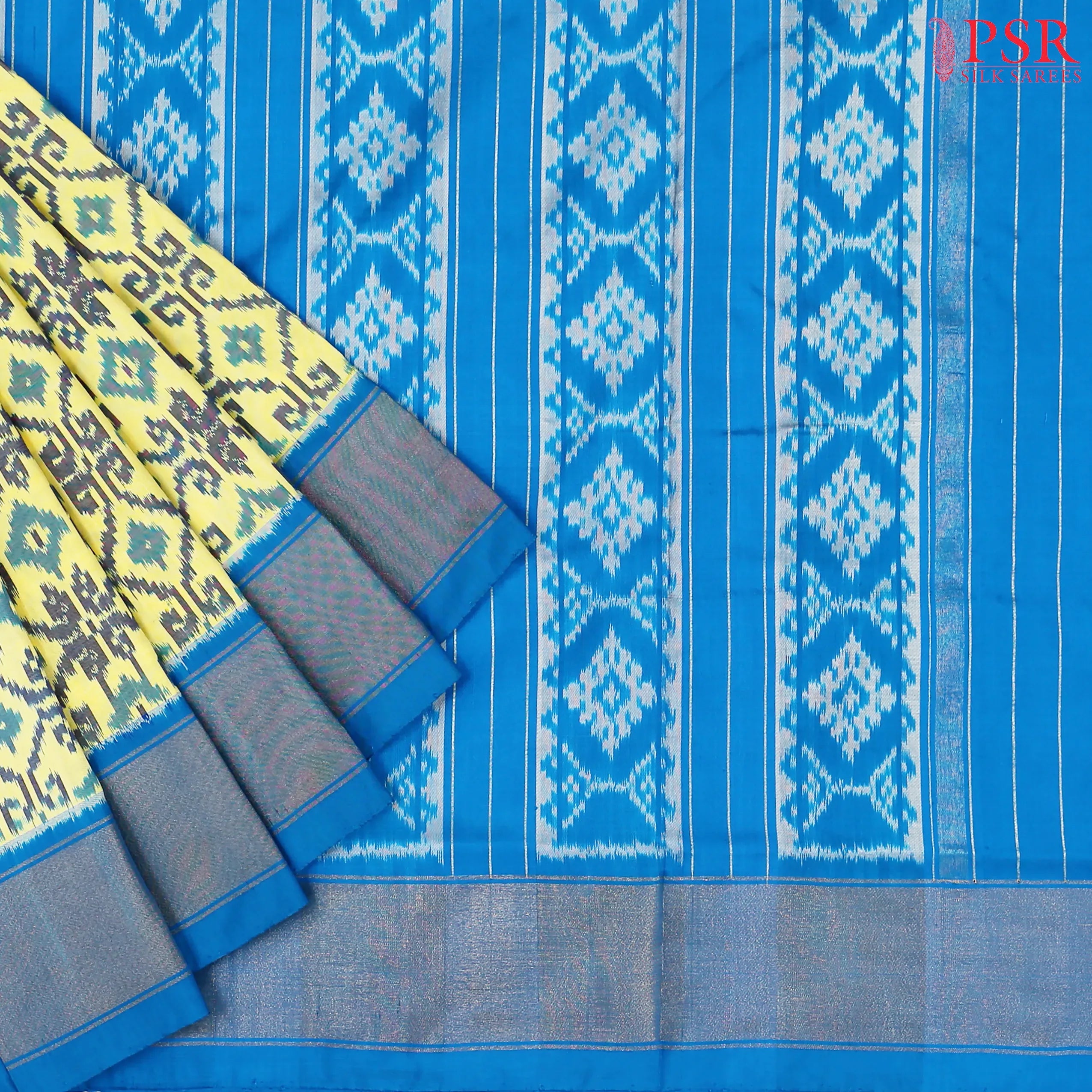 This Parchment Yellow & Azure Blue Pochampally Silk Saree from PSR Silk Sarees is a stunning embodiment of heritage and vibrance.