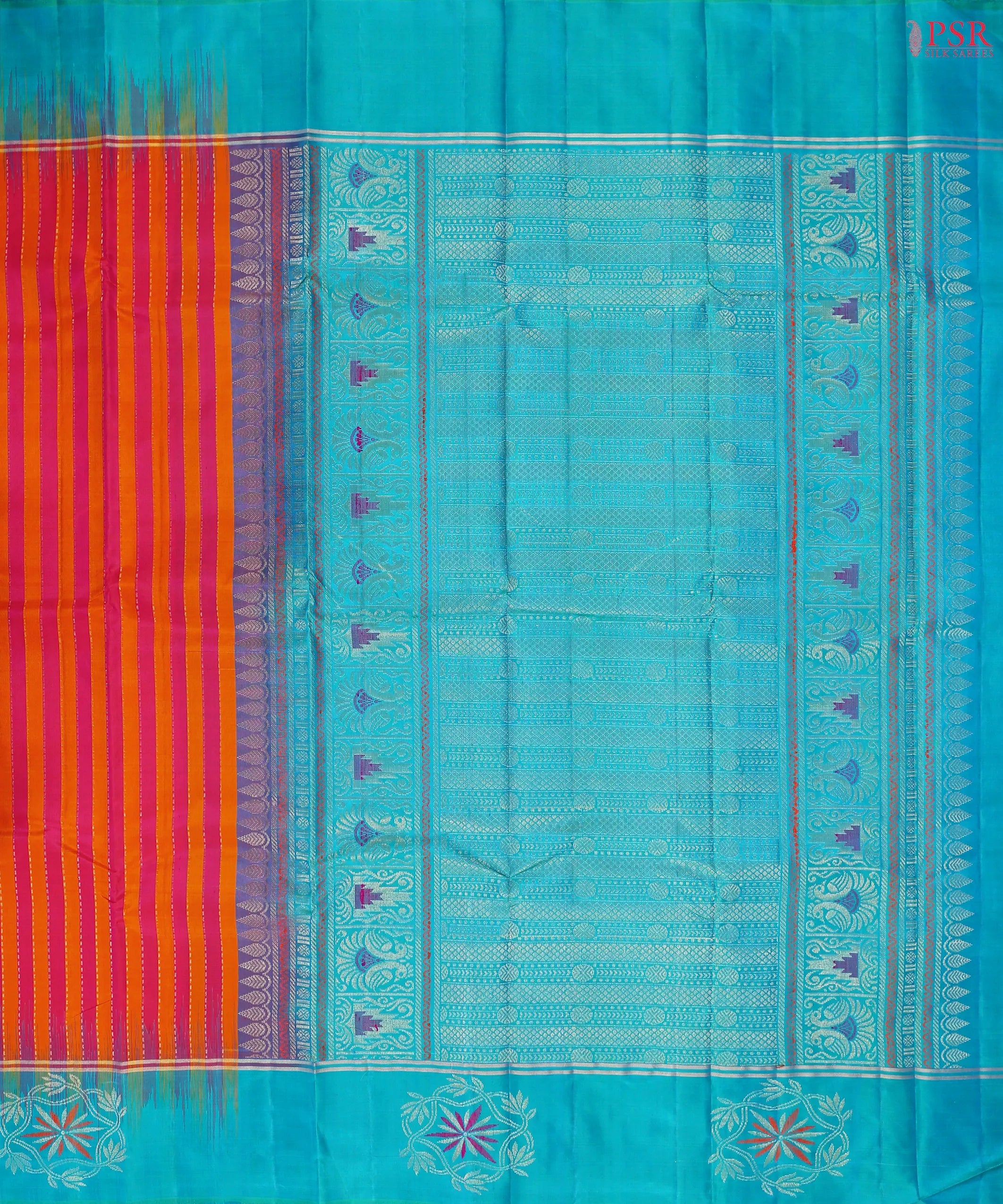 PSR Silk Sarees presents a Pink & Orange colored Fancy Kanchipuram Silk with combinaion of Cyan Blue color.