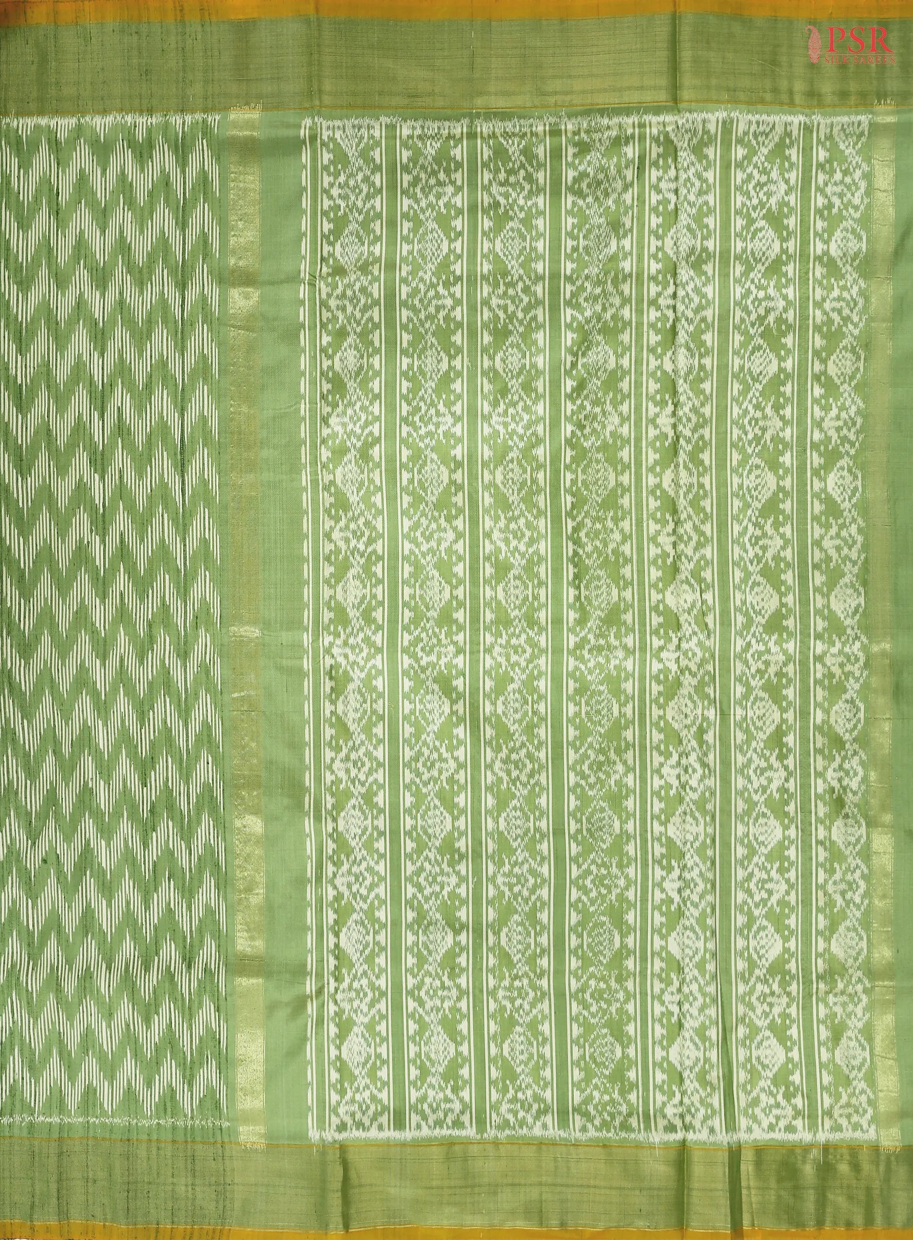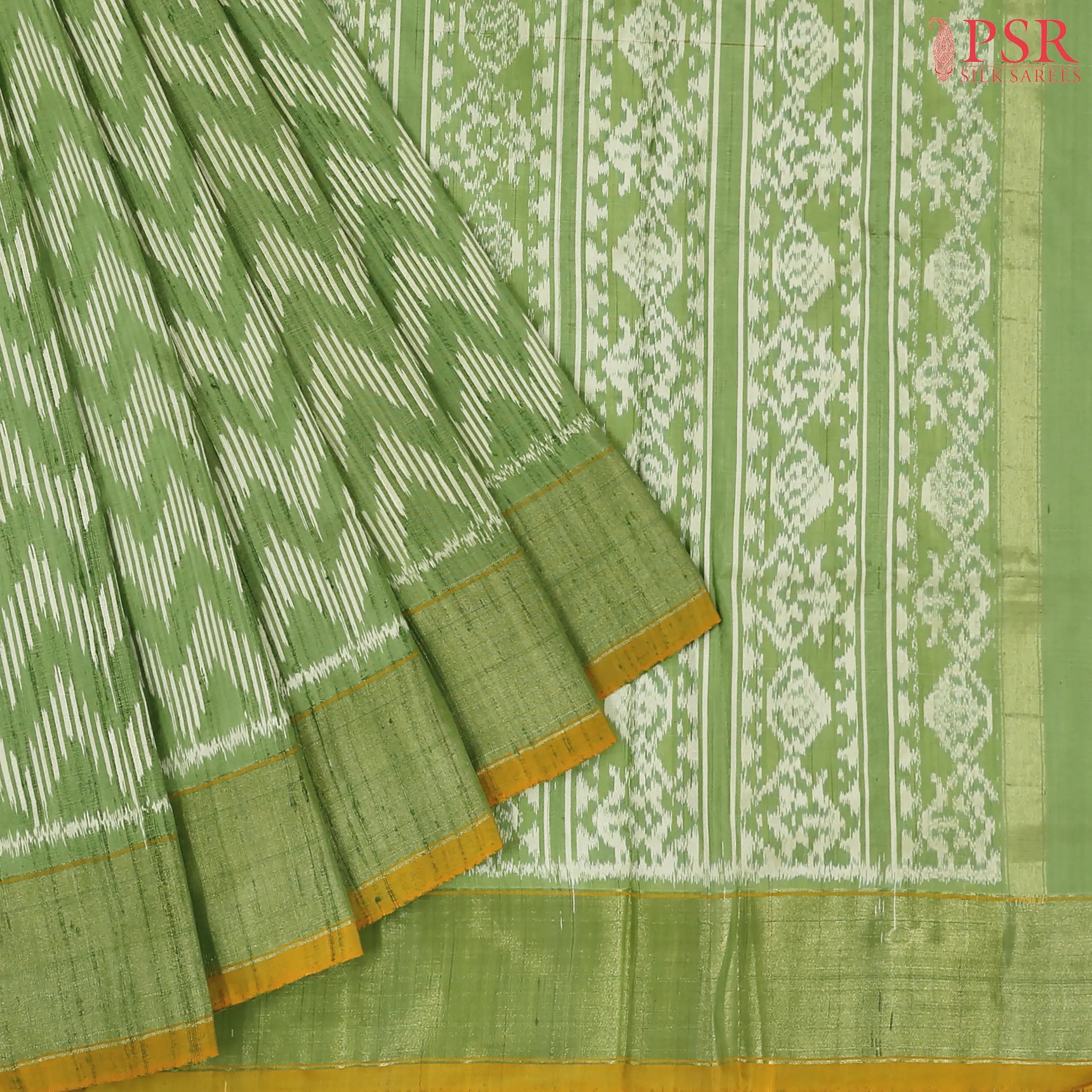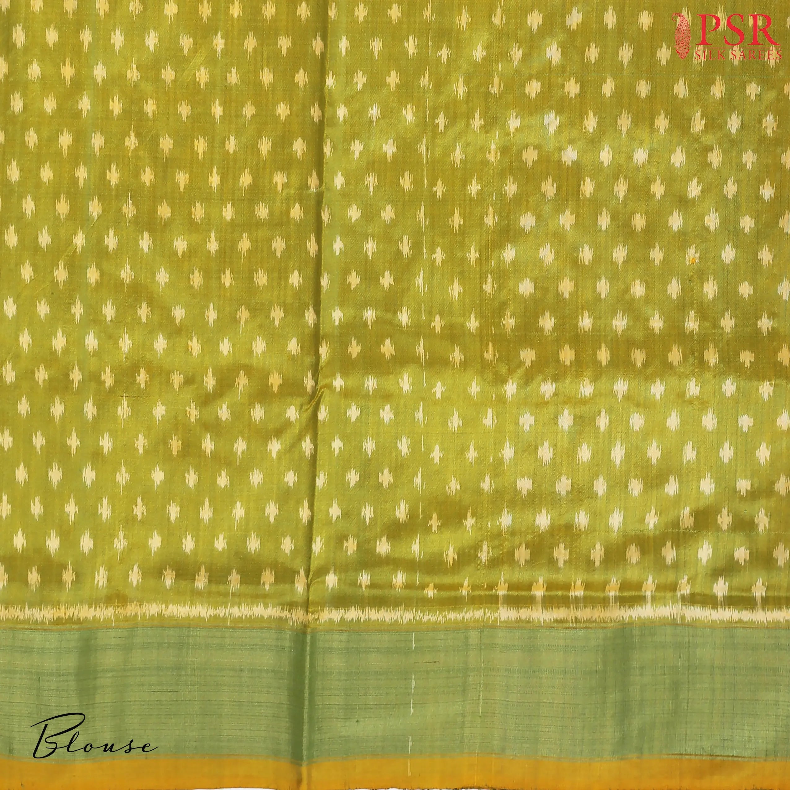 PSR Silk Sarees presents a graceful Pistachio Green colored Pochampally Silk saree, exquisitely woven with a mix of jute threads for a rich texture. The saree features an elegant chevron pattern in traditional Ikat weaves, creating a striking visual appeal. A matching pallu adorned with Ikat artistry enhances its charm, while the plain tissue border adds a subtle touch of sophistication. This masterpiece is paired with an Olive colored Pochampally Silk blouse enriched with Ikat weaves for a perfect contrast.