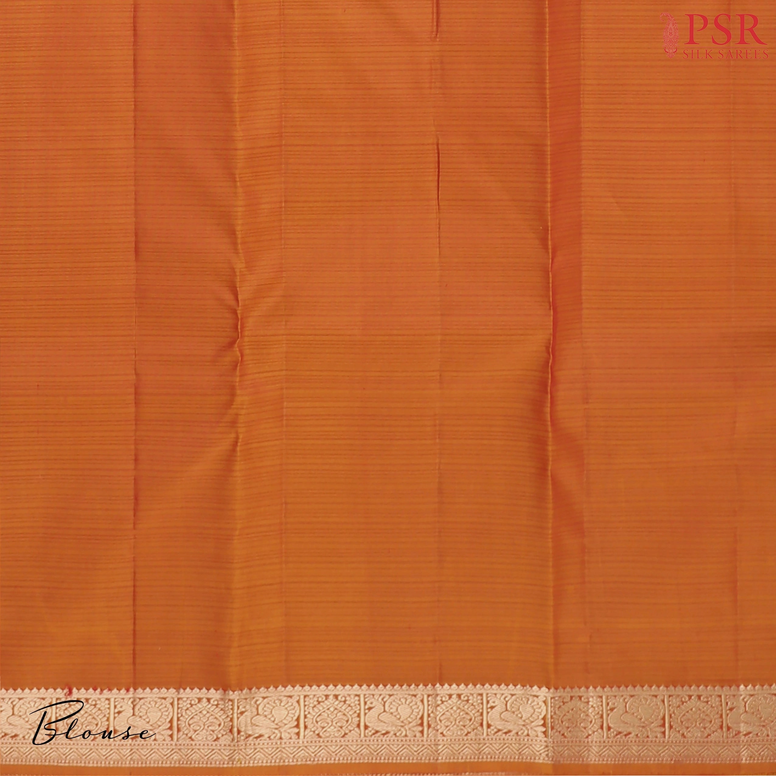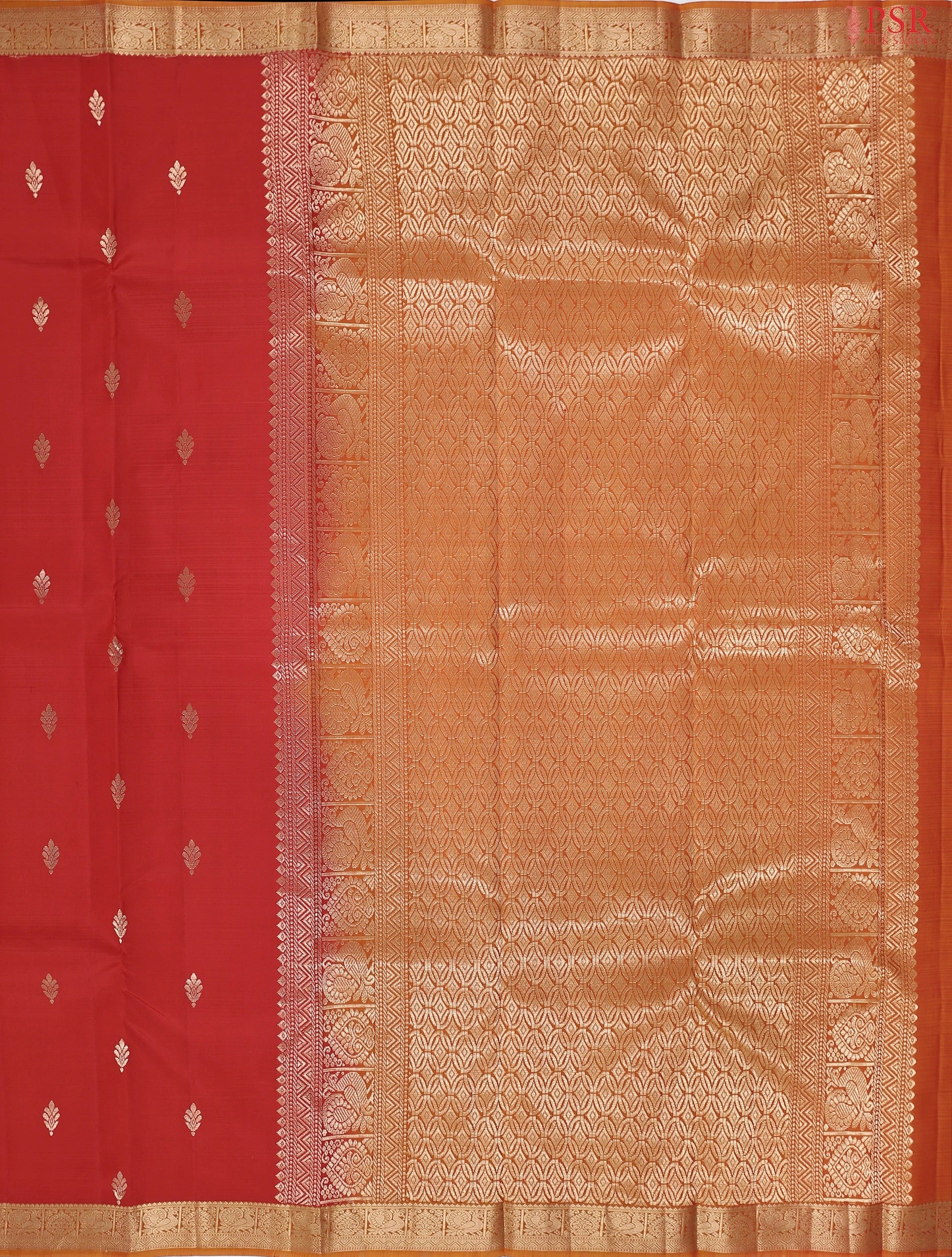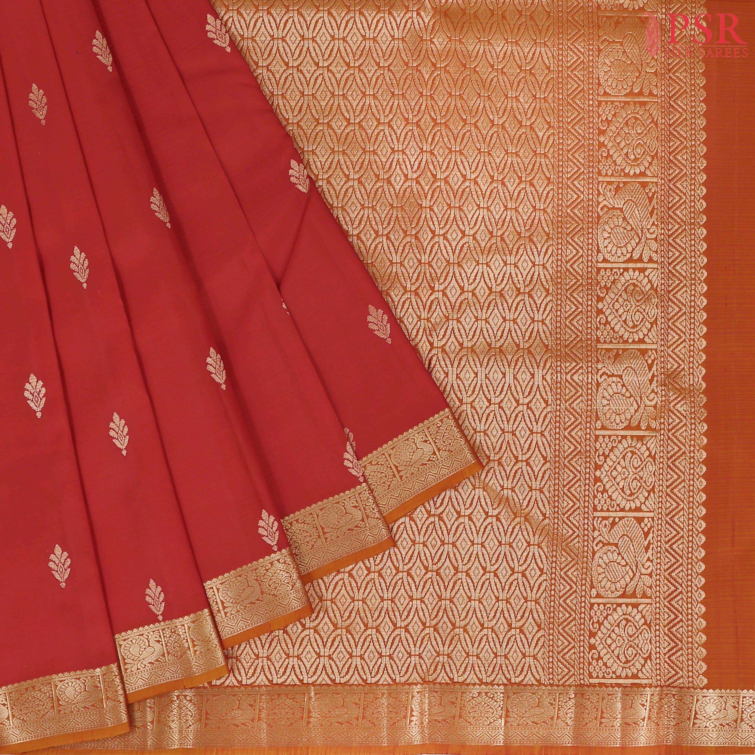 PSR Silk Sarees presents a Carmine Red colored Fancy Kanchipuram Silk with combination of Dark Orange.