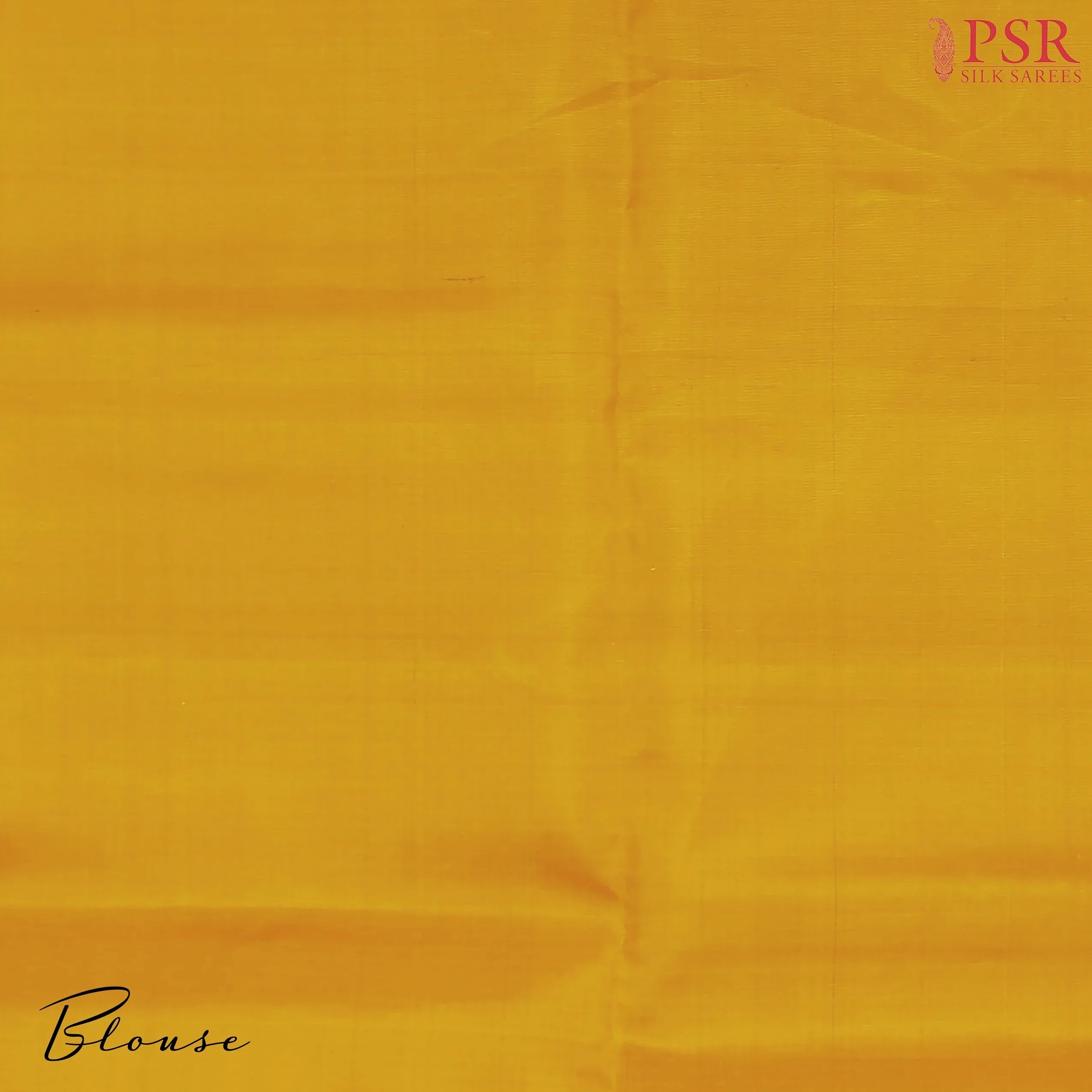 Crafted in a traditional design, it is completed with a Golden Yellow pallu adorned with traditional zari work with simple border & plain blouse.