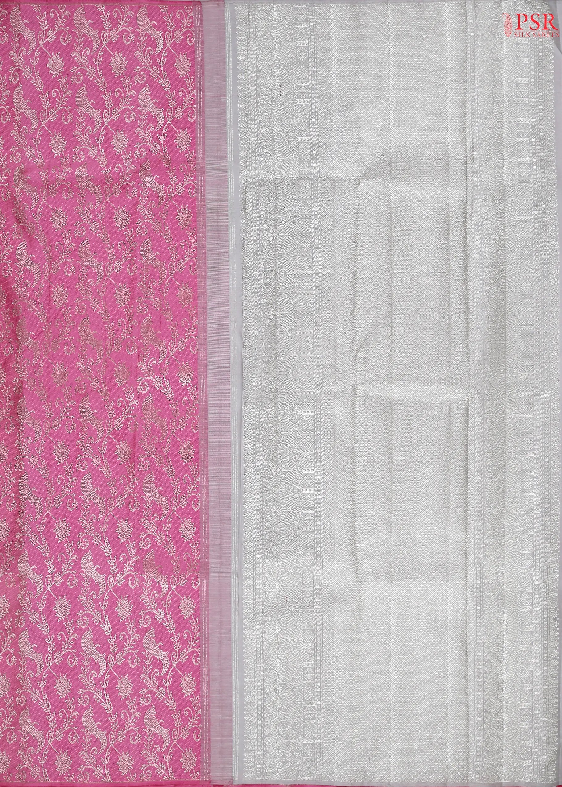 PSR Silk Sarees proudly presents a stunning Taffy Pink Kanchipuram Silk Saree from our exclusive “Vaichitraya Kanjivaram” collection. Paired with a graceful Light Grape Mist Grey contrast, this saree is a true statement of tradition blended with modern elegance.