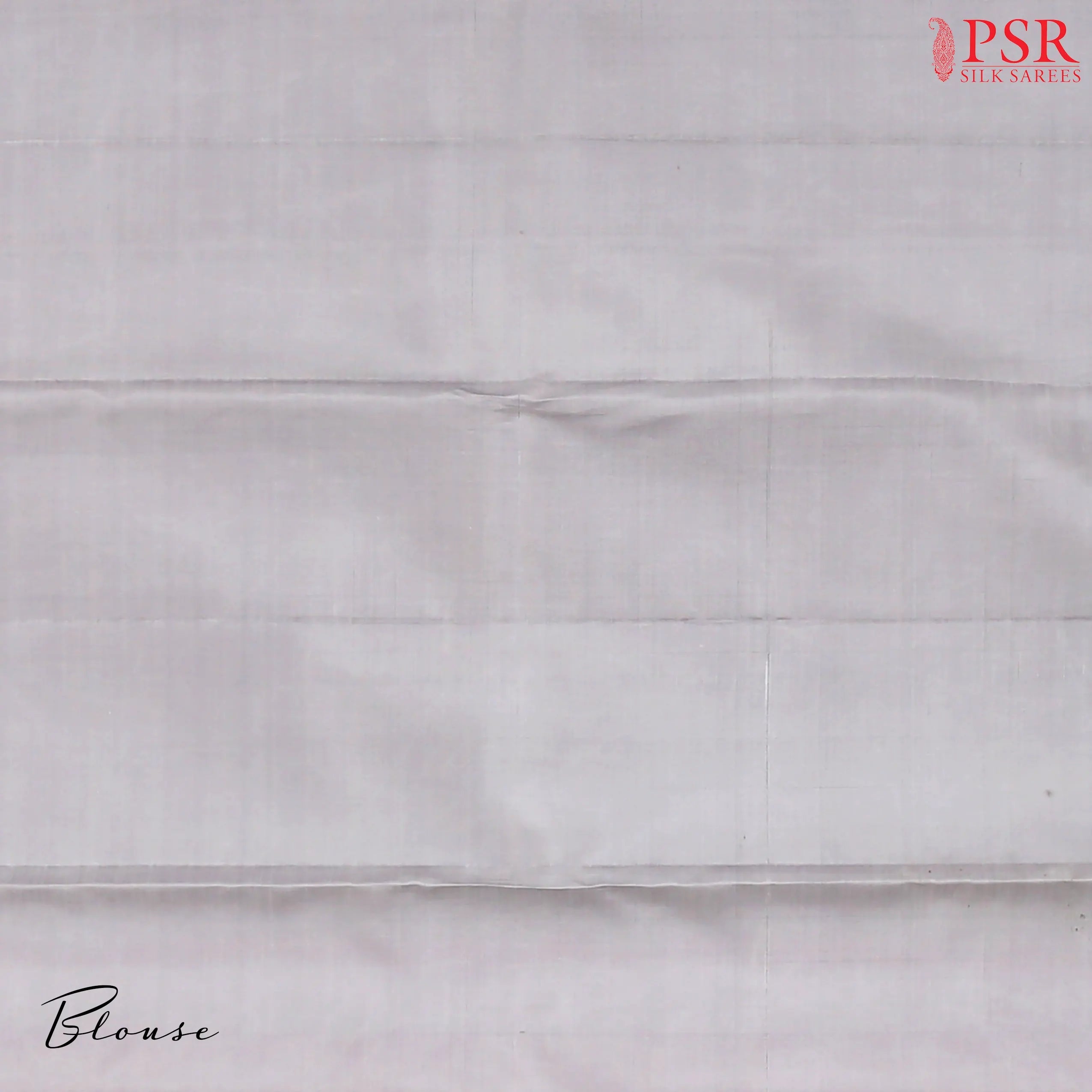 The borderless design enhances its charm, featuring intricate silver zari scroll floral jacquard weaves that sparkle with sophistication. The saree is further elevated with a Light Grape Mist Grey pallu, richly adorned in traditional silver zari craftsmanship, and completed with a matching plain Light Grape Mist Grey blouse for a balanced yet luxurious finish.