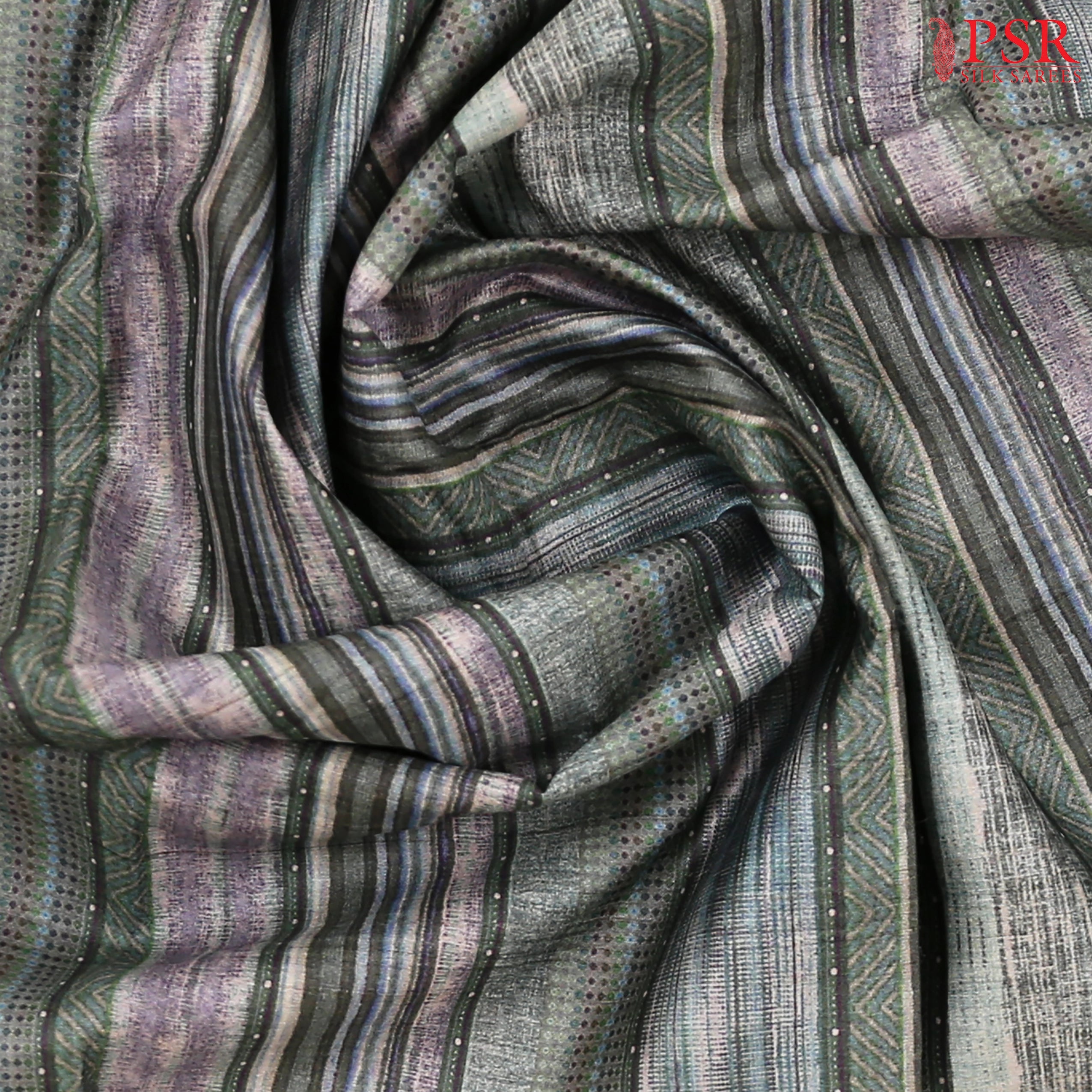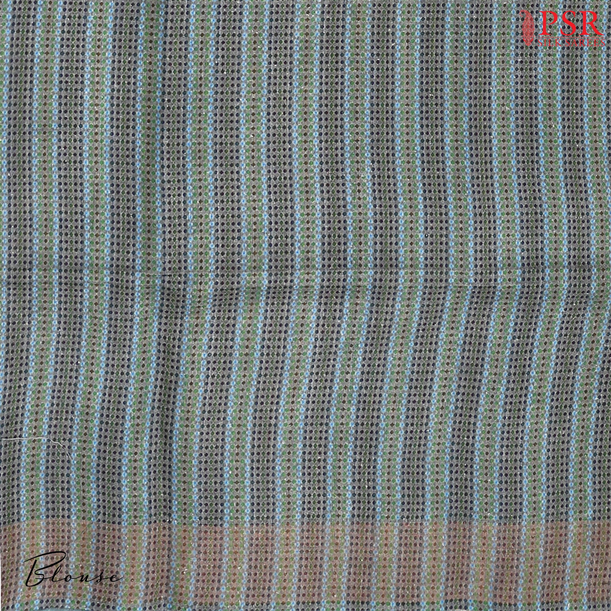 This stunning saree showcases a designer multicolor stripes pattern, adding a vibrant yet refined touch to the rich teal base. The matching pallu is adorned with elegant zari stripe detailing that enhances its traditional appeal. Finished with a plain tissue border for a subtle shimmer, the saree is paired with a matching printed blouse, completing the look with effortless sophistication.