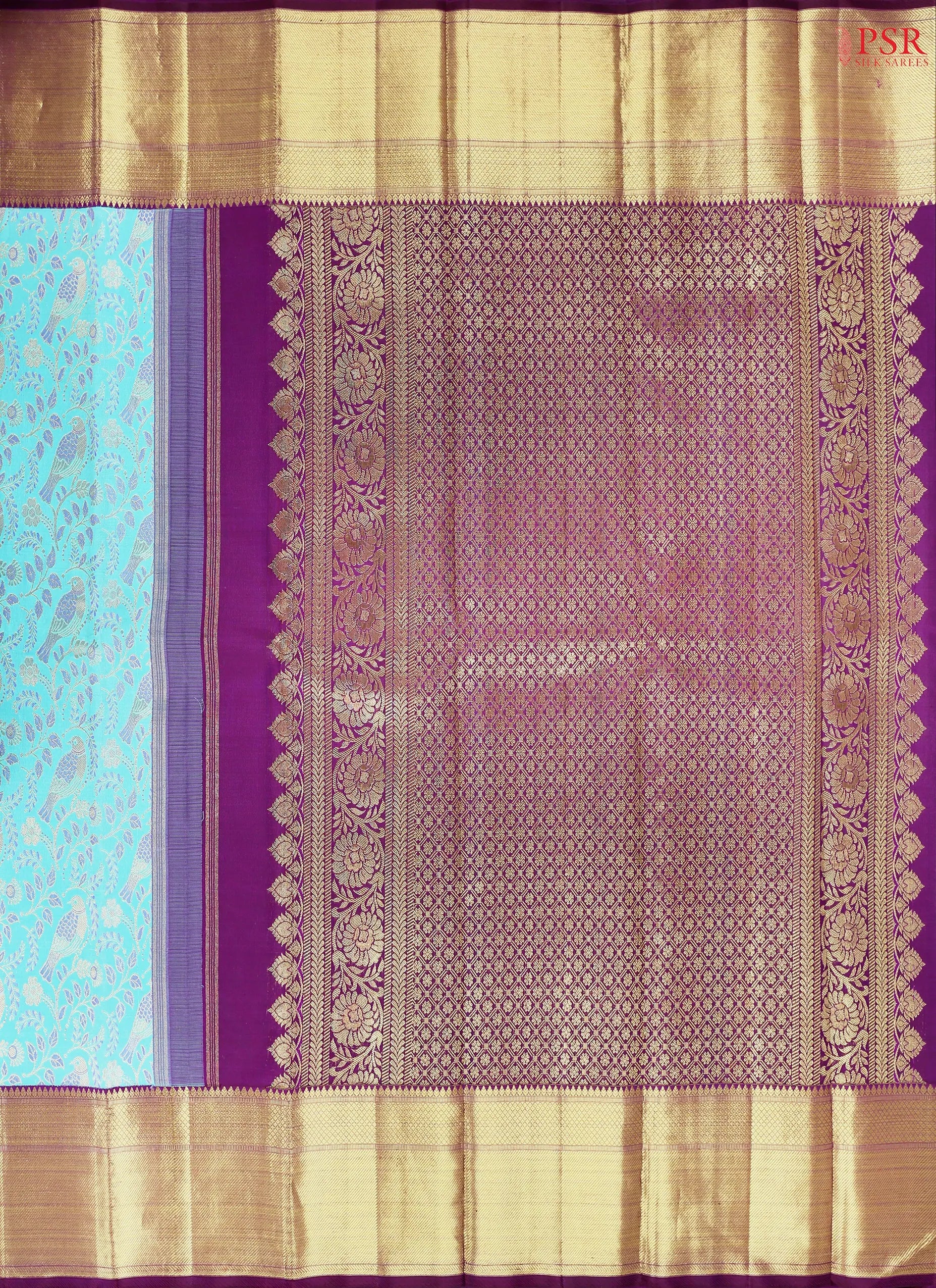 Step into your big day with regal elegance in this enchanting Turquoise Blue Kanchipuram Silk Saree, paired with a rich Tyrian Purple contrast, from the exclusive Bridal Kanjivaram collection by PSR Silk Sarees. The saree features exquisite scroll floral & bird weaves, symbolizing prosperity and grace—perfect for a bride's timeless charm.