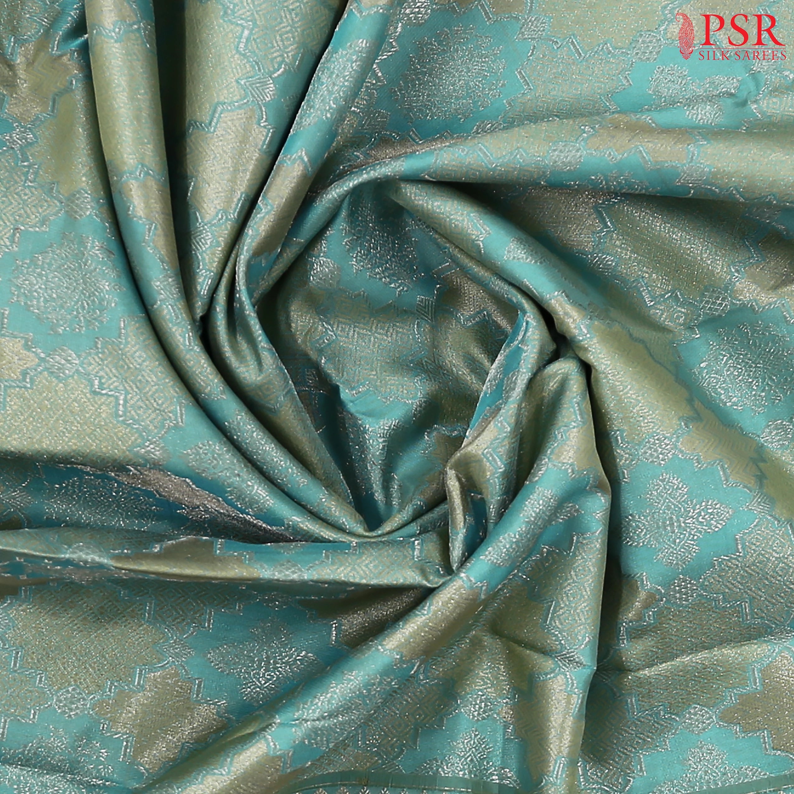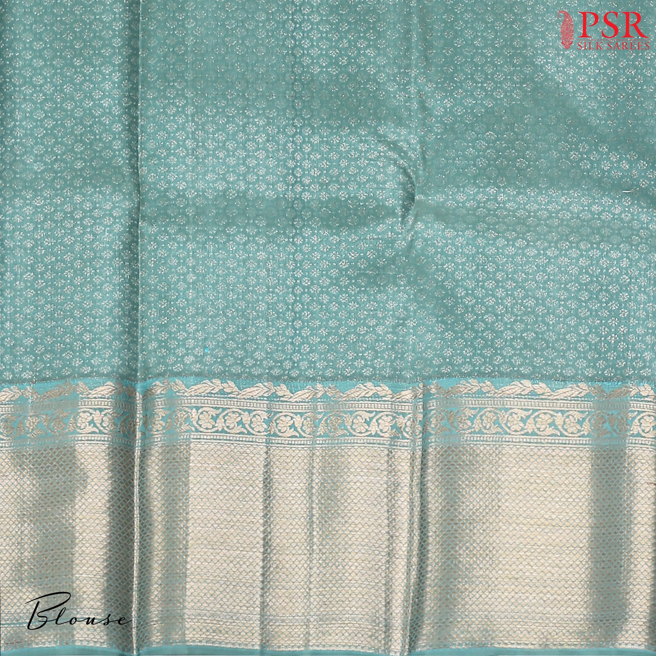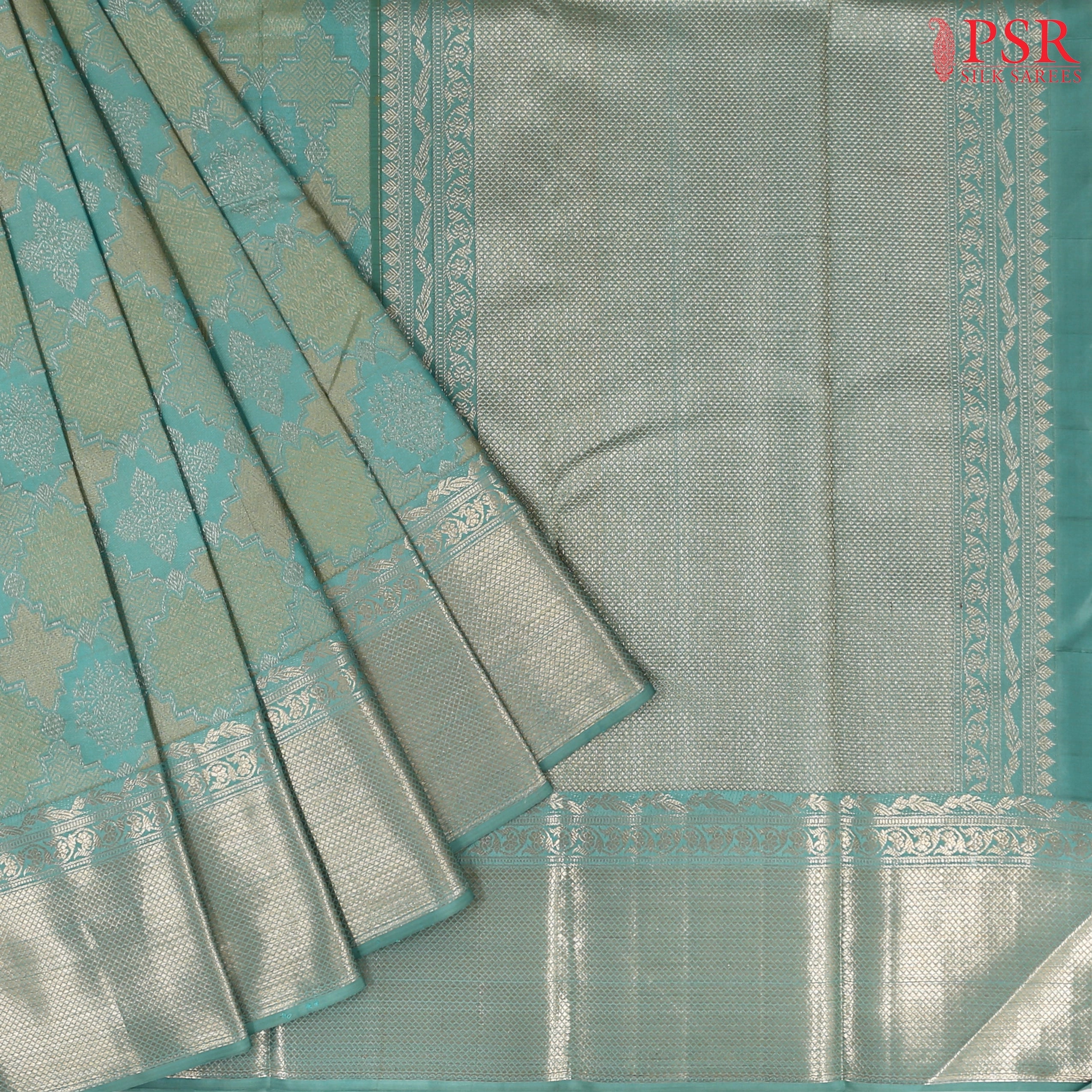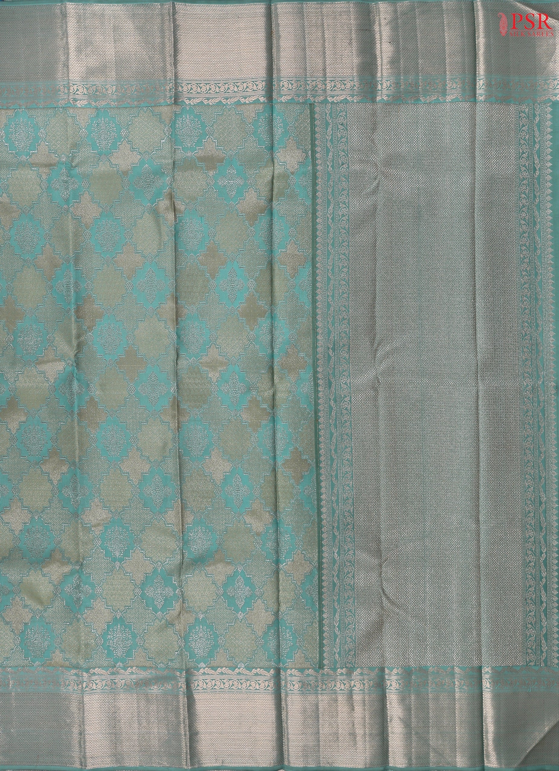 PSR Silk Sarees introduces an elegant Turquoise Blue Kanchipuram Silk Saree, featured in the graceful "Vaichitraya Kanjivaram" collection. This exquisite saree boasts impressive floral quatrefoil jacquard weaves that add a refined texture and luxurious feel. It is beautifully paired with a traditional zari work pallu and big border, and comes with a matching thread jacquard work blouse, enhancing its regal appeal.