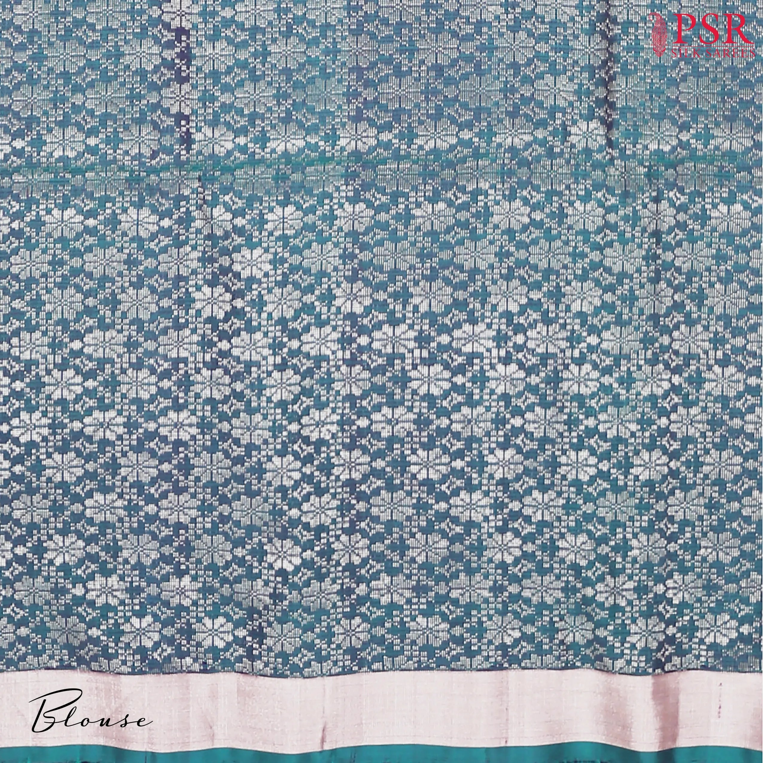 The saree features self-striped weaves enriched with copper and silver zari square jacquard motifs, adding depth and elegance. It is beautifully paired with a rich and traditional zari work Teal-colored pallu and border, while a Teal-colored designer zari jacquard blouse completes the ensemble with finesse.