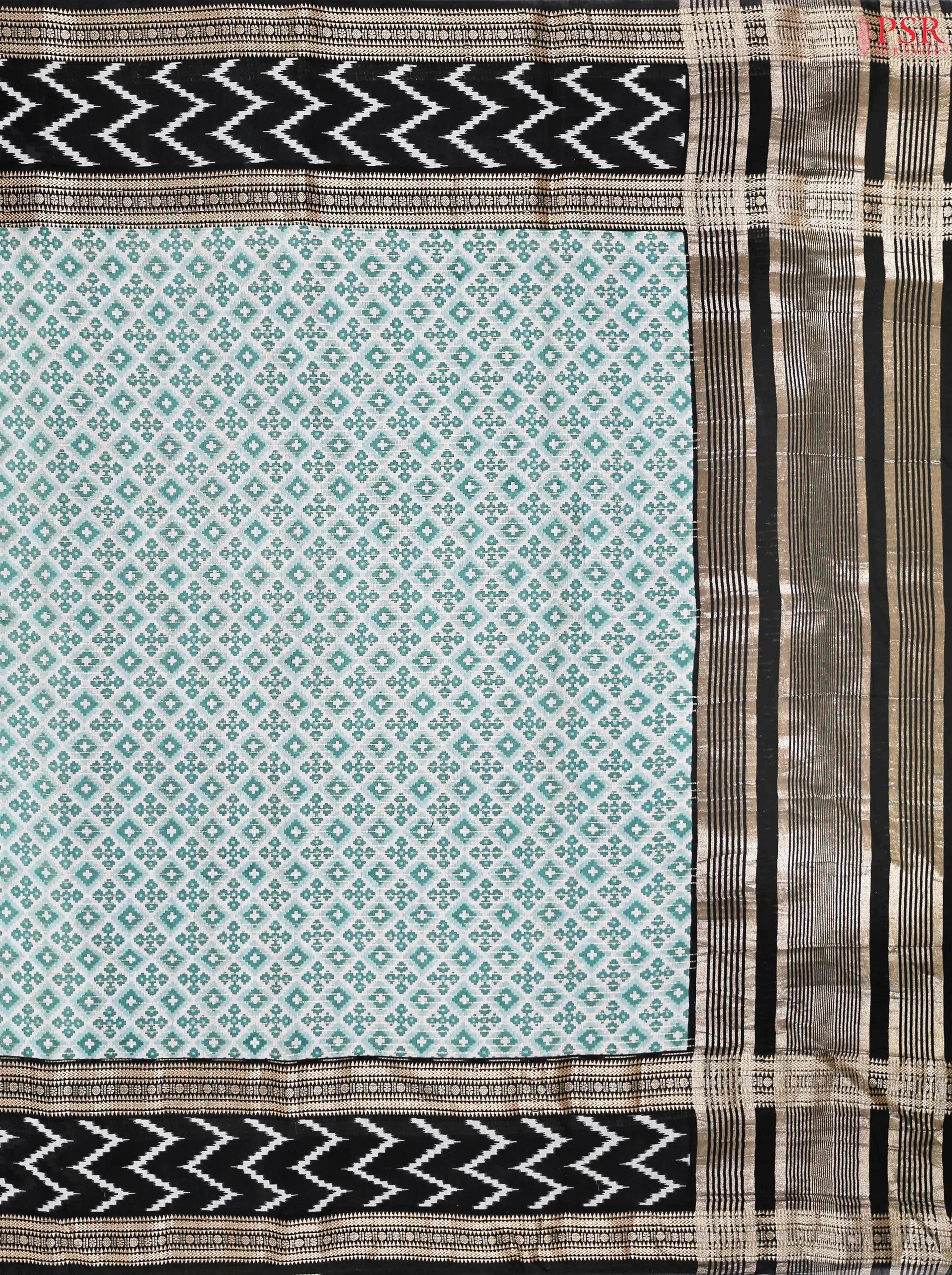 PSR Silk Sarees presents a White & Sea Green colored Assam Saree with combination of Black color.