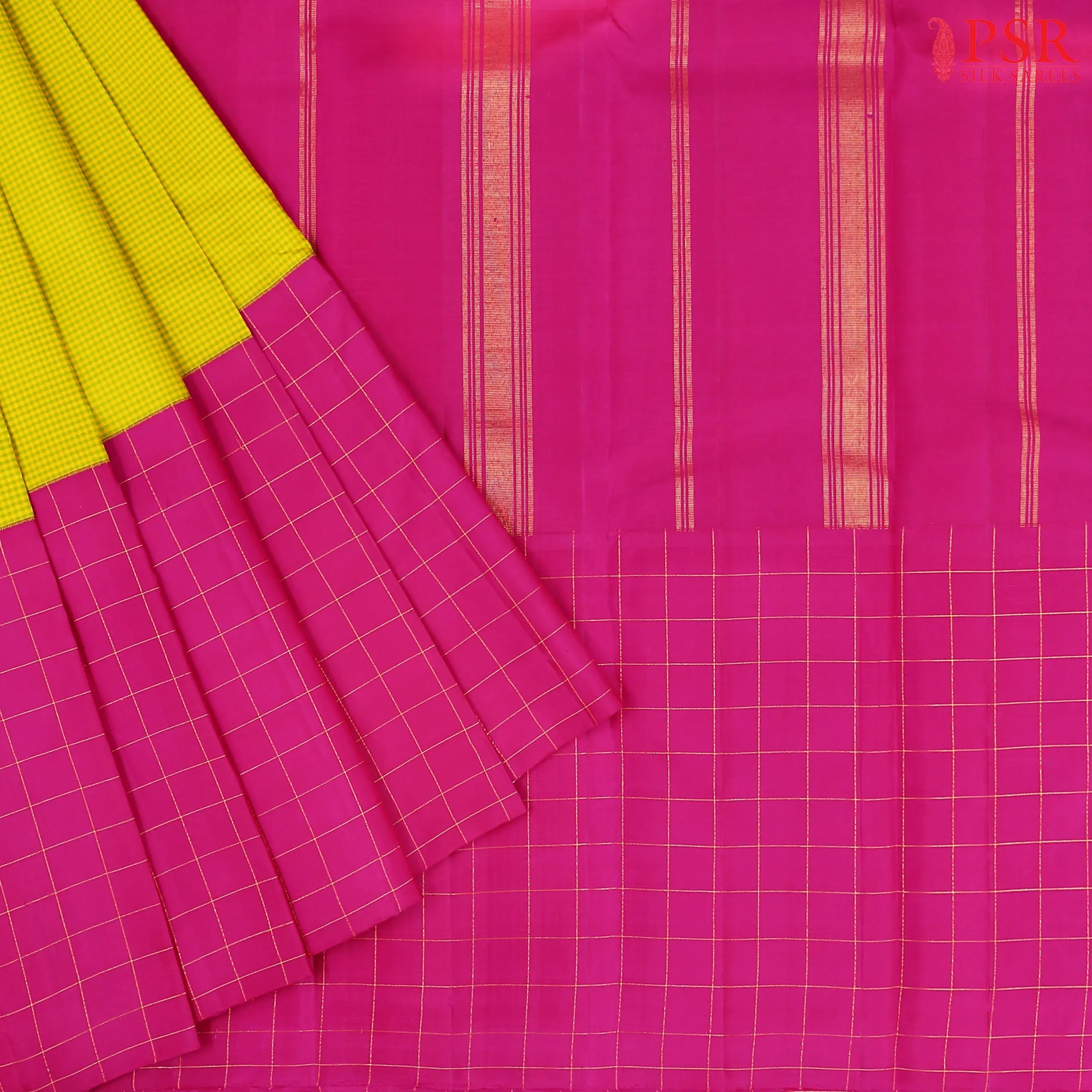 The saree features charming yellow and green–pink mini checks, adding a lively touch to its traditional appeal. A Magenta Pink zari chit pallu with a plain matching blouse further enhances its beauty. The highlight of this drape is the magnificent long Ganga-Jamuna Korvai border — with a Royal Blue top border adorned in zari stripes and a Magenta Pink bottom border embellished with zari checks, creating a regal dual-tone elegance.