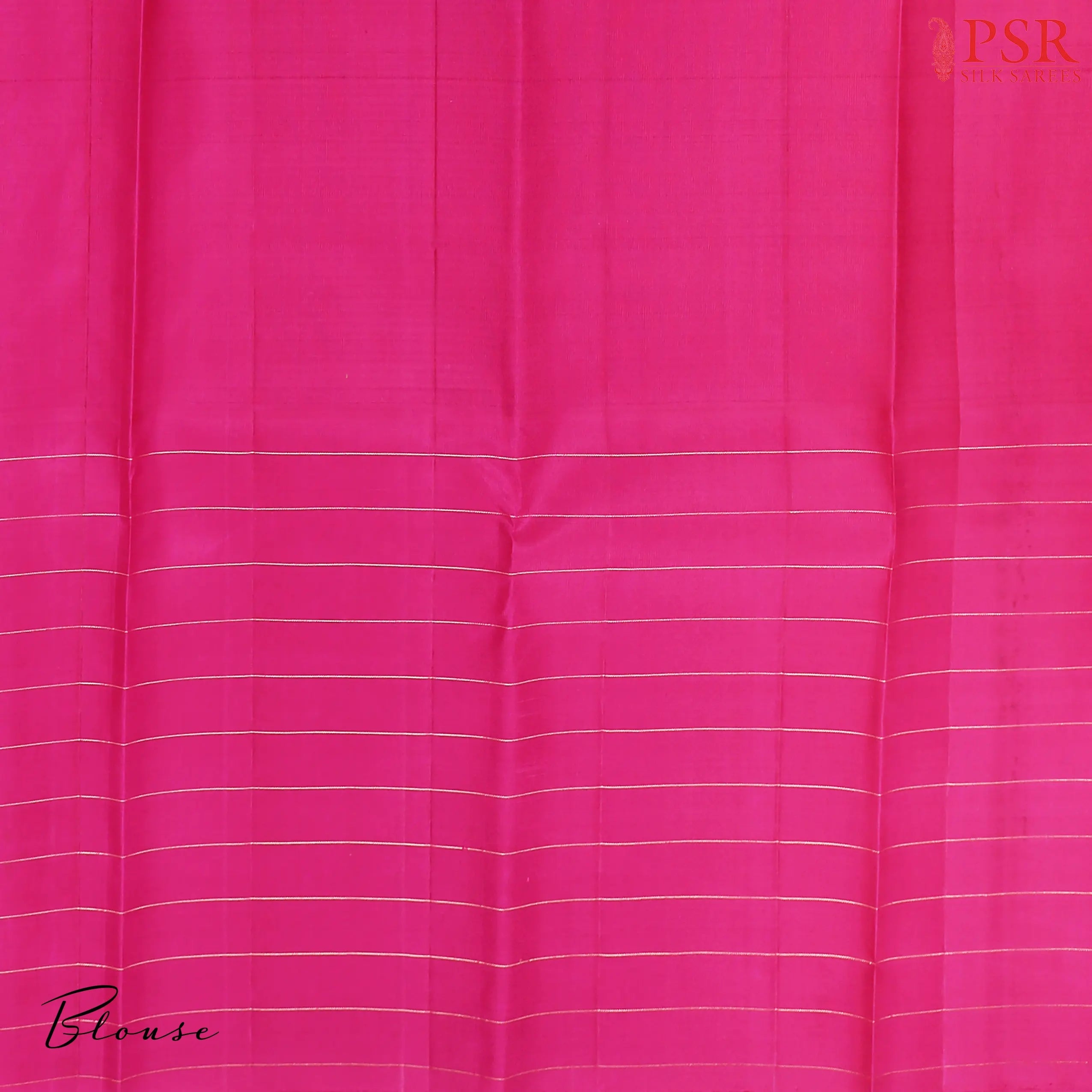 PSR Silk Sarees presents a vibrant Yellow Kanchipuram Ganga-Jamuna Silk Saree from our elegant “Smartika Kanjivaram” collection, paired with striking Magenta Pink and Royal Blue contrasts.