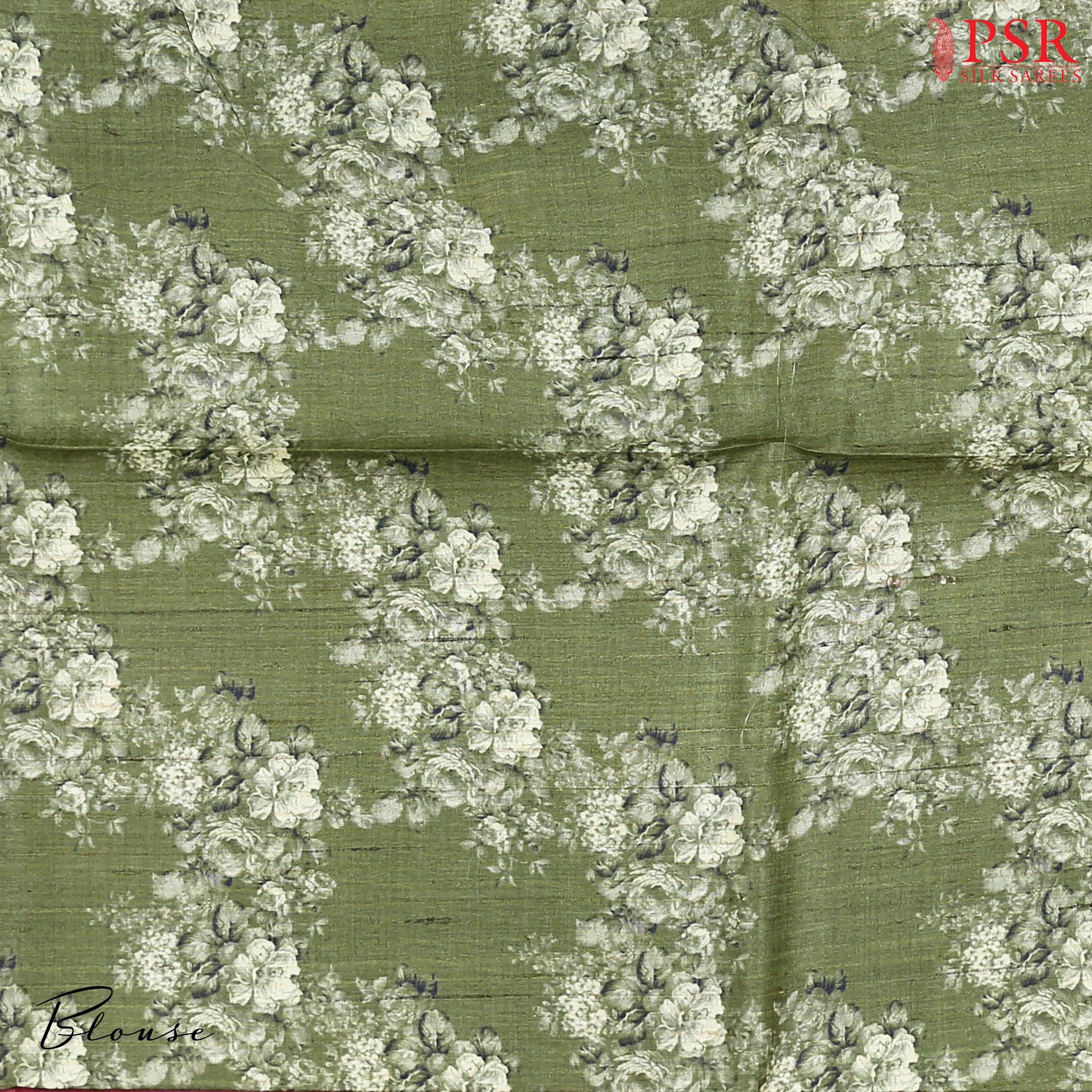 It is paired with a rich Asparagus Green Ghicha silk pallu and border, creating a striking contrast that elevates the overall aesthetic. The ensemble is completed with a matching Asparagus Green blouse adorned with floral prints, perfect for casual celebrations or semi-formal occasions.