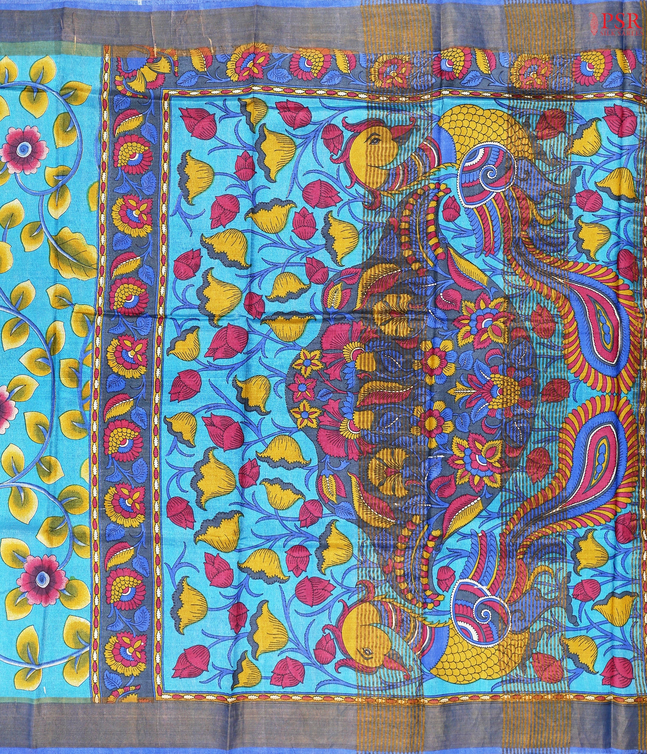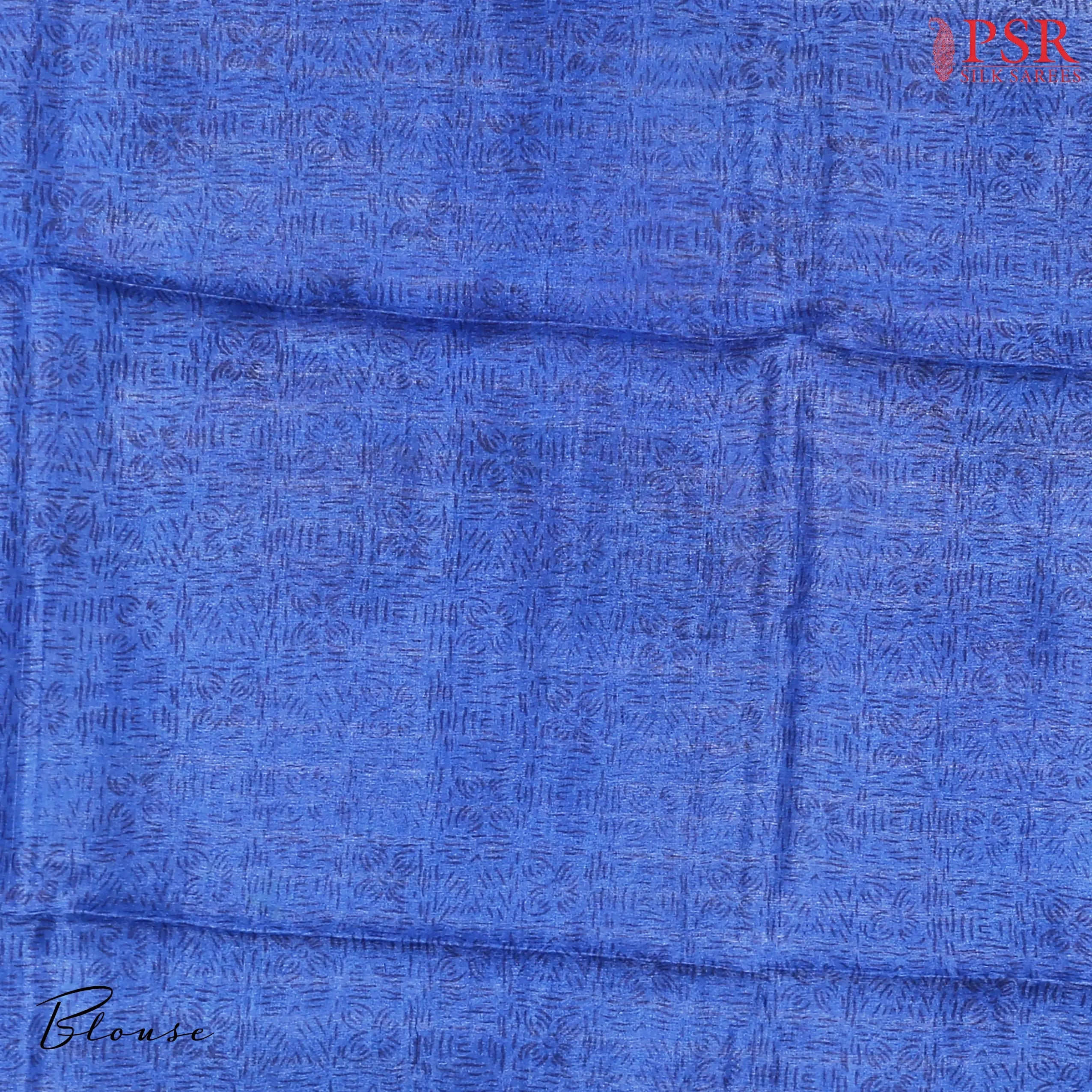 PSR Silk Sarees presents a Cerulean Blue Kadhi Tussar Silk saree, perfectly paired with a pleasing Cornflower Blue combination for an elegant and refreshing appeal.