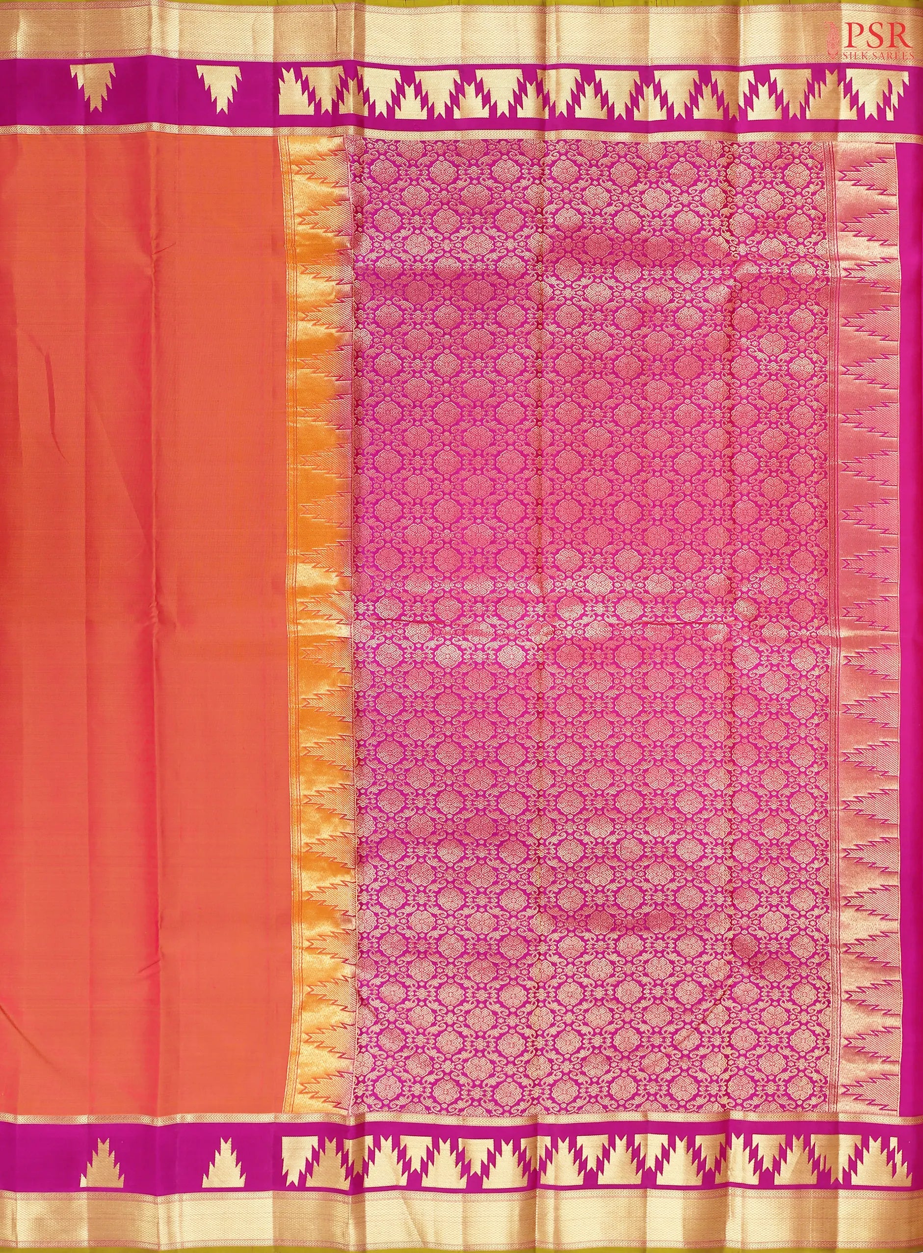 PSR Silk Sarees presents a Coral Pink colored Fancy Kanchipuram Silk with contrasting combination of Magenta Pink color.