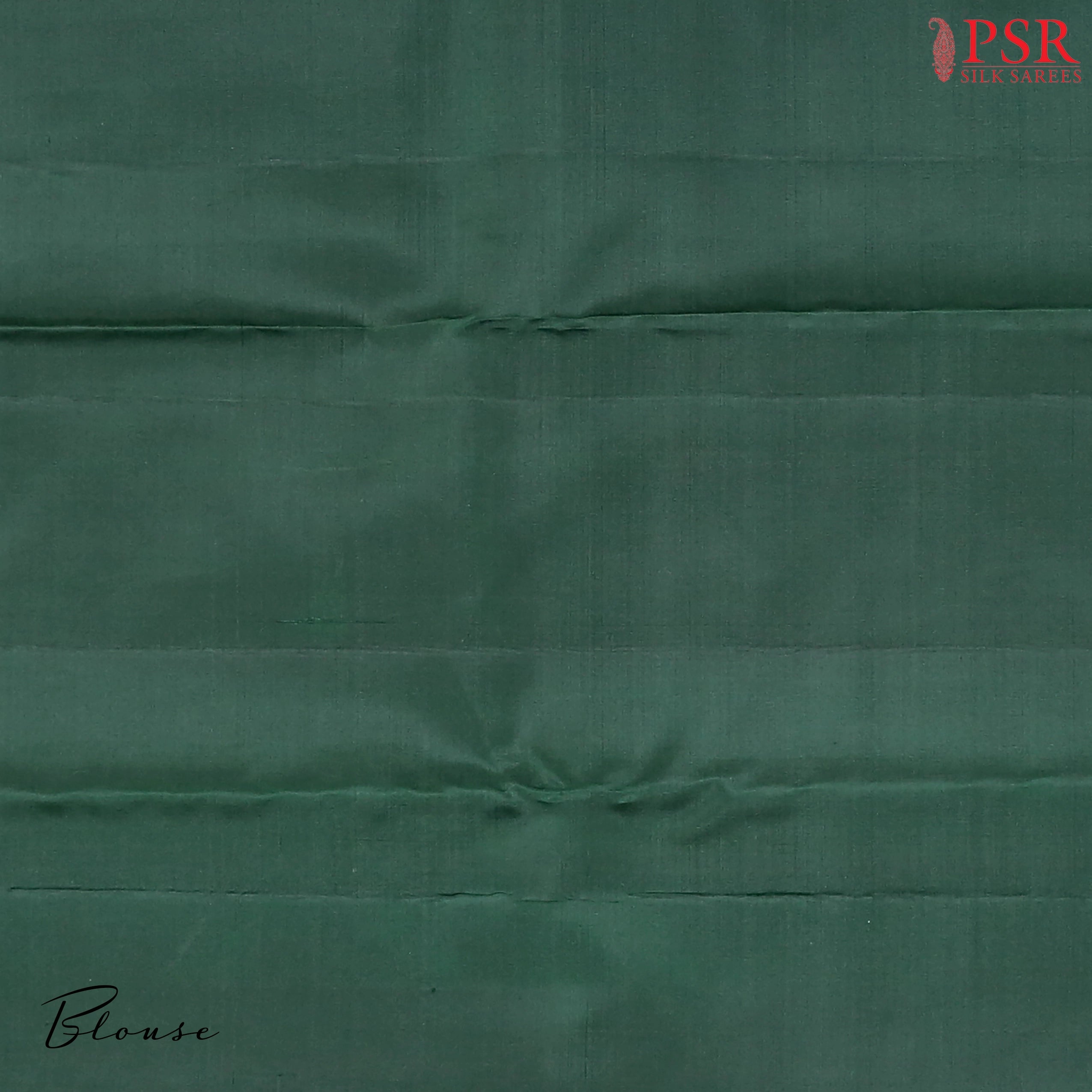 Turn heads with this vibrant Dark Green Kanchipuram Silk Saree from the Smartika Kanjivaram collection by PSR Silk Sarees. The saree showcases elegant mixed copper zari designer motifs weaves across the body, adding a timeless charm to its vivid hue.