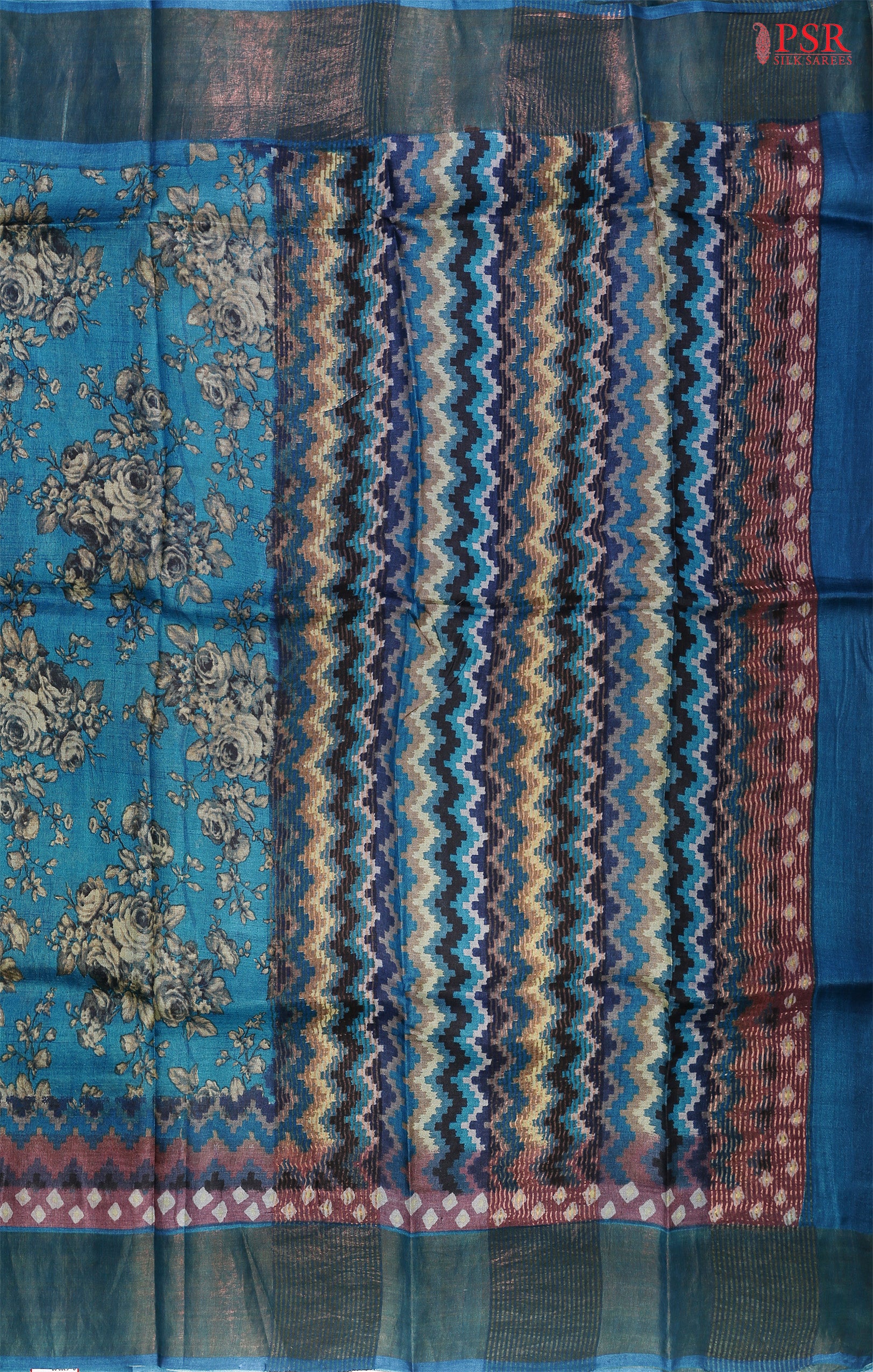 PSR Silks presents a stunning Chintamani Blue Kadhi Tussar Silk Saree, featuring exquisite floral prints. This elegant saree is enhanced with a vibrant, colorful pallu and a shimmering tissue border, adding a touch of sophistication and charm. Perfect for weddings, festive occasions, and special events, this Kadhi Tussar Silk saree combines traditional beauty with contemporary style, making it a standout addition to any wardrobe.