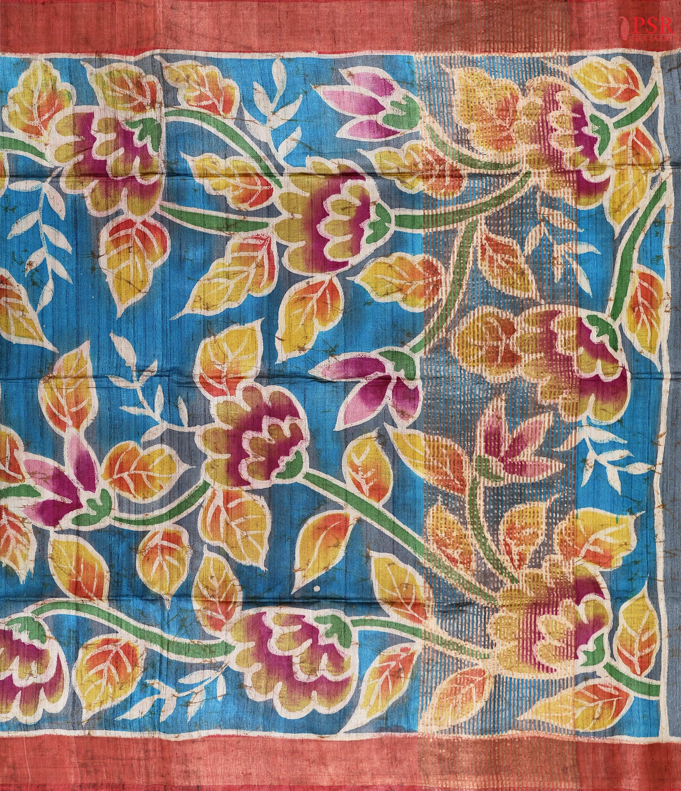 PSR Silk Sarees presents a Bondi Blue Kadhi Ghicha Tussar Silk saree, perfectly paired with a pleasing Red combination for an elegant and refreshing appeal.