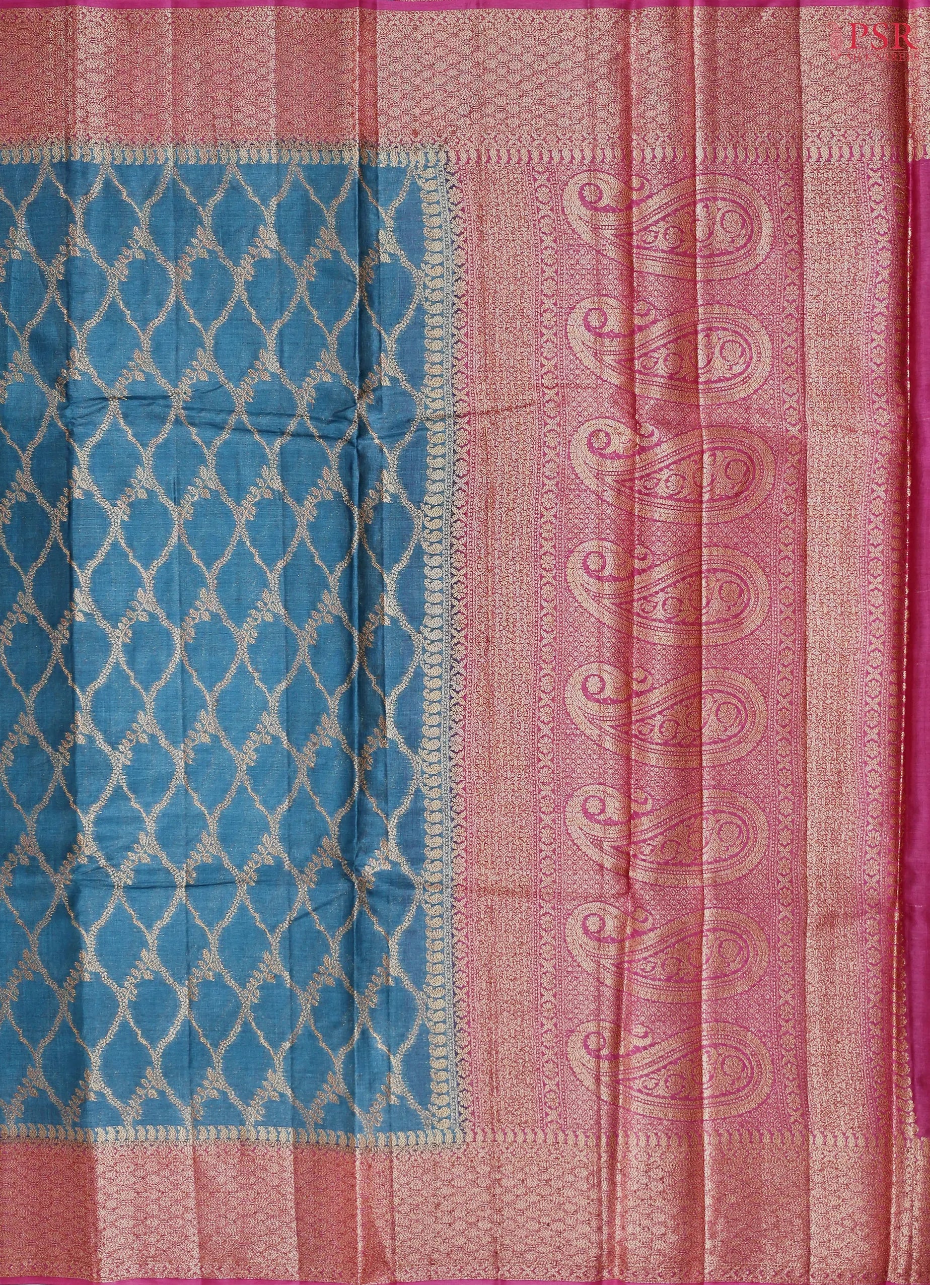 PSR Silk Sarees presents an exquisite Peacock Blue Banaras Tussar Silk Saree paired with a rich Raspberry Pink combination, blending traditional artistry with modern allure.