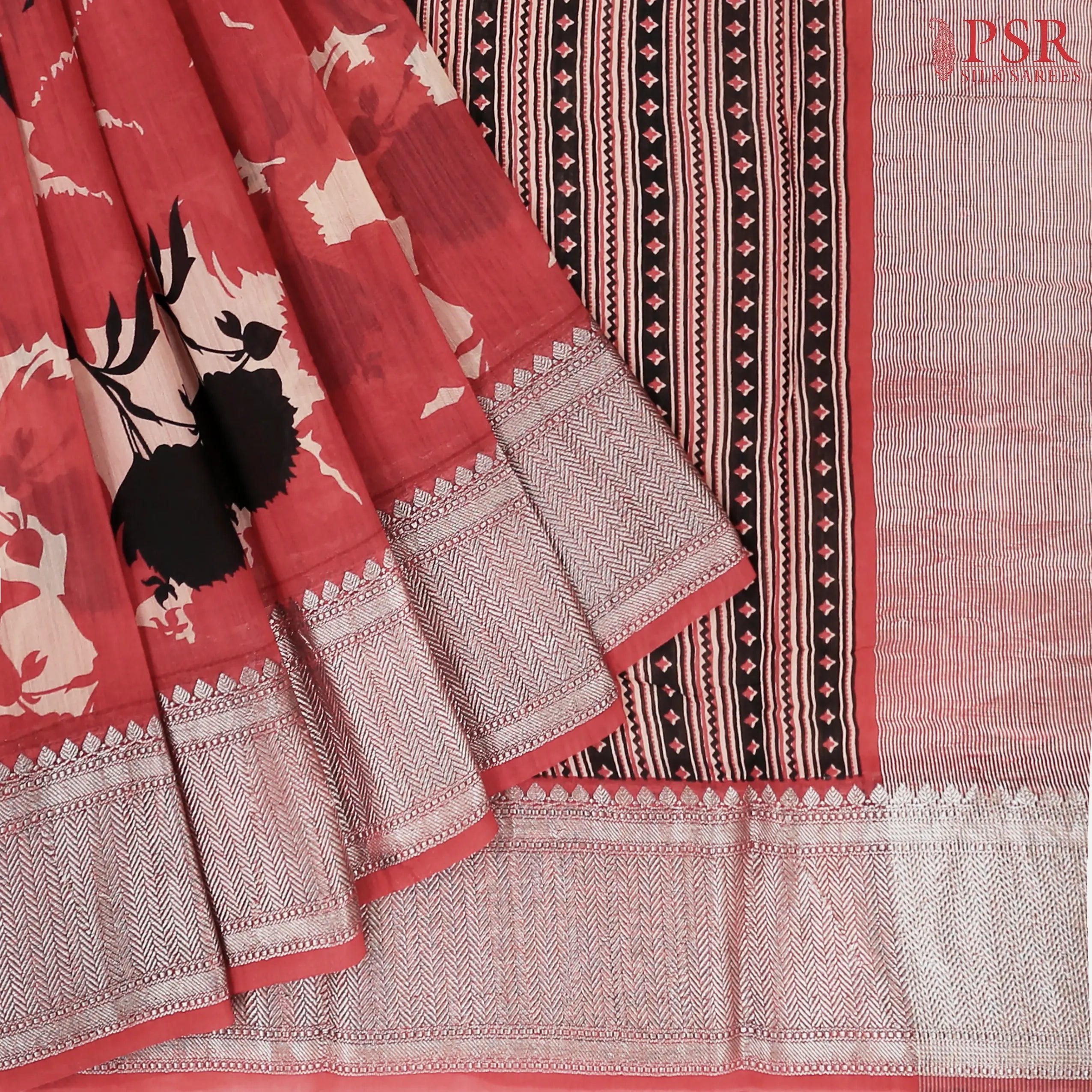 This saree features designer floral prints that enhance its artistic appeal, complemented by a printed pallu adorned with zari stripes. The saree is further accentuated with a traditional zari work border, adding a touch of richness to its look. It is paired with a plain Peach blouse, perfectly balancing the ensemble.