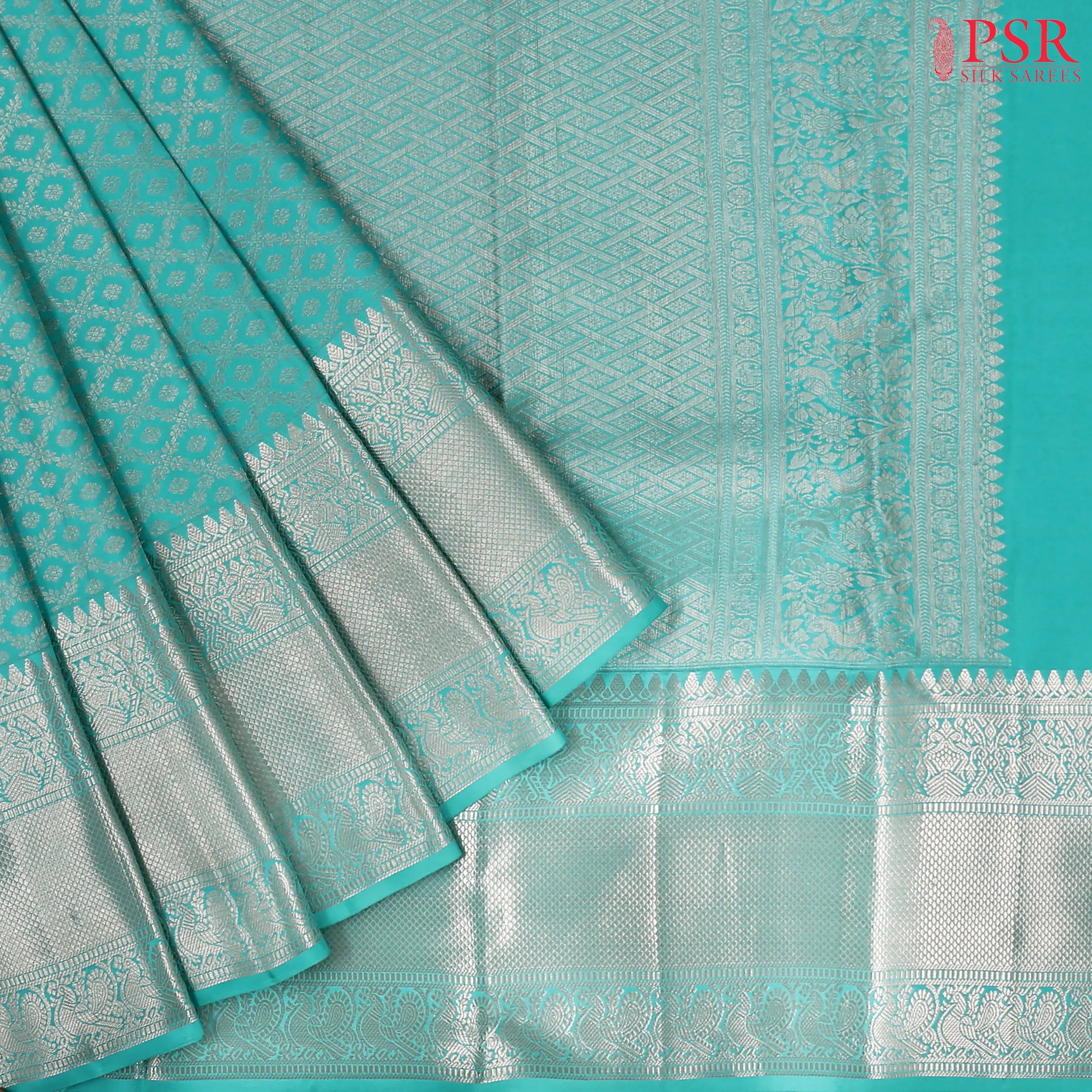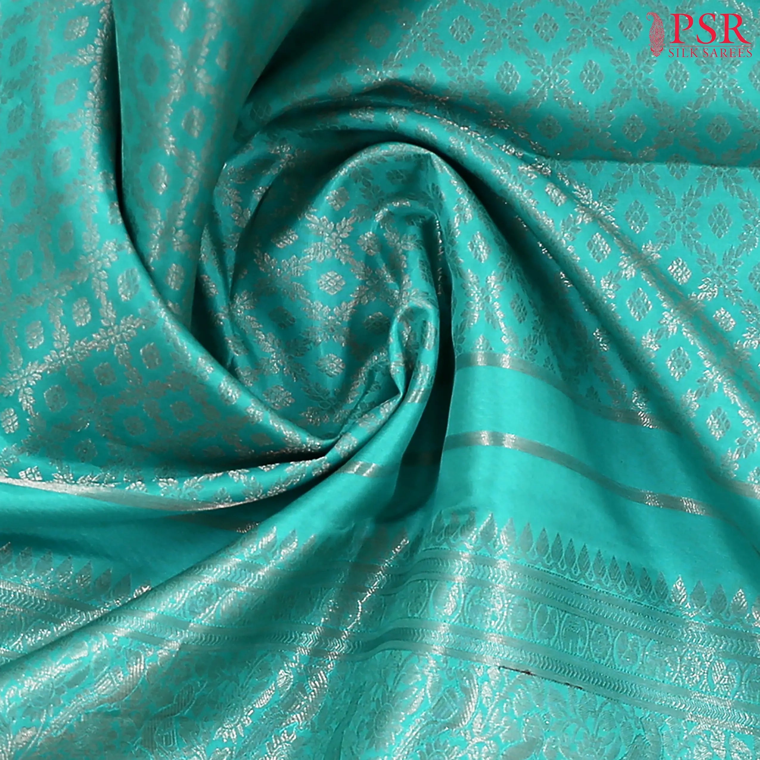 Step into tradition with timeless elegance in this exquisite Turquoise Blue Kanchipuram Silk Saree, part of the Vaichitray Kanjivaram collection by PSR Silk Sarees. The saree features a mesmerizing silver zari floral lattice pattern, intricately woven to create a rich, textured look that exudes sophistication.