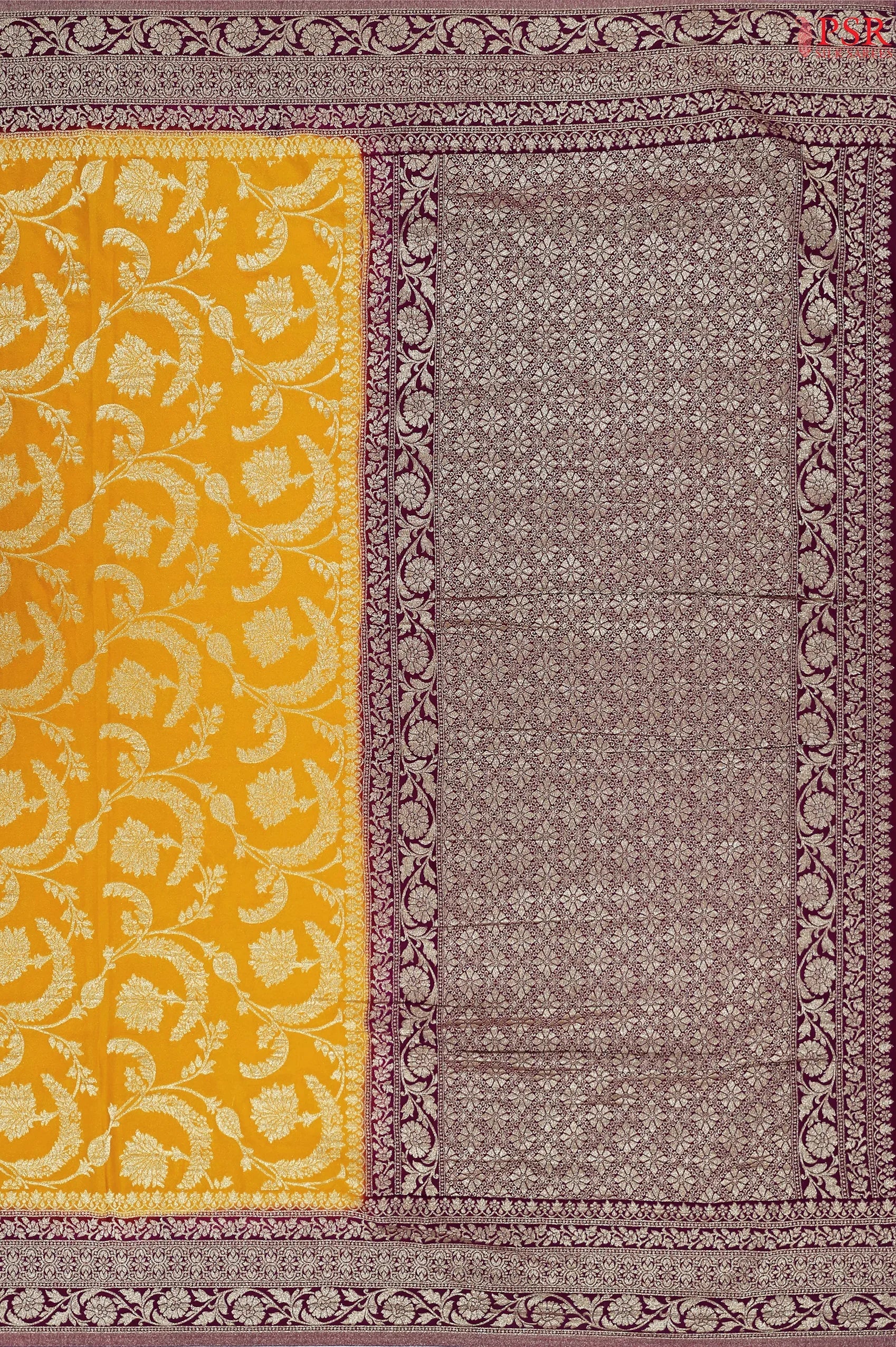 PSR Silks presents a Amber Yellow colored Georgette Saree with zari work with combination of Dark Magenta Purple color.