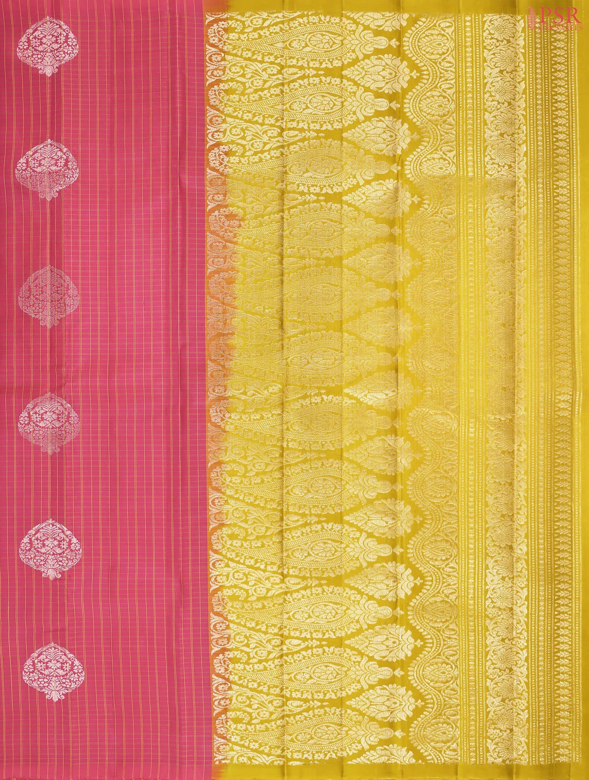 PSR Silk Sarees presents a regal Brink Pink Soft Silk Saree with a striking Mustard Yellow contrast, a perfect blend of vibrant tradition and bold elegance. The rich, lustrous soft silk fabric offers a graceful drape, making it an ideal choice for festive celebrations and grand occasions.