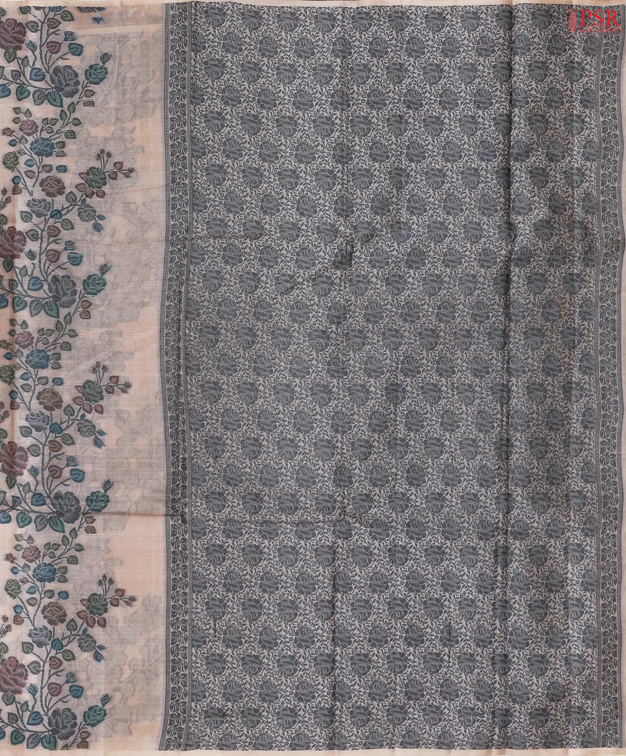 This stylish borderless saree features vibrant multicolor thread floral jacquard work, adding a lively and artistic touch to its soothing peach base. The thread jacquard work pallu enhances its overall appeal with detailed craftsmanship and a refined finish.
