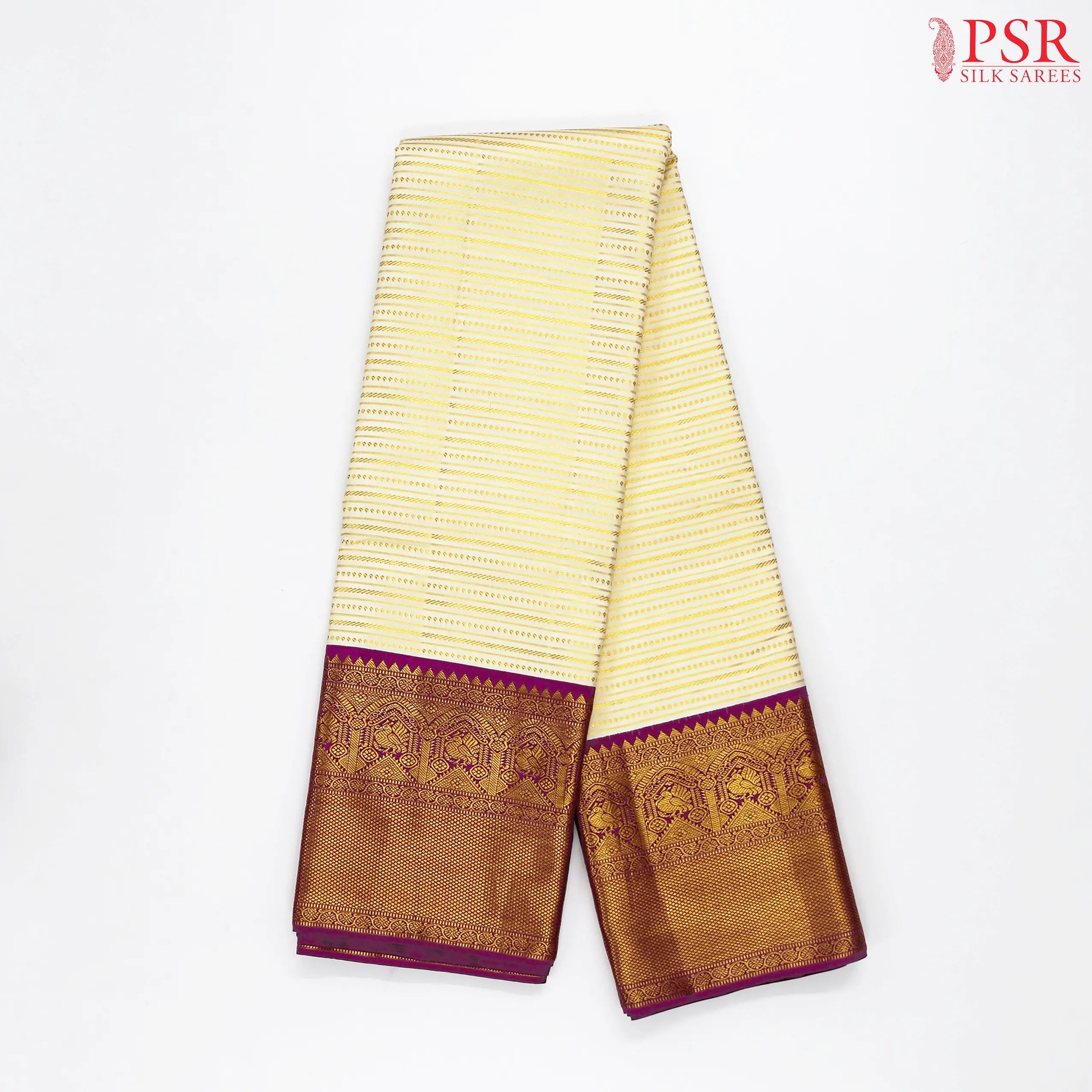 Make your big day unforgettable with this radiant Cream Beige Kanchipuram Jacquard Silk Saree, a timeless treasure from PSR Silk Sarees. Crafted in luxurious silk, the saree features intricate handloom jacquard stripes, celebrating South Indian bridal heritage in every weave.