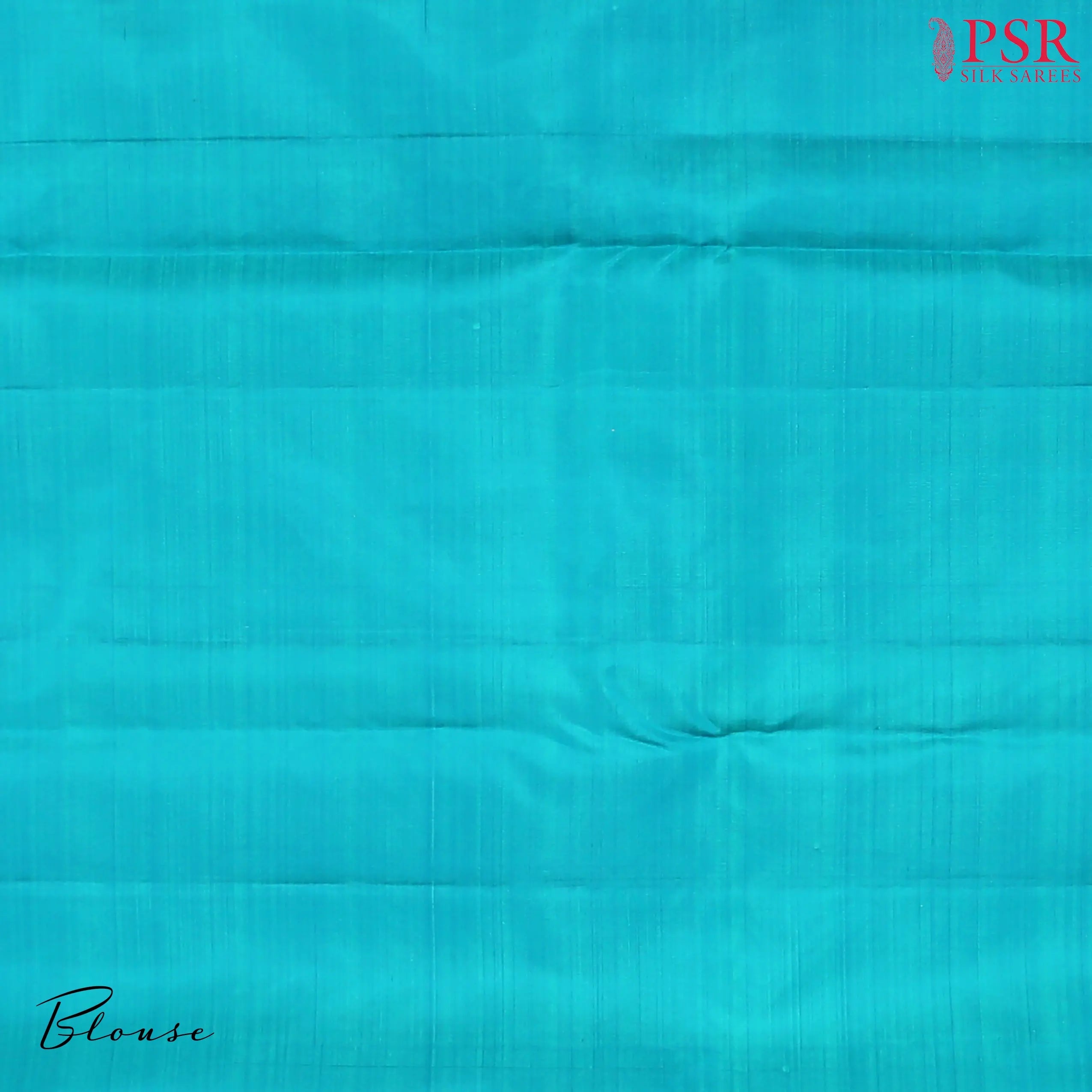 The saree is gracefully complemented by a Cyan Blue traditional zari work pallu and paired with a plain Cyan Blue blouse, enhancing its regal appeal.