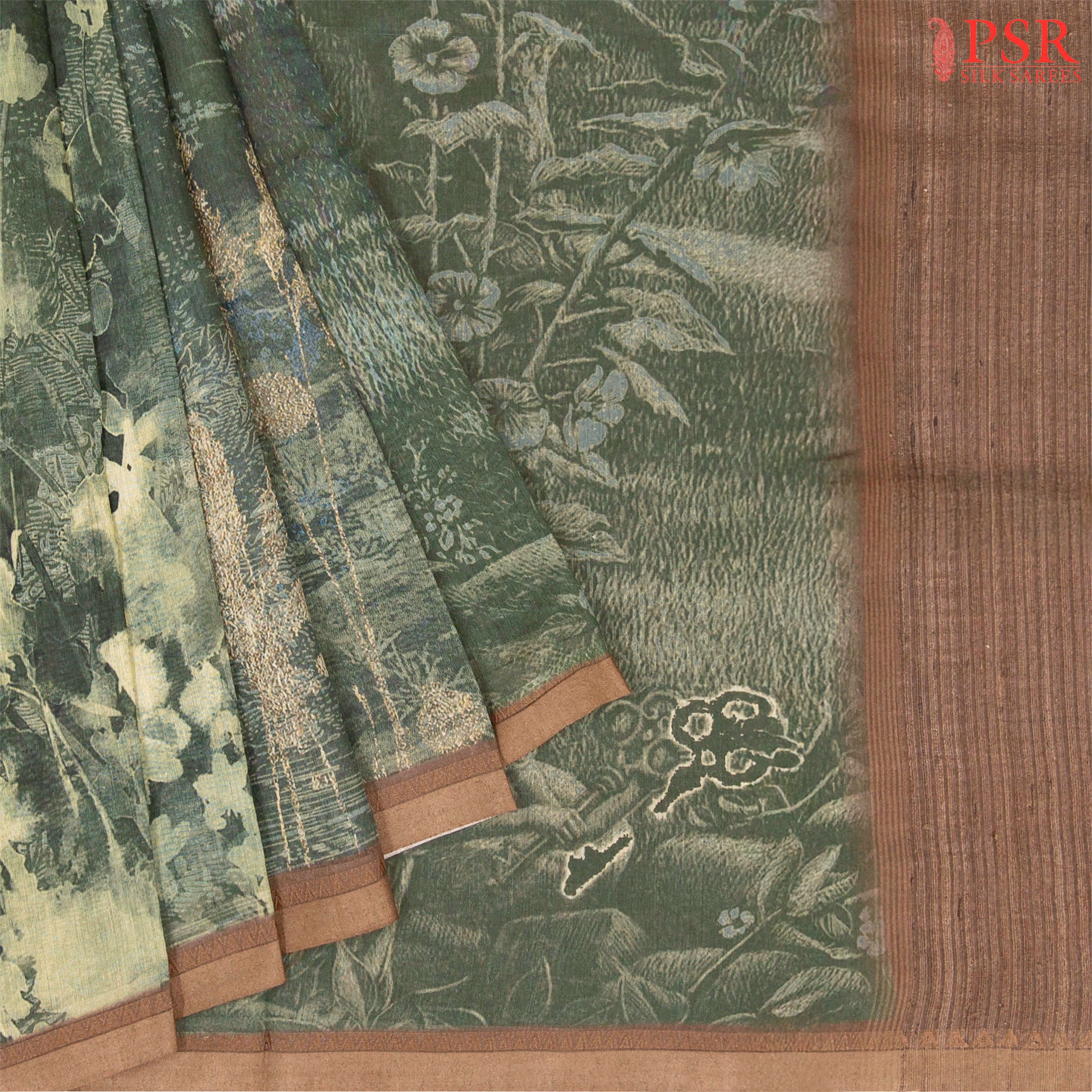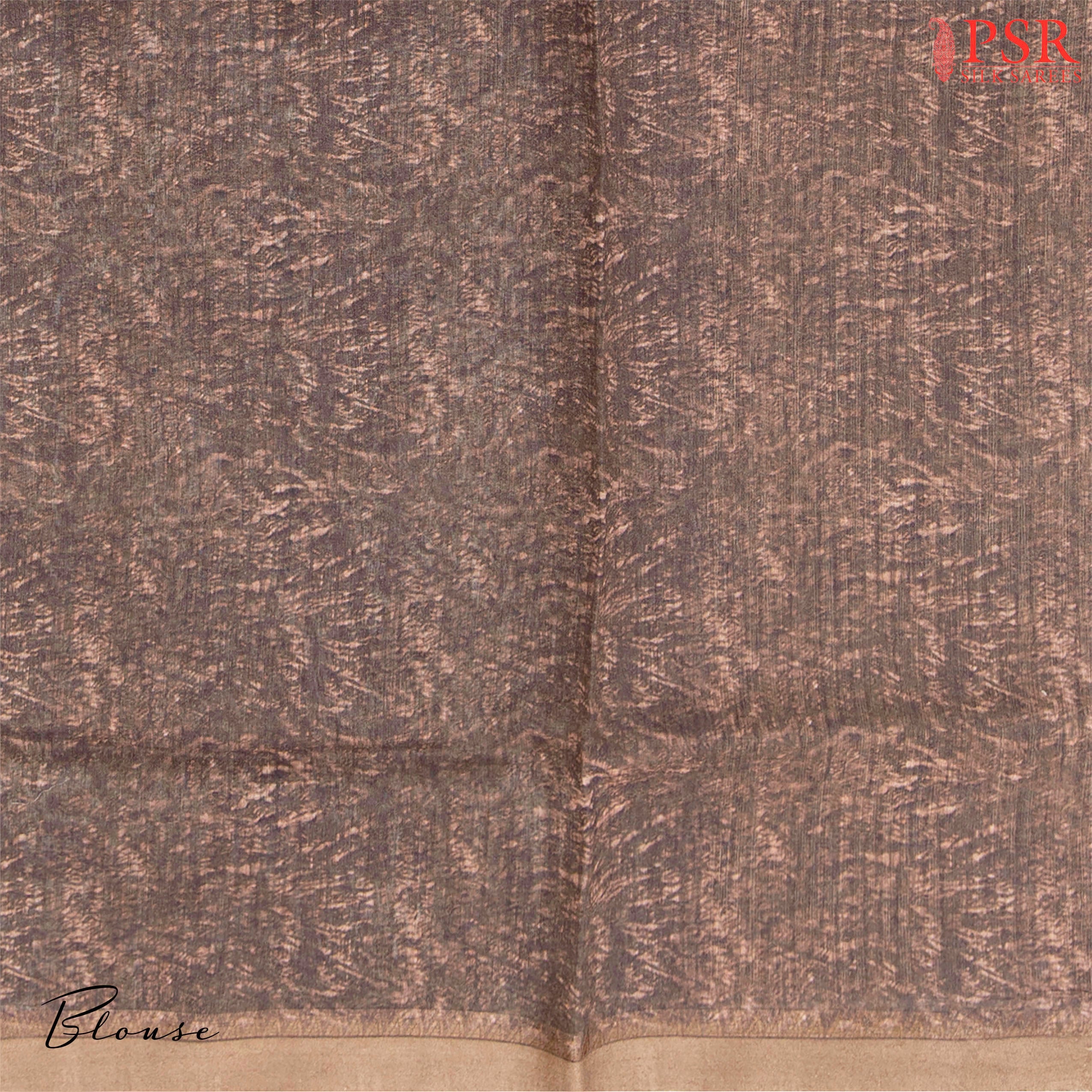 It is completed with a simple brown pallu and a delicate small border, adding just the right touch of tradition. The saree is paired with a brown-colored printed blouse, perfectly complementing its vintage aesthetic. Ideal for cultural events, art-inspired gatherings, or elegant daywear.