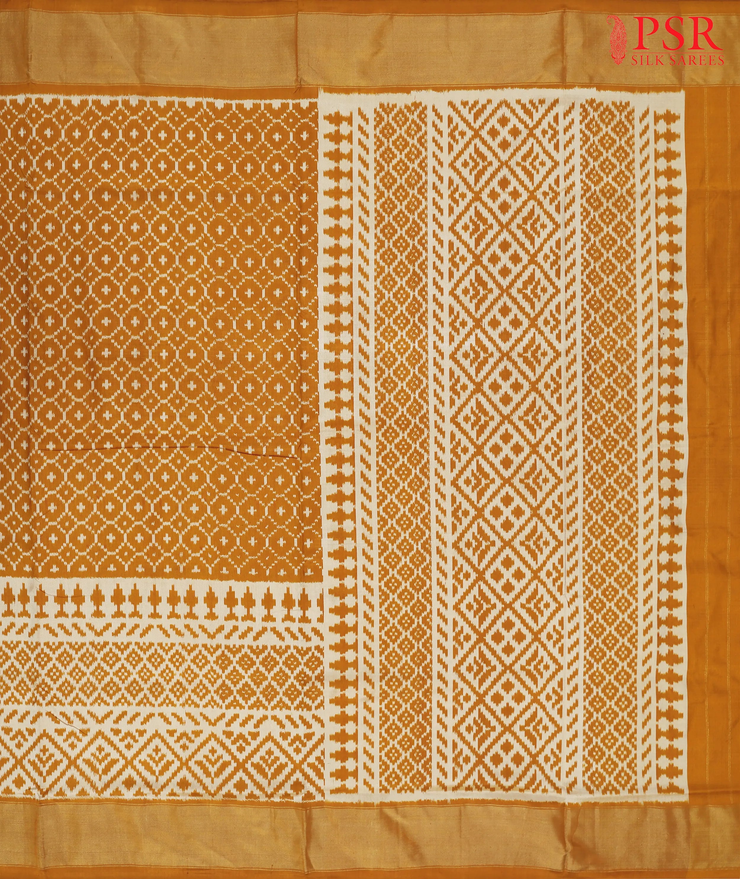 PSR Silk Sarees presents a stunning Dark Mustard Orange colored Pochampally Silk Saree, adorned with intricate weaves of the traditional Ikat pattern. The pallu is beautifully enriched with Ikat weaves, lending it a graceful charm. A broad tissue border enhances its grandeur, while a matching plain blouse completes the ensemble with elegance. Ideal for weddings, festive occasions, and cultural celebrations, this saree is a perfect blend of heritage and sophistication.