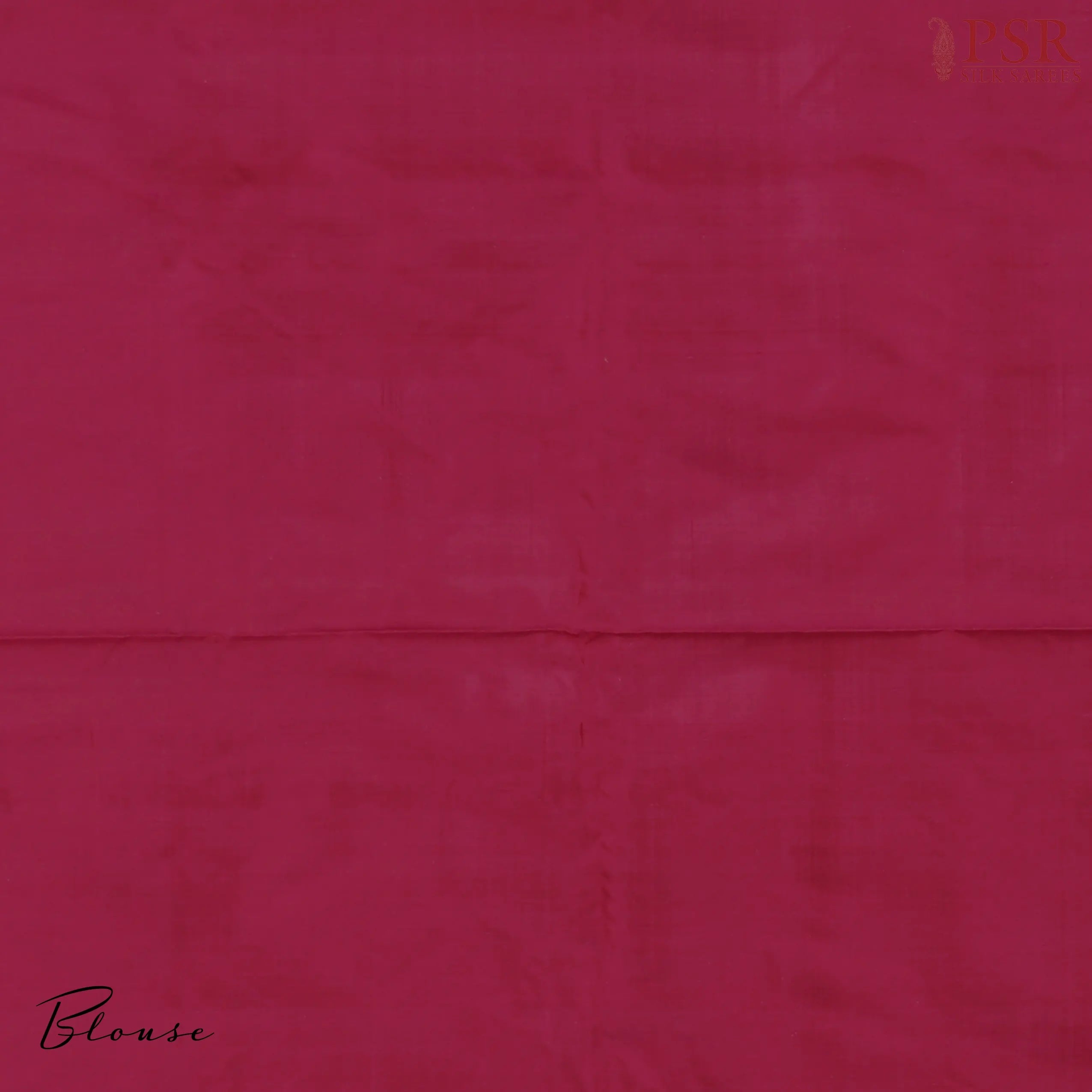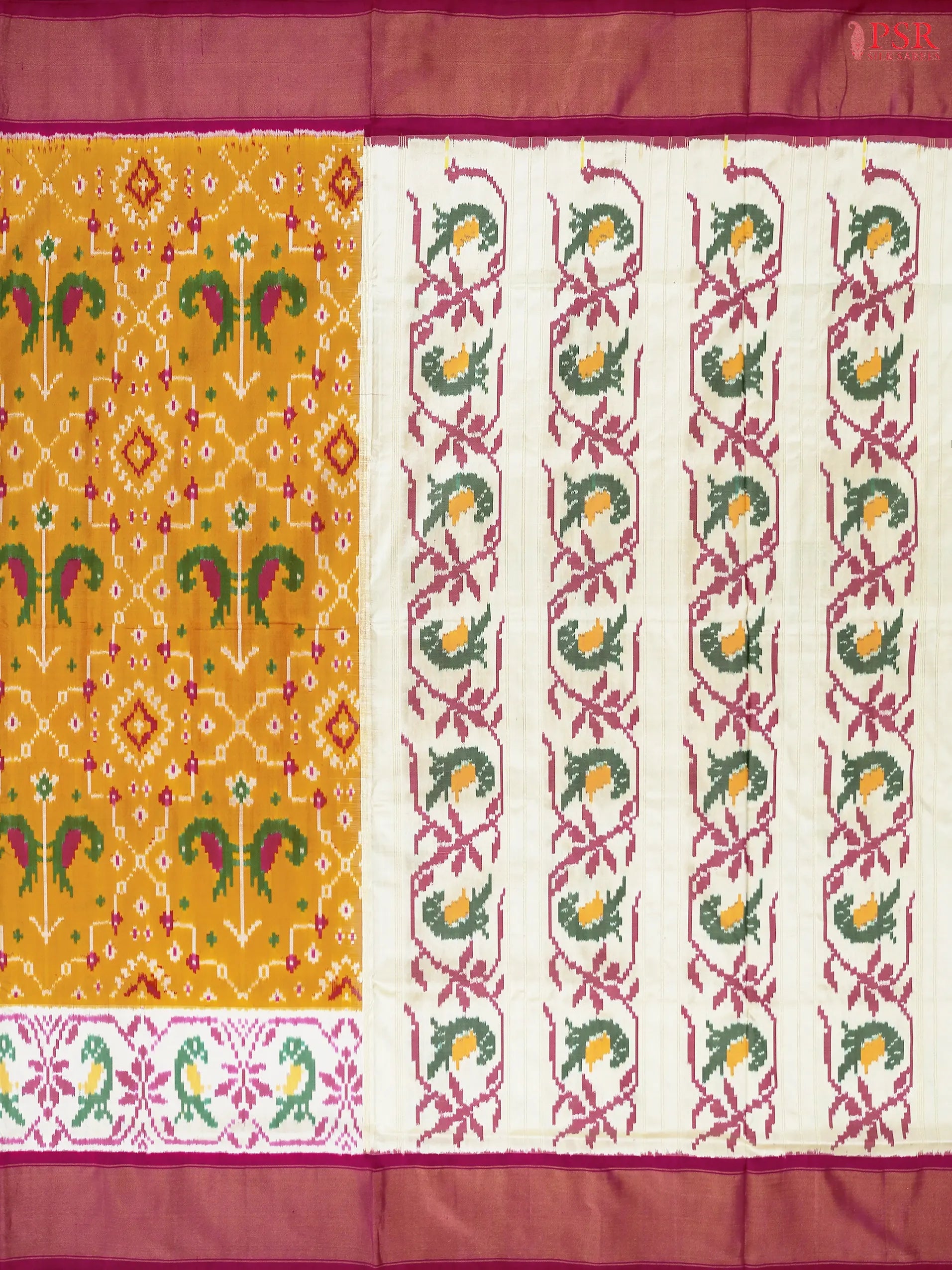PSR Silk Sarees presents a vibrant Dark Mustard Yellow Pochampally Silk saree, paired with a rich Cerise and Cream Beige combination that radiates traditional charm.