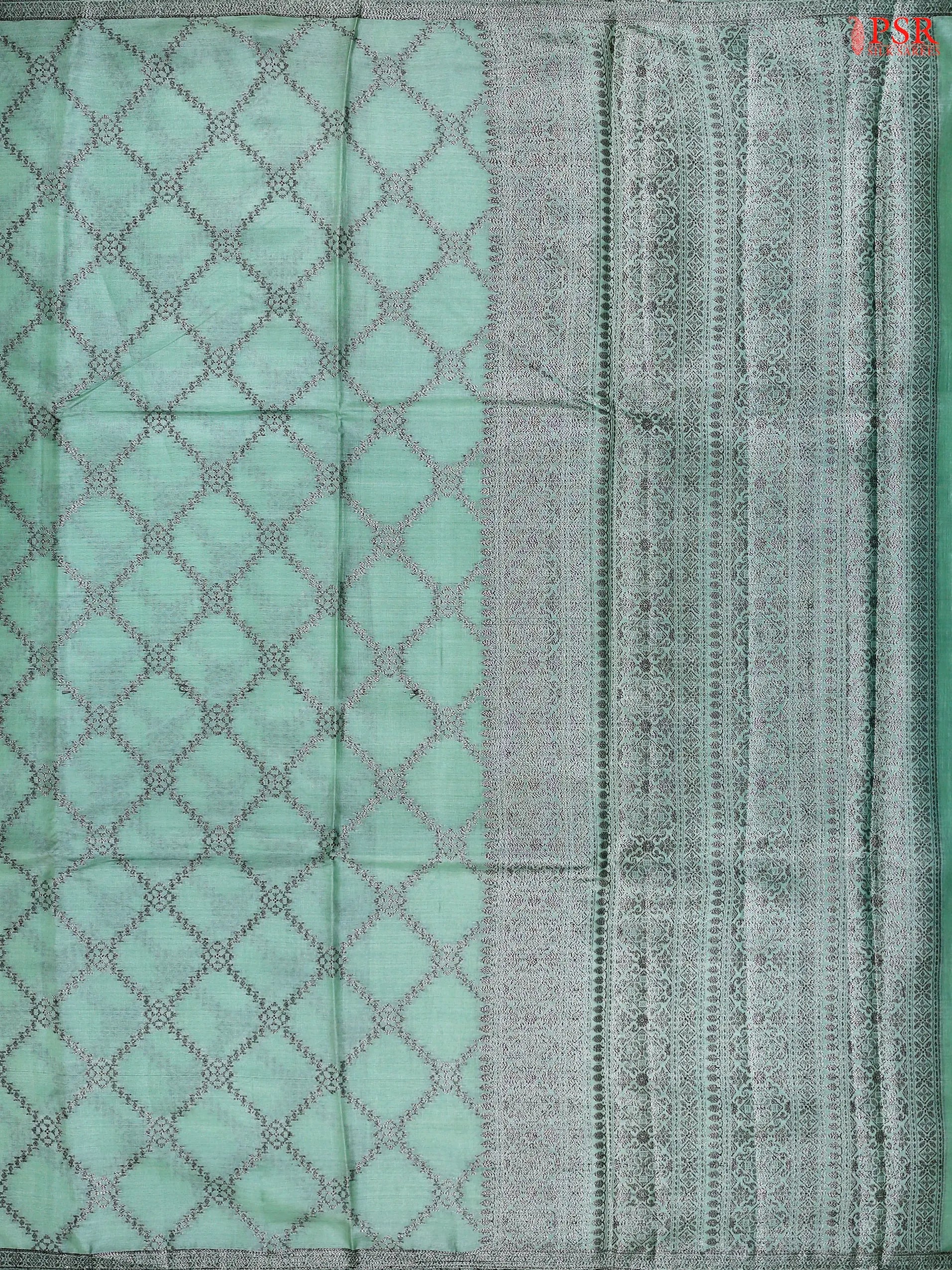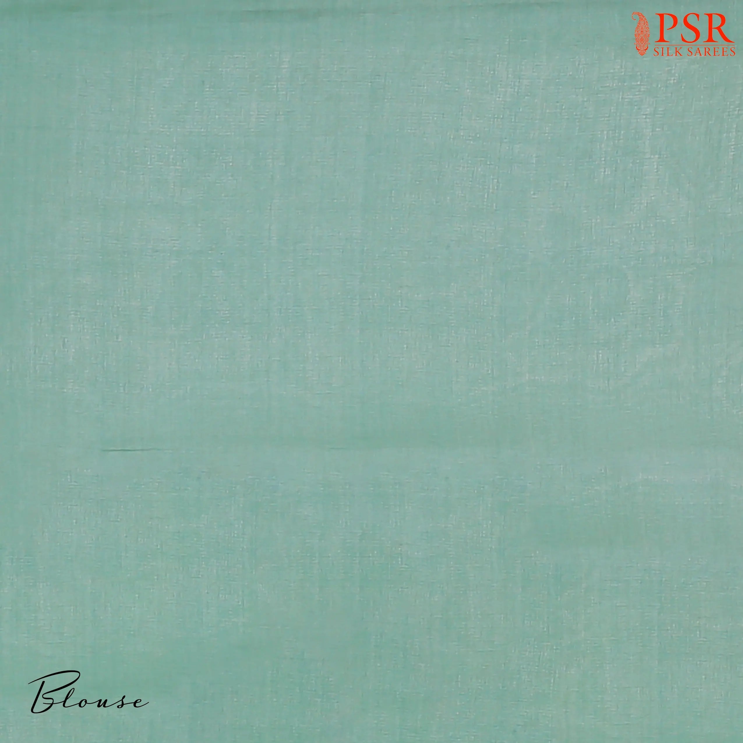 PSR Silk Sarees presents an elegant Dusty Teal Banaras Tussar Cut Work Saree, crafted in a delicate fabric that radiates grace.