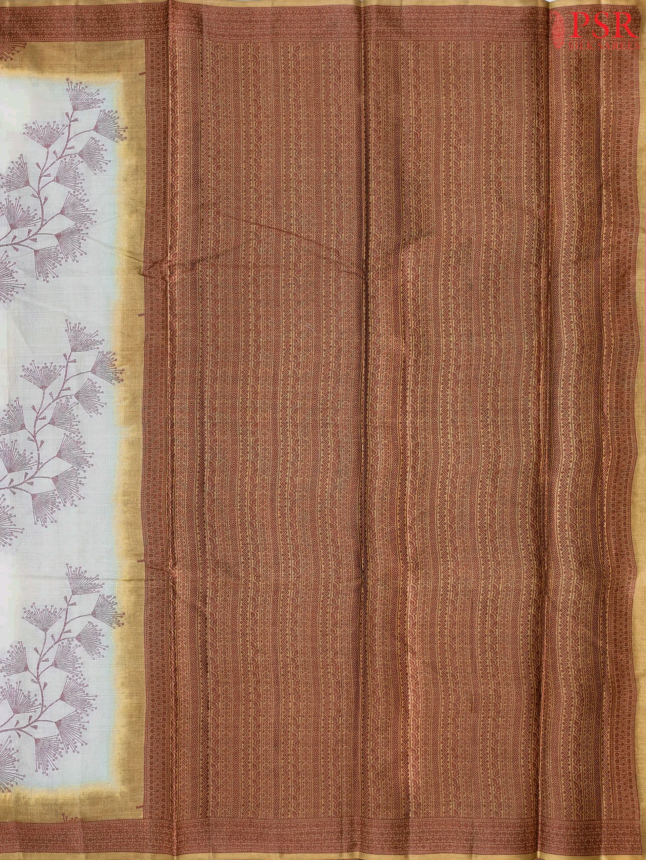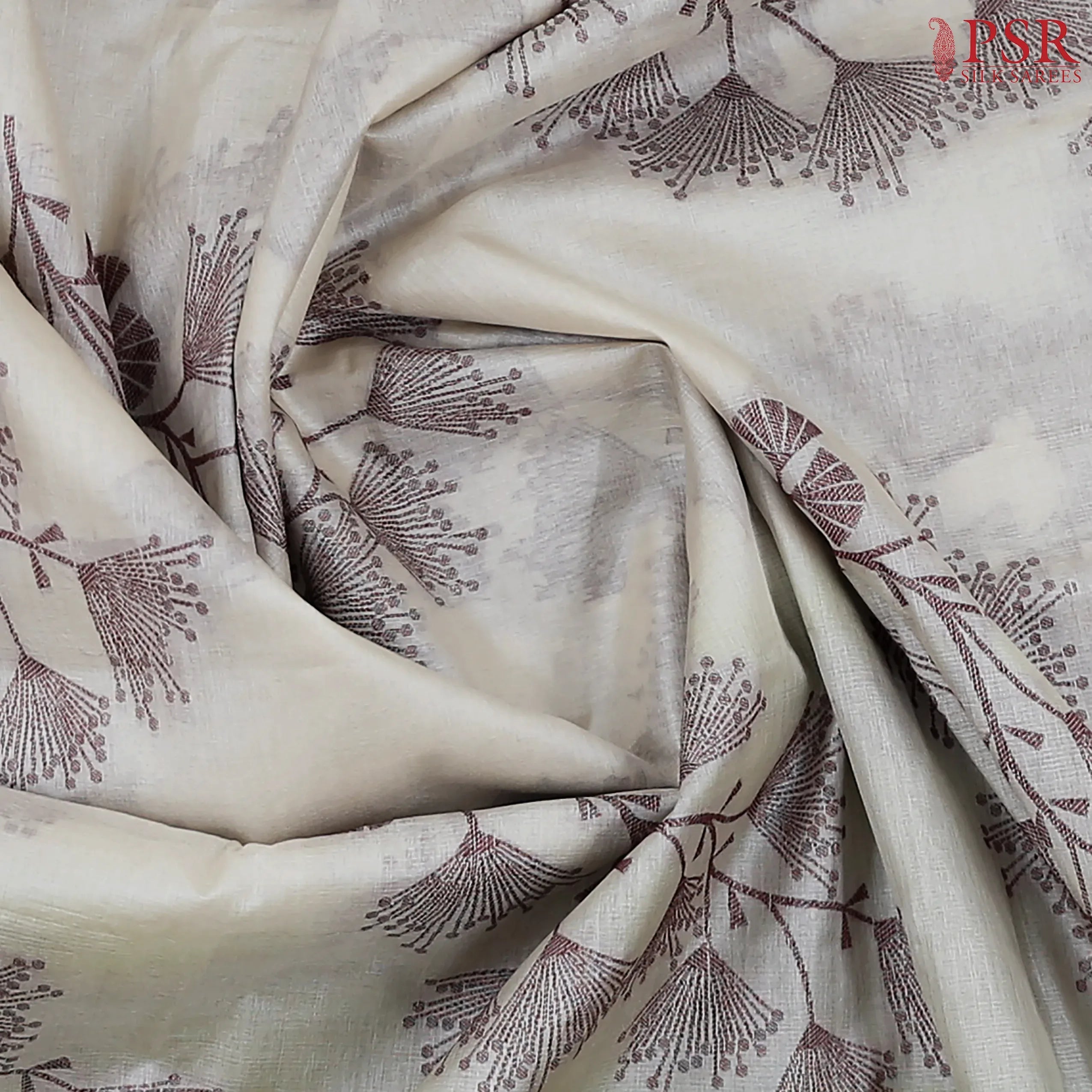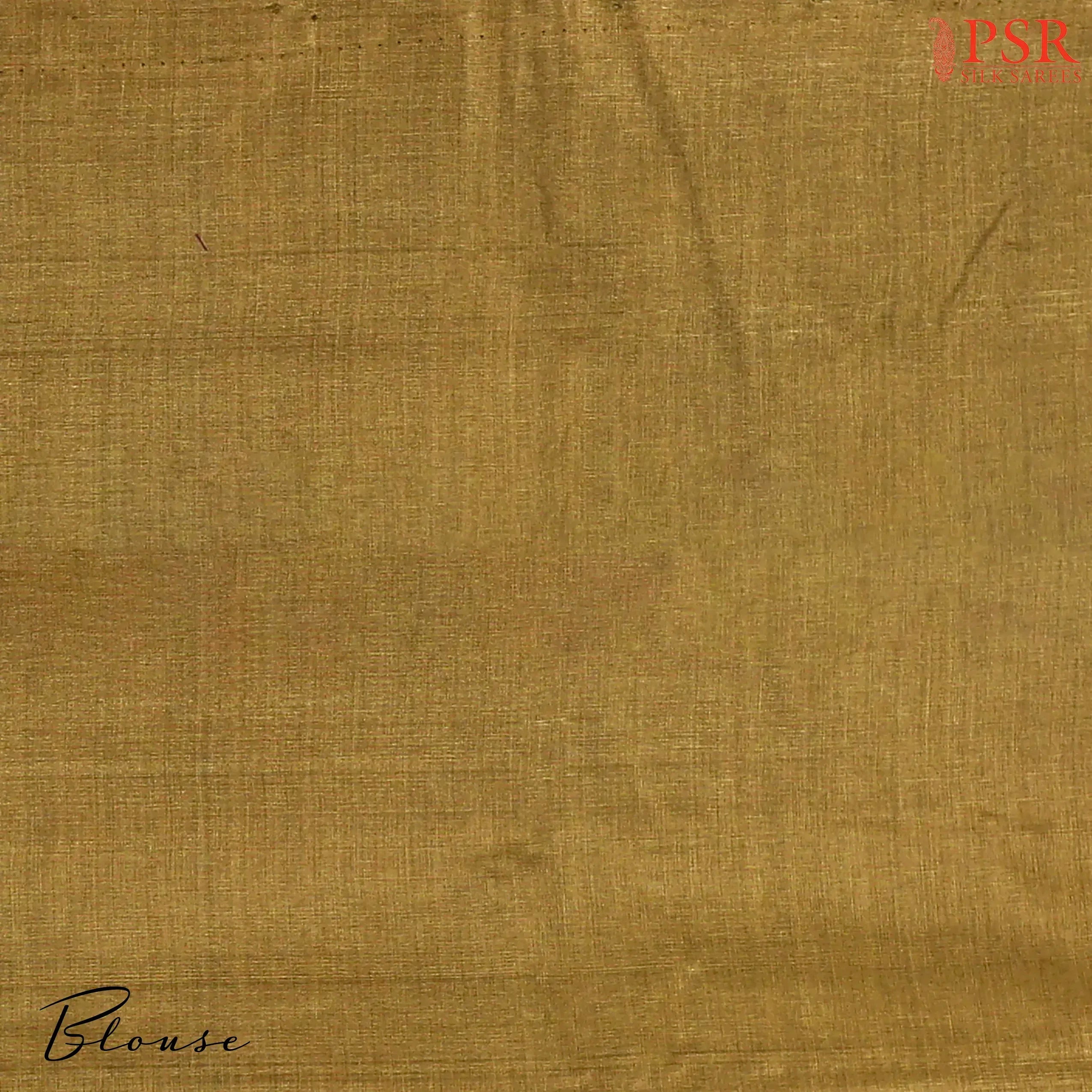 PSR Silk Sarees presents a Floral Beige delicate Banaras Tussar Silk saree, beautifully paired with an elegant Mustard Yellow combination.