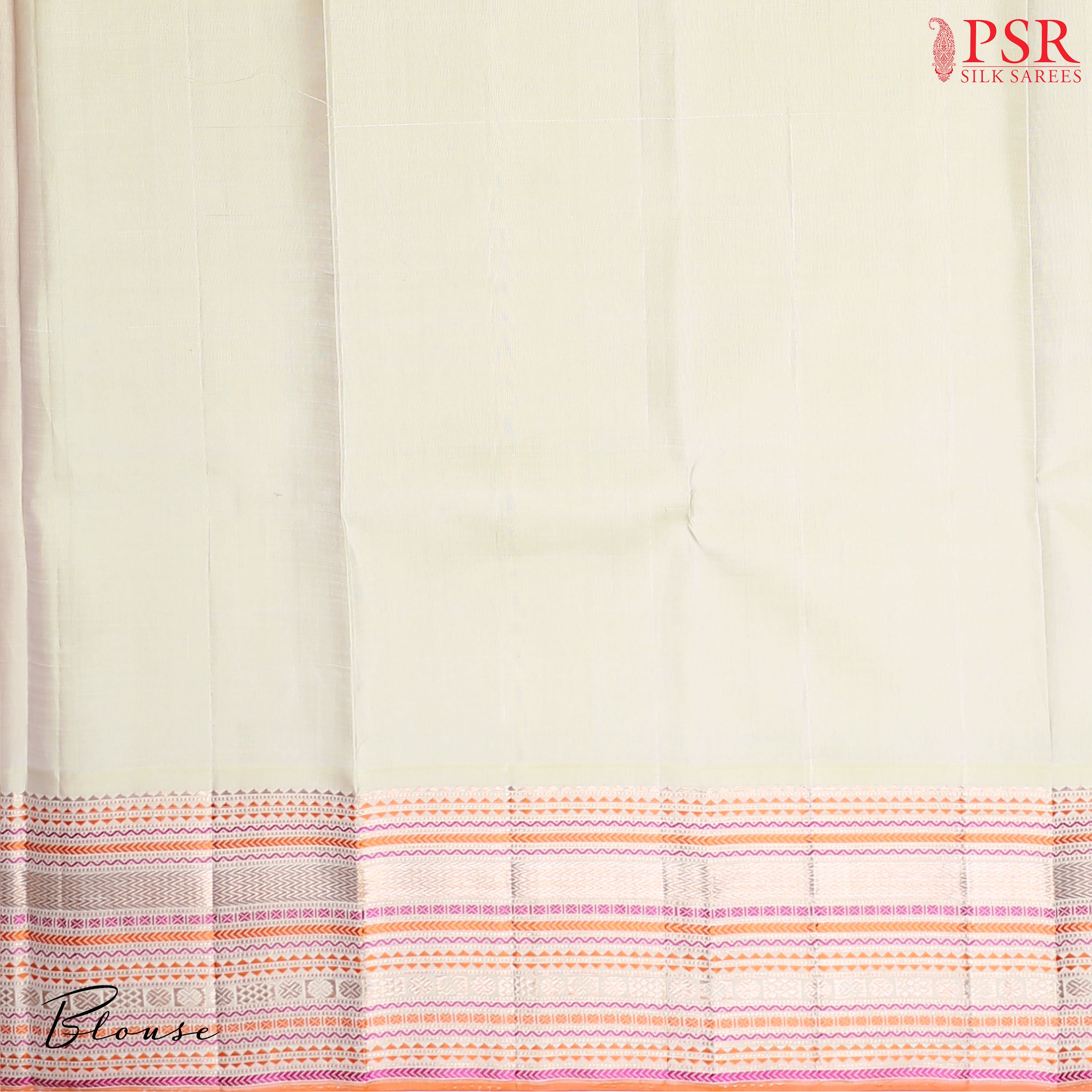 Featuring self-stripes with copper zari accents, this saree radiates elegance and grace. The Cream-colored pallu, adorned with traditional copper zari work, beautifully complements the intricate colorful thread & zari korvai border, adding a touch of regality.