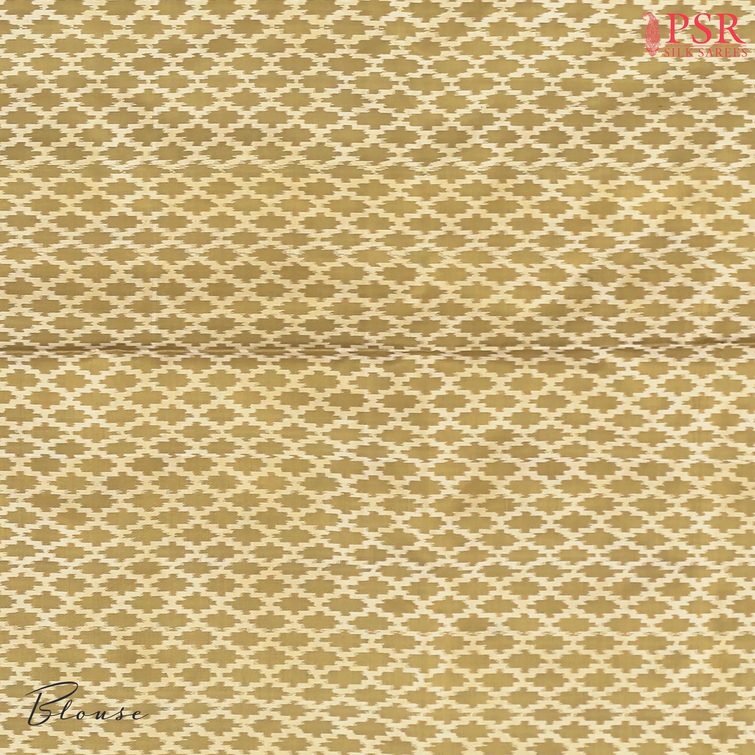 PSR Silk Sarees presents a stunning Olive Tan colored Pochampally Silk Saree, adorned with intricate weaves of the traditional Ikat pattern. The pallu is beautifully enriched with Ikat weaves, lending it a graceful charm. A broad plain border enhances its simplicity, while a matching blouse completes the ensemble with elegance. Ideal for weddings, festive occasions, and cultural celebrations, this saree is a perfect blend of heritage and sophistication.