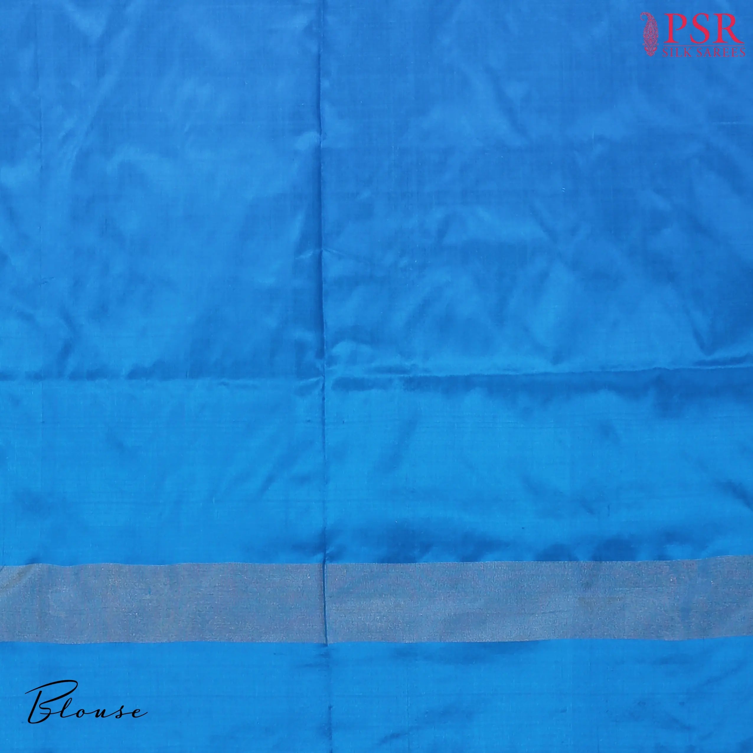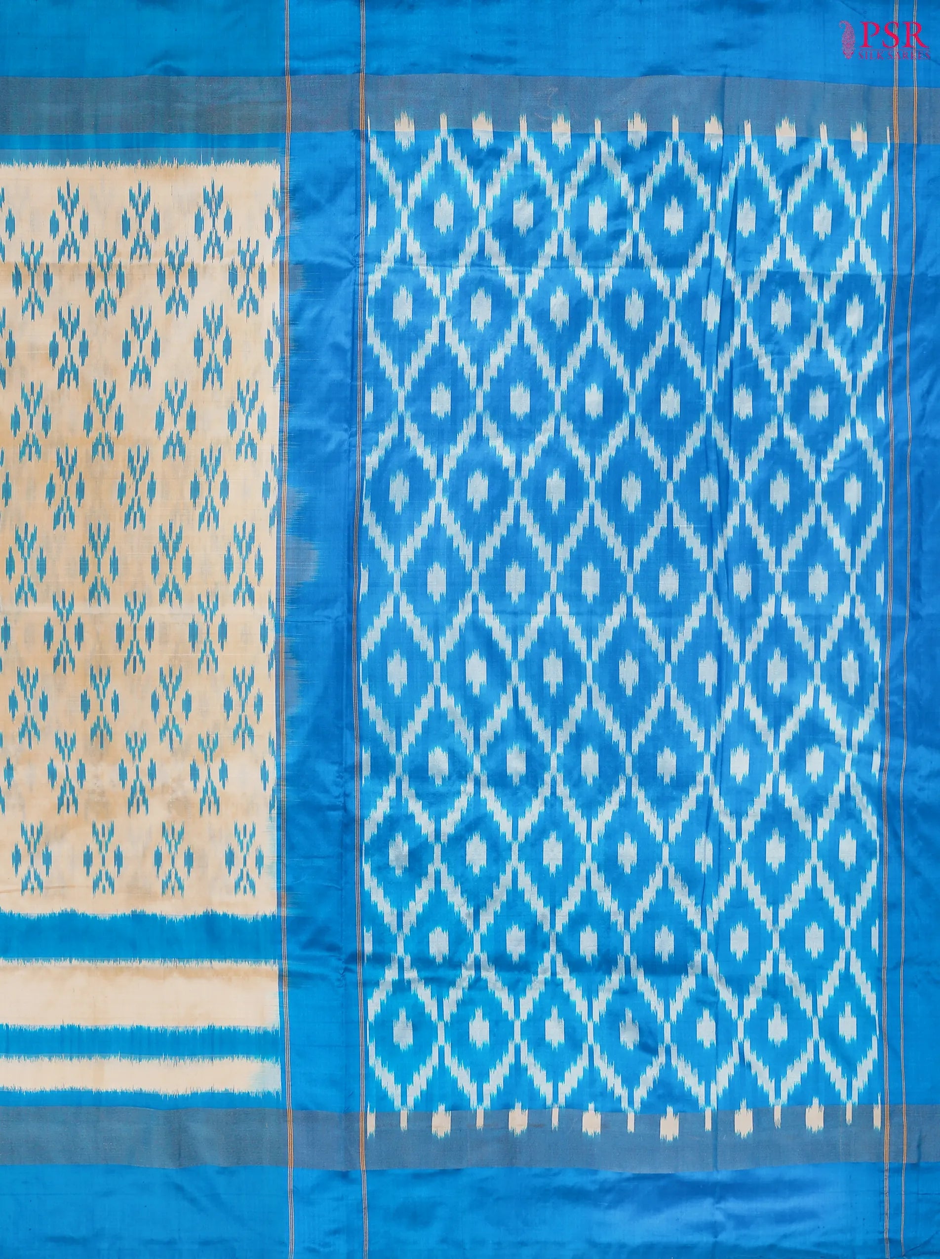 PSR Silk Sarees presents an elegant Bisque Beige Pochampally Silk Saree paired with a rich Chintamani Blue combination, exuding timeless sophistication and ethnic charm.