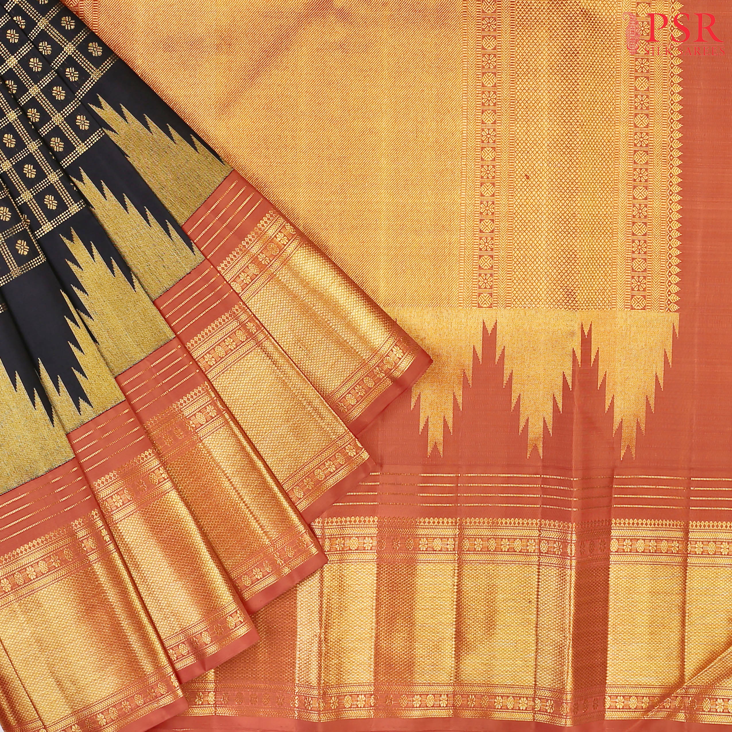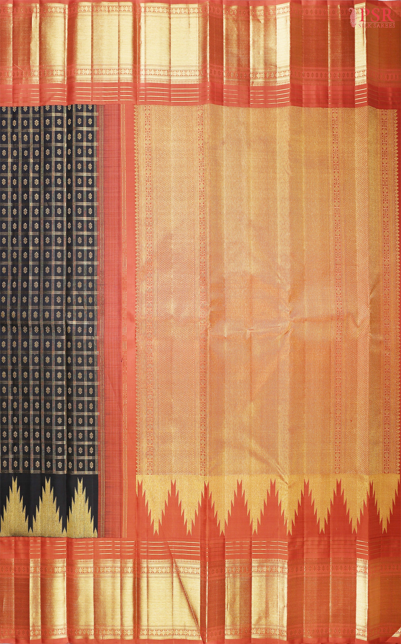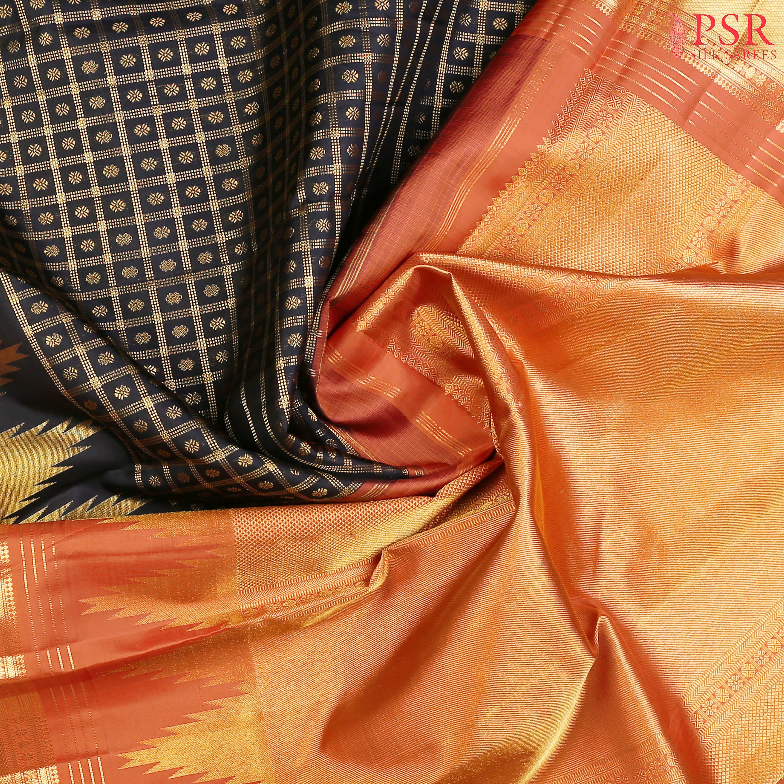 "Unveil Timeless Elegance with PSR Silks! Presenting a striking Black Pure Kanchipuram Bridal Silk Saree, beautifully complemented by a rich Dark Orange hue. This exquisite saree features a magnificently woven zari checkered pattern adorned with delicate small flowers, creating a captivating visual appeal. The saree is finished with a traditional Dark Orange pallu embellished with intricate zari work and a classic korvai border that adds a touch of sophistication. Complete with a plain Dark Orange blouse, this saree is perfect for brides seeking to blend tradition with contemporary style. Drape yourself in the luxurious elegance of PSR Silks and make your special day unforgettable!"