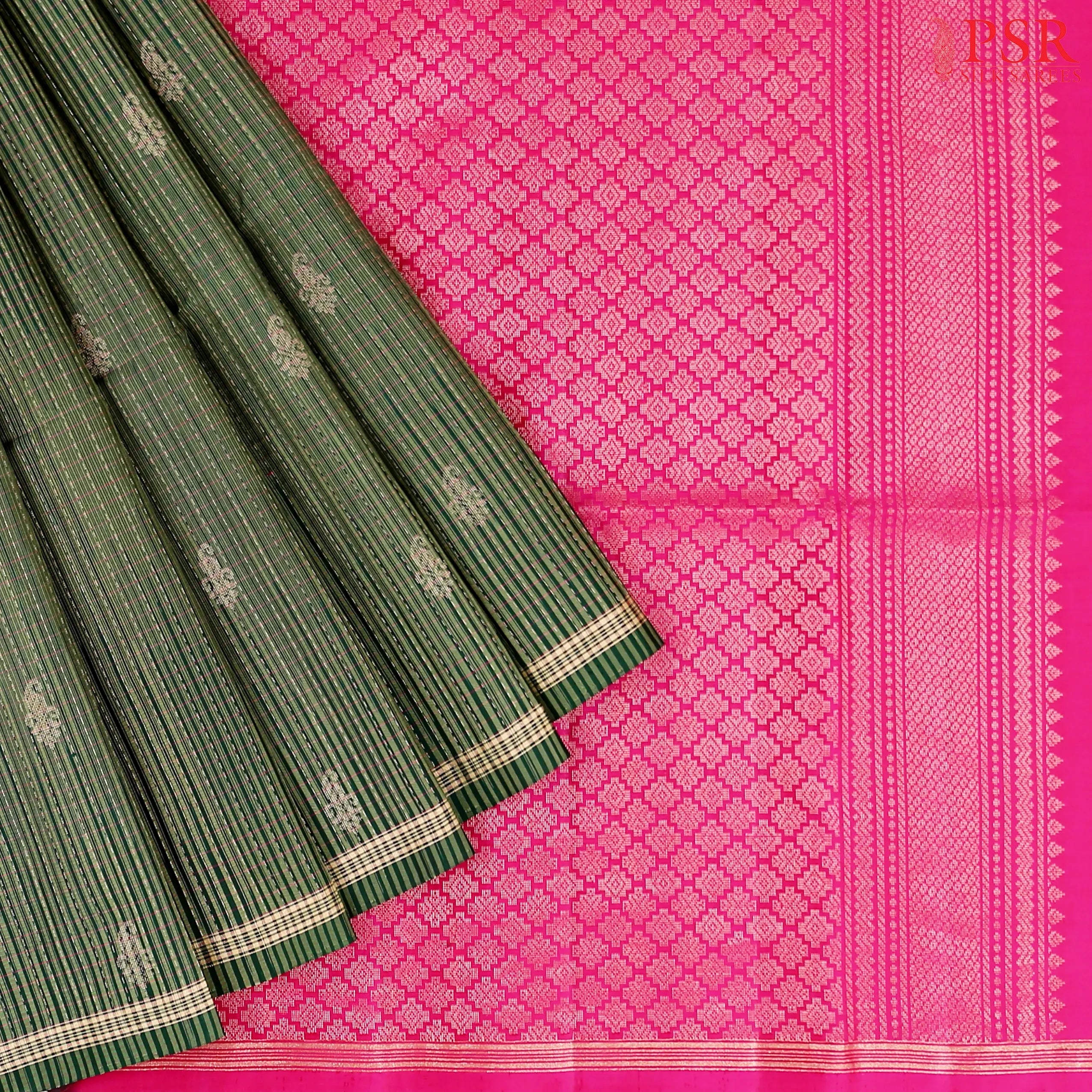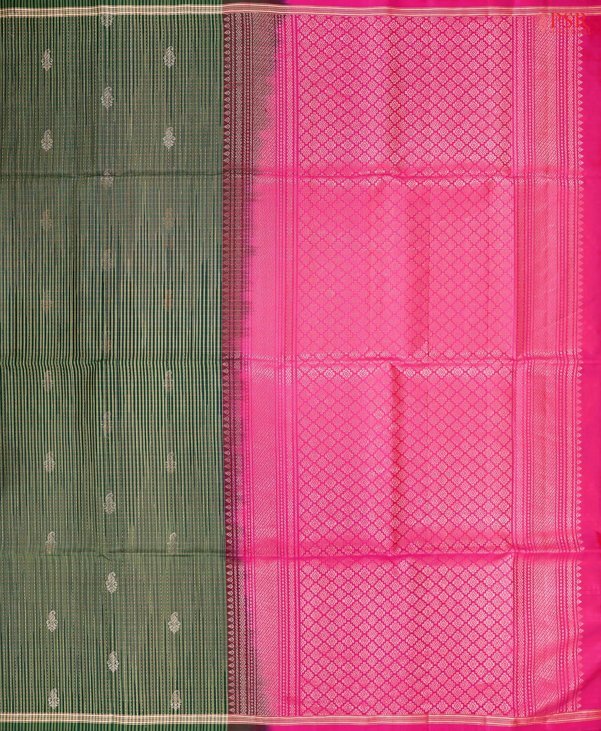 PSR Silk Sarees presents a graceful Dark Green Soft Silk Saree, beautifully paired with a contrasting Dark Pink combination. The saree features an elegant stripes pattern enriched with delicate floral zari motifs, reflecting timeless craftsmanship. Its Dark Pink pallu is adorned with rich and traditional zari work, adding a regal charm to the drape. A plain Dark Pink blouse completes the ensemble, making it a perfect choice for festive occasions, weddings, and cultural gatherings.