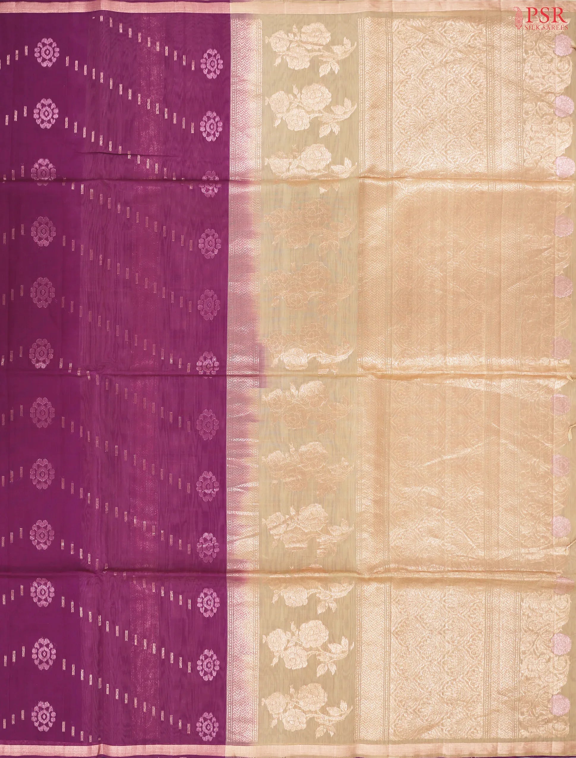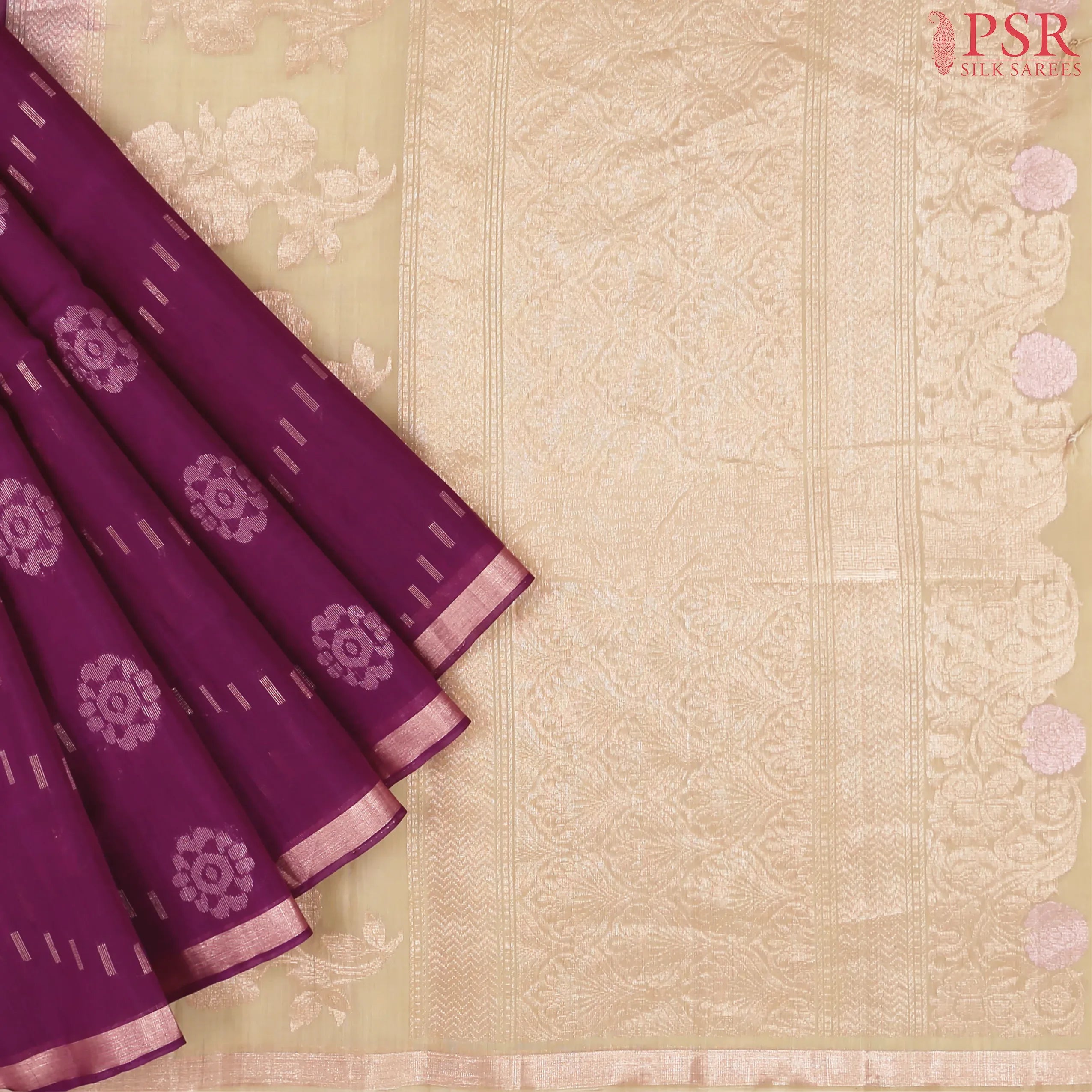 PSR Silk Sarees presents a Boysenberry Purple colored Silk Cotton saree with contrasting combination of Tussar Beige color.