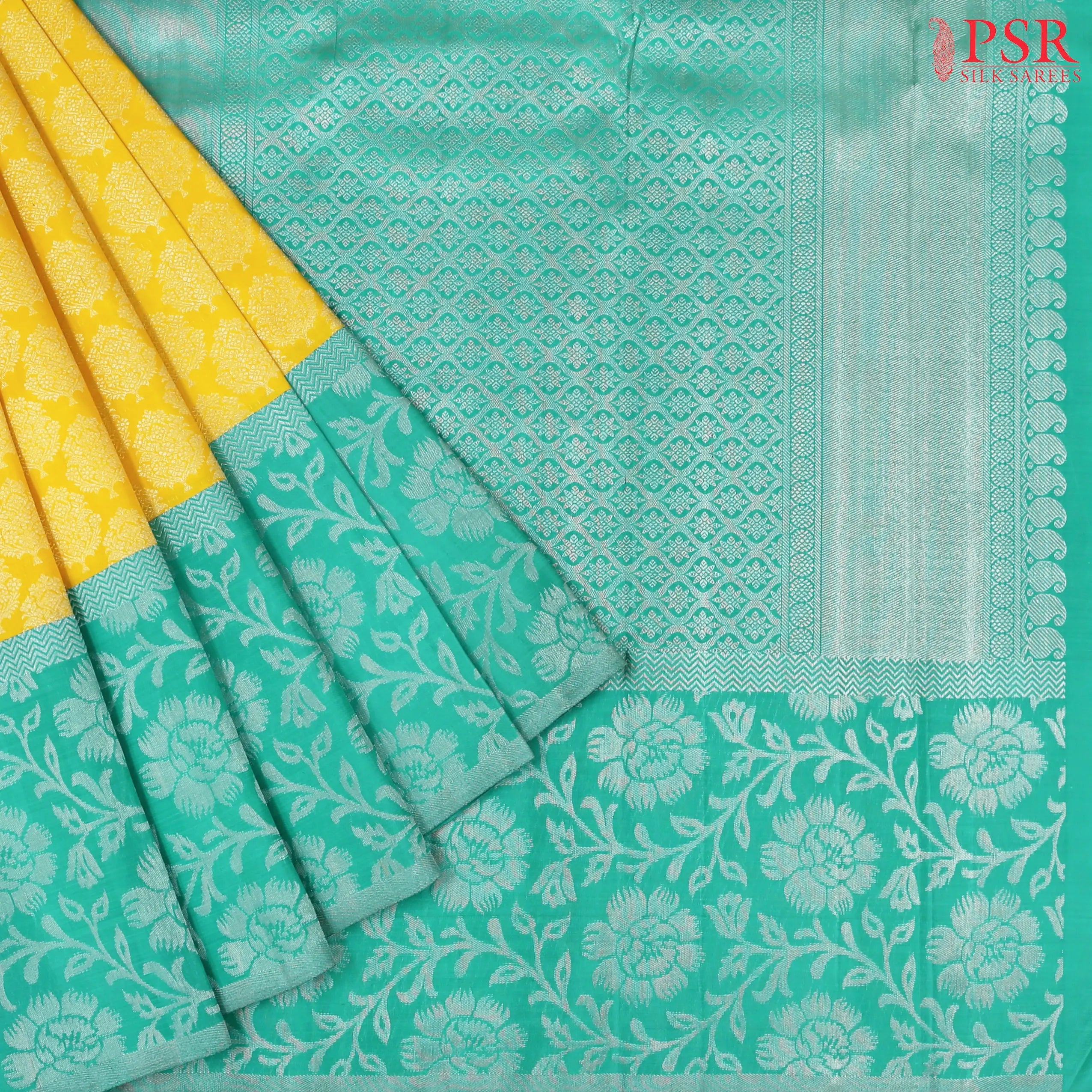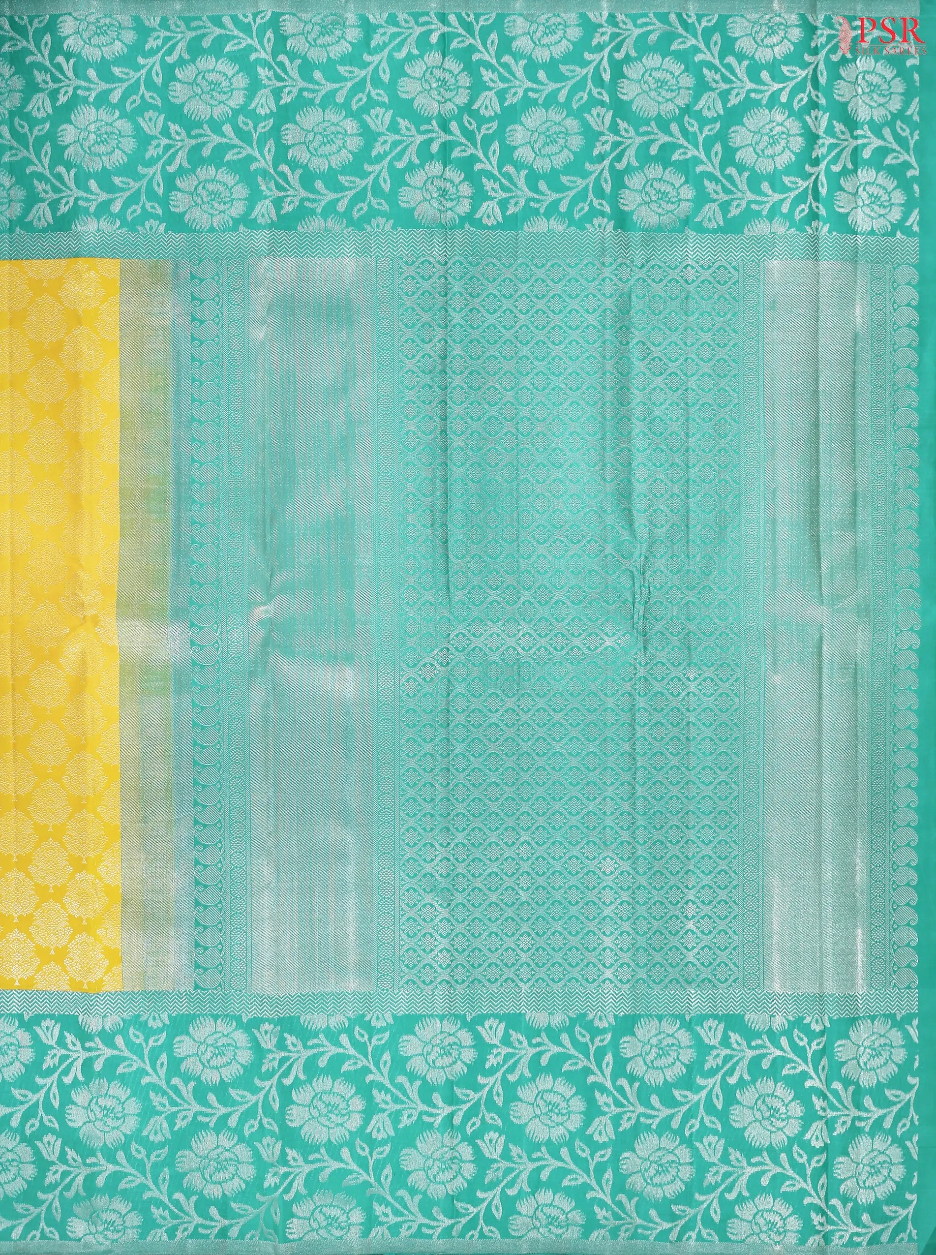 PSR Silk Sarees presents a radiant Canary Yellow Bridal Kanchipuram Silk Saree, paired with a graceful Sea Green contrast.