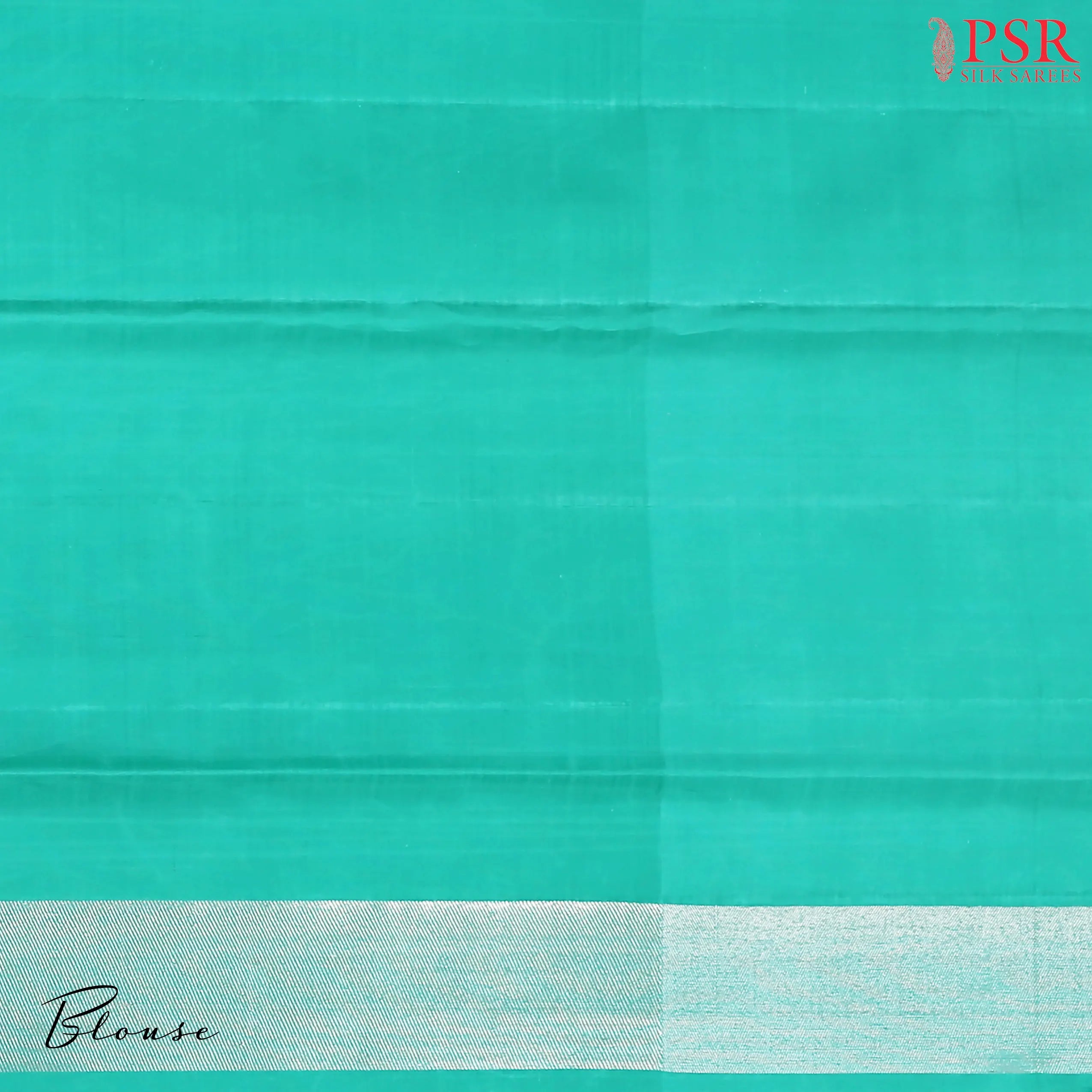 This exquisite saree features elegant silver zari floral brocade motifs all over, exuding a rich bridal charm. The look is beautifully enhanced with a Sea Green traditional korvai border and pallu, adorned with intricate silver zari work. A plain Sea Green blouse is attached, completing its regal appeal.