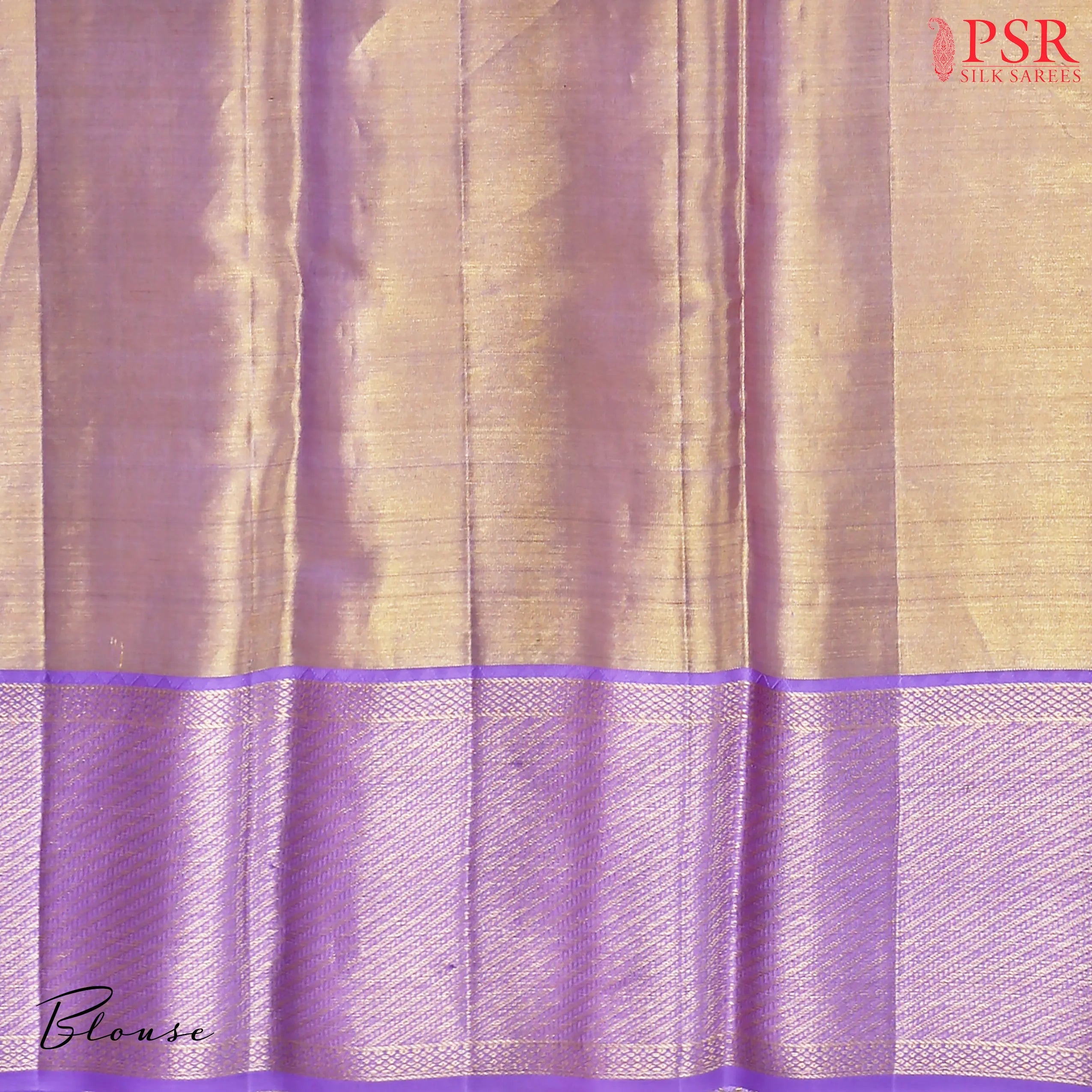 This exquisite drape features masterpiece jacquard weaves with a stunning, intricate pattern that elevates its grandeur. The saree is beautifully complemented by an Amethyst Purple rich and traditional zari work pallu and border, adding a luxurious touch to its overall appeal. It is paired with a plain Amethyst Purple tissue blouse, completing the ensemble with elegance.
