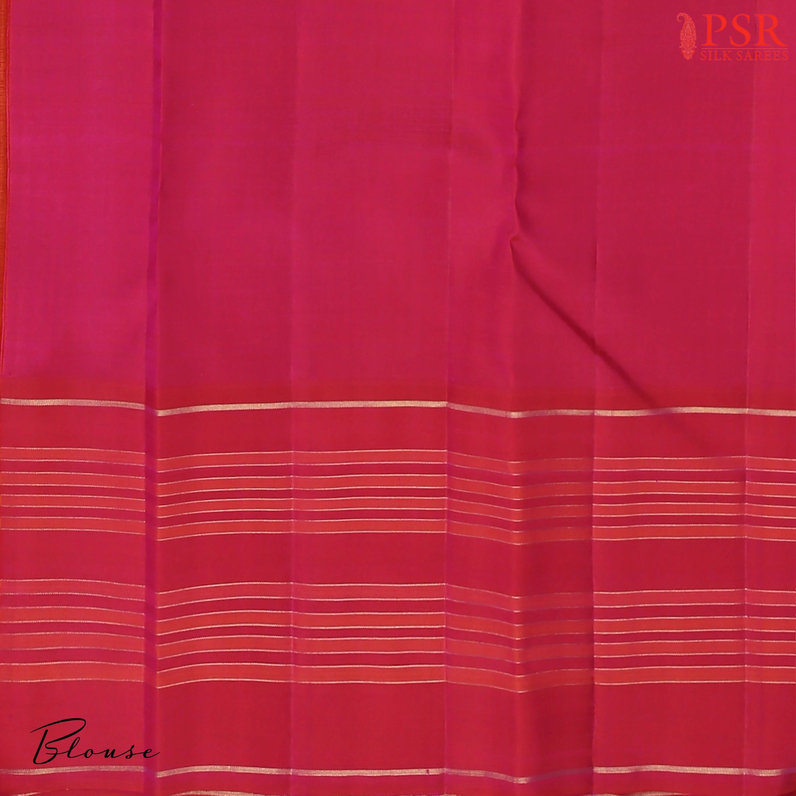 The rich Hot Pink pallu, adorned with traditional zari craftsmanship, and the classic Hot Pink korvai border bring out the regal essence of this masterpiece. It is perfectly paired with a plain Hot Pink blouse, making it an ideal choice for weddings, festive occasions, and graceful celebrations.