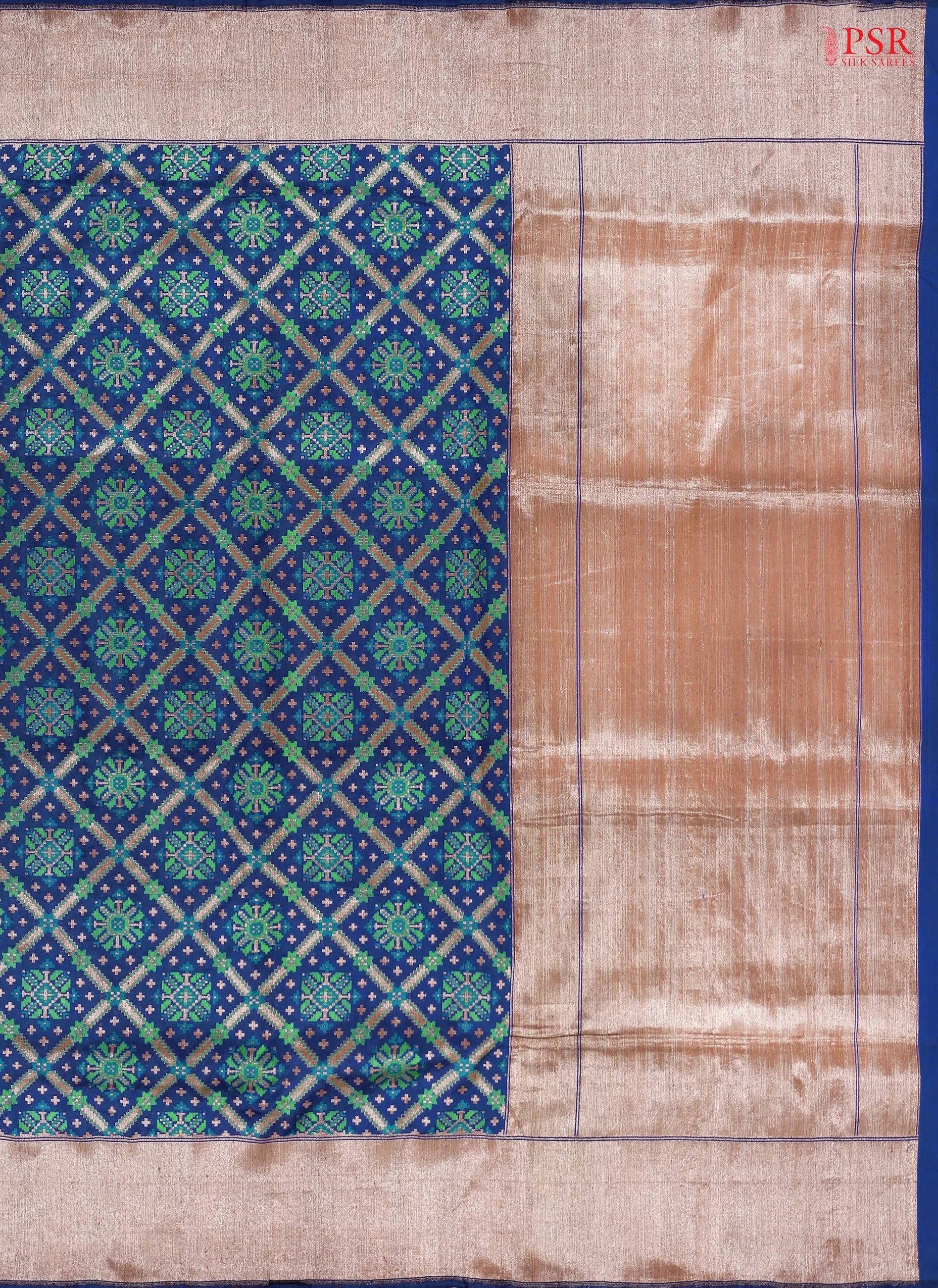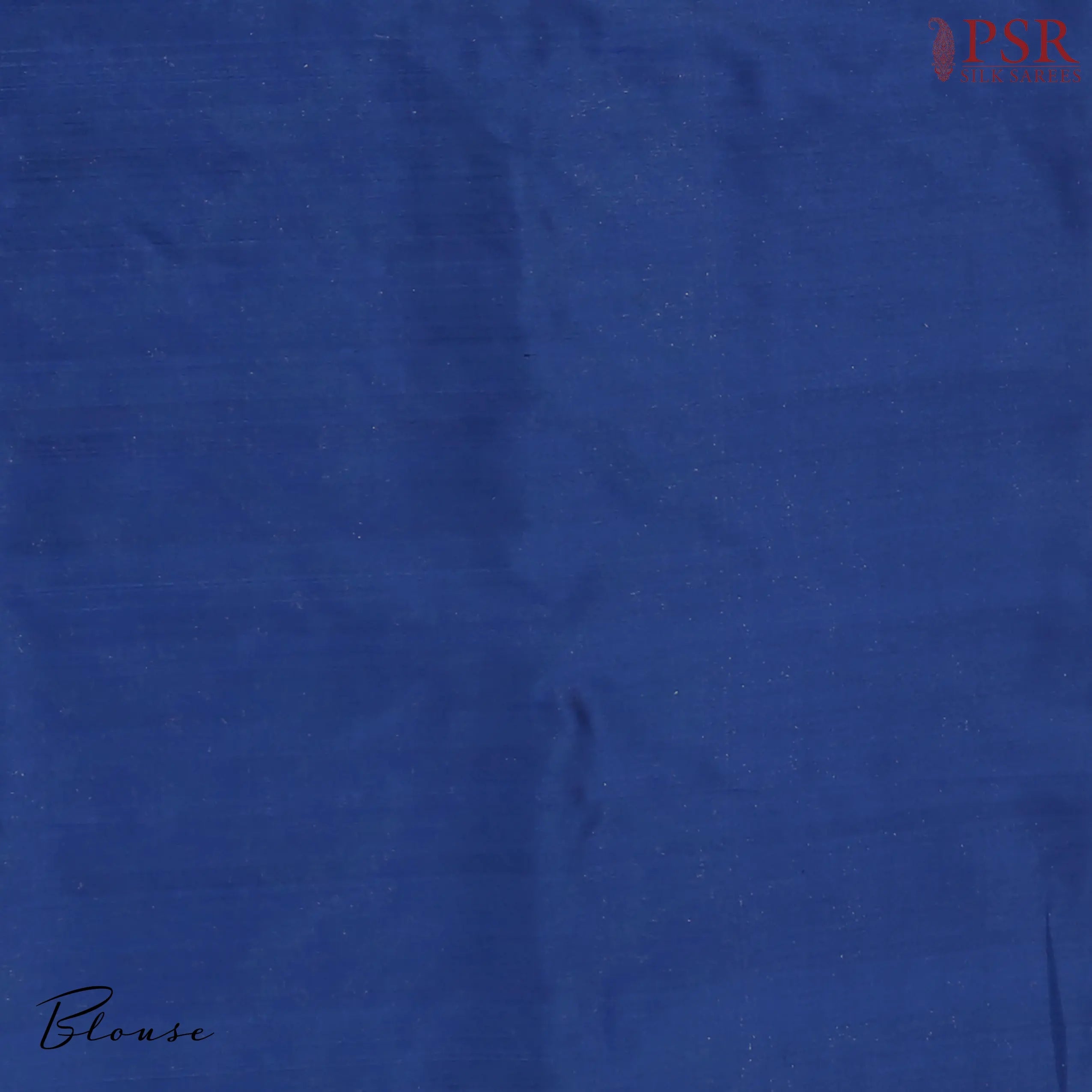 PSR Silks presents a stunning Dark Yale Blue Banarasi Silk saree, adorned with a masterfully woven zari lattice pattern enriched with vibrant thread work that adds depth and artistic brilliance.