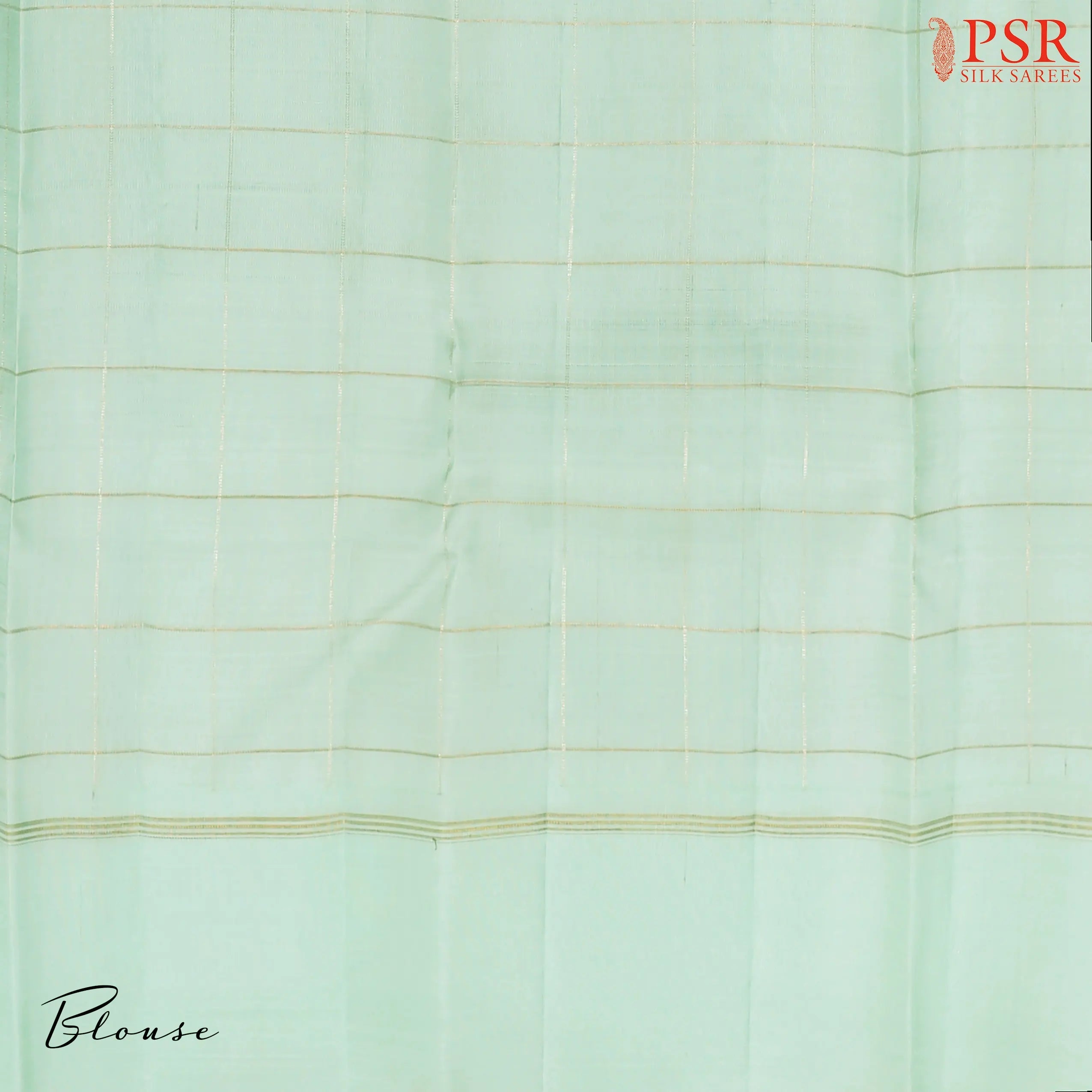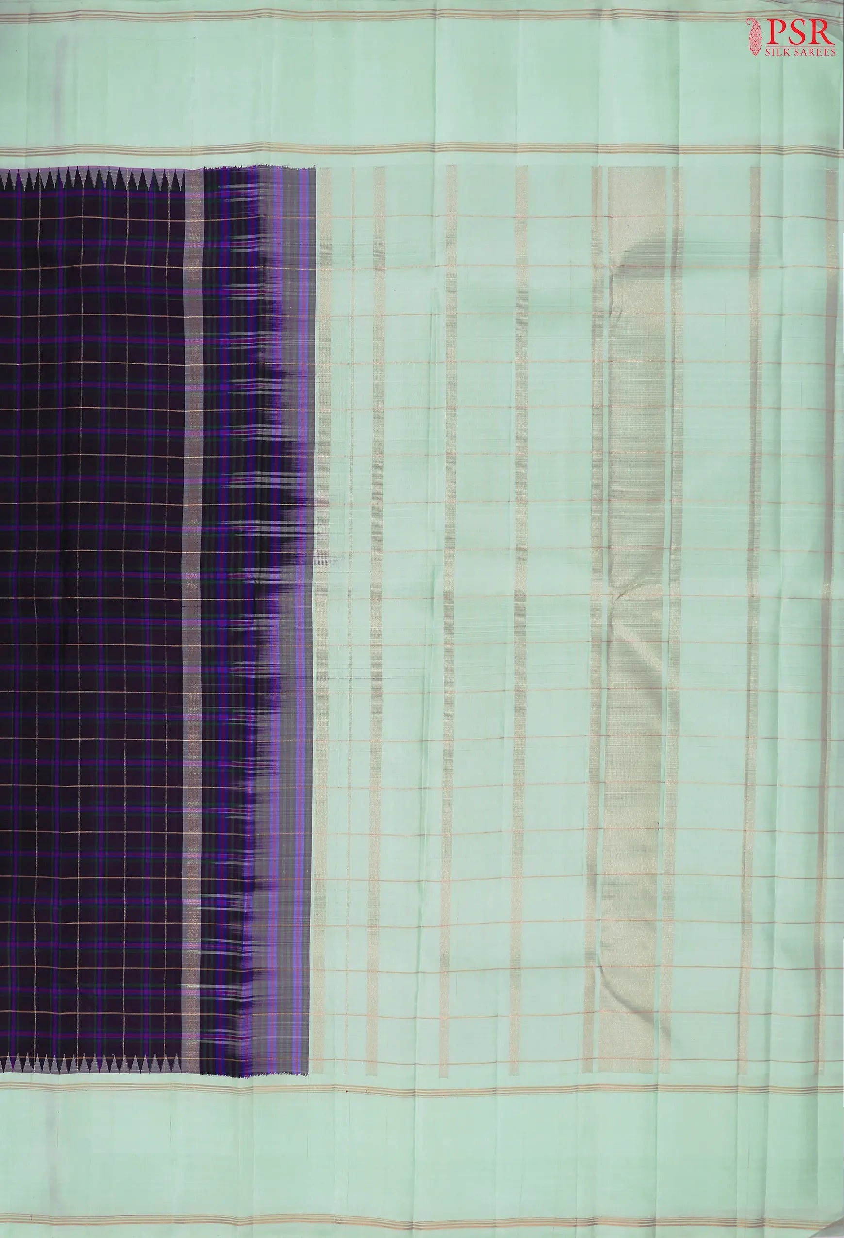 The saree features a classic colorful plaids pattern that adds richness and texture to its soft green base. The contrasting Mint Green traditional zari chit pallu and a finely crafted temple border exude timeless grandeur and skilled craftsmanship.