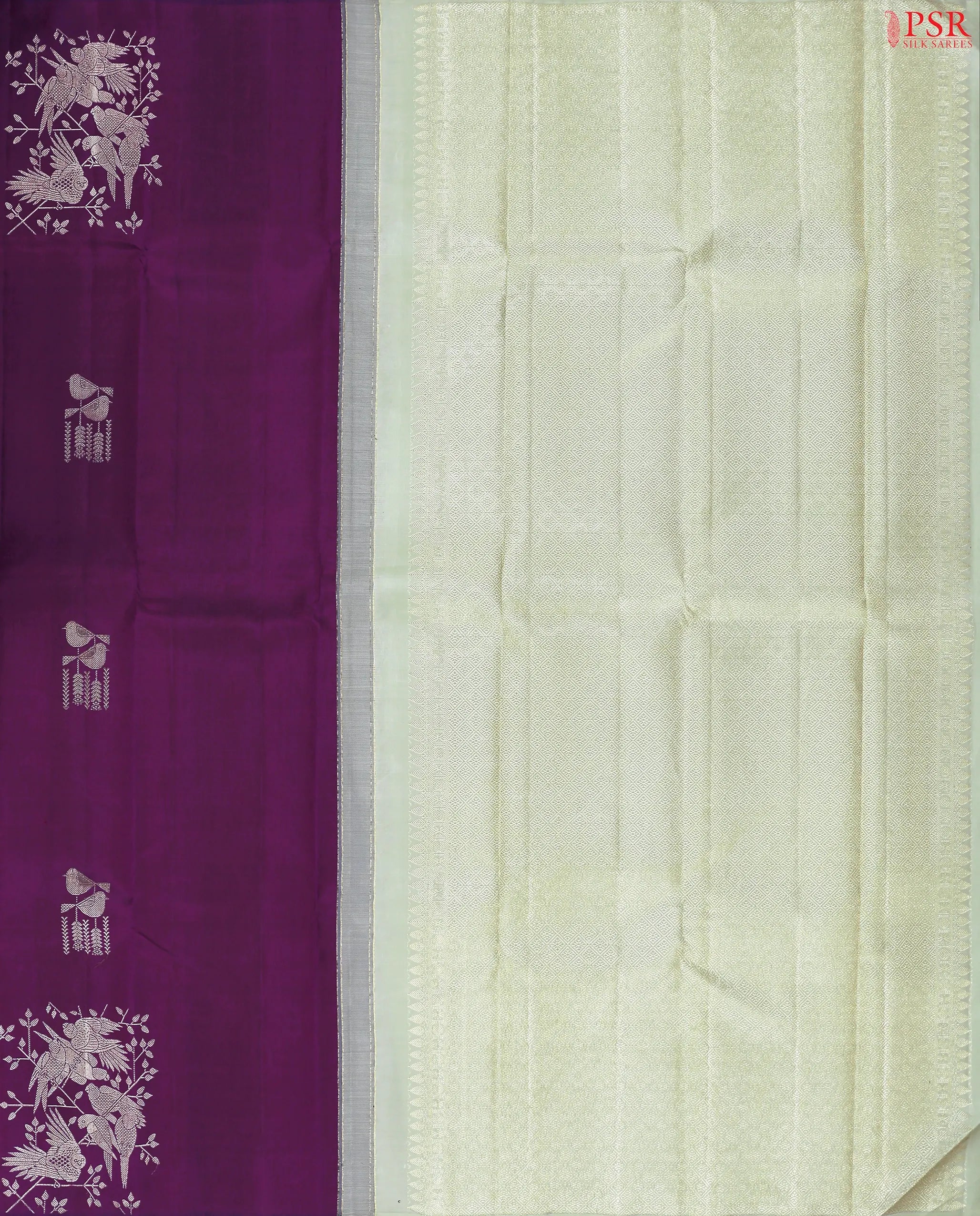 Add a touch of regal elegance to your wardrobe with our Dark Magneta Purple Kanchipuram Silk Saree. This stunning saree showcases exquisite floral & bird motifs. The saree is perfectly complemented by a Light Olive Green pallu, enriched with intricate traditional zari artistry with a big floral bird motifs in the border, and a contrasting Light Olive Green blouse for an effortlessly elegant look.